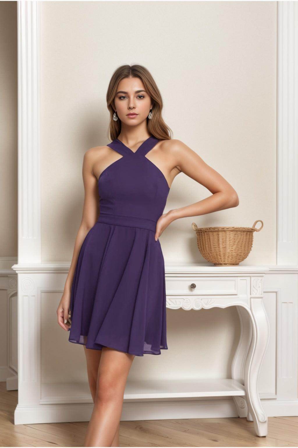 This A-line dress exudes effortless elegance with a halter neckline and sleeveless design, perfect for a chic look. Featuring a natural waistline and a short-mini length in chiffon, it offers both comfort and style. The back zipper ensures a secure fit, making it an ideal choice for various special occasions.