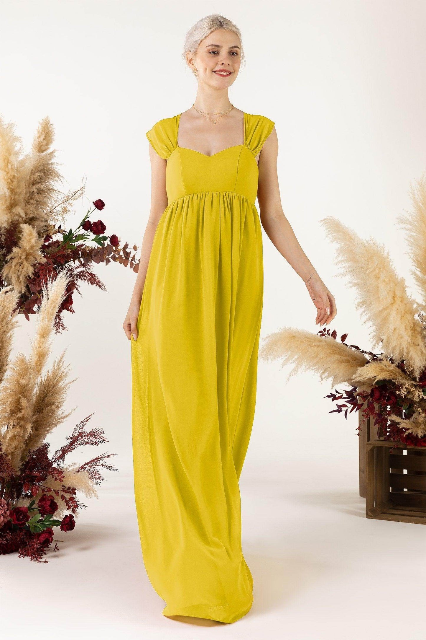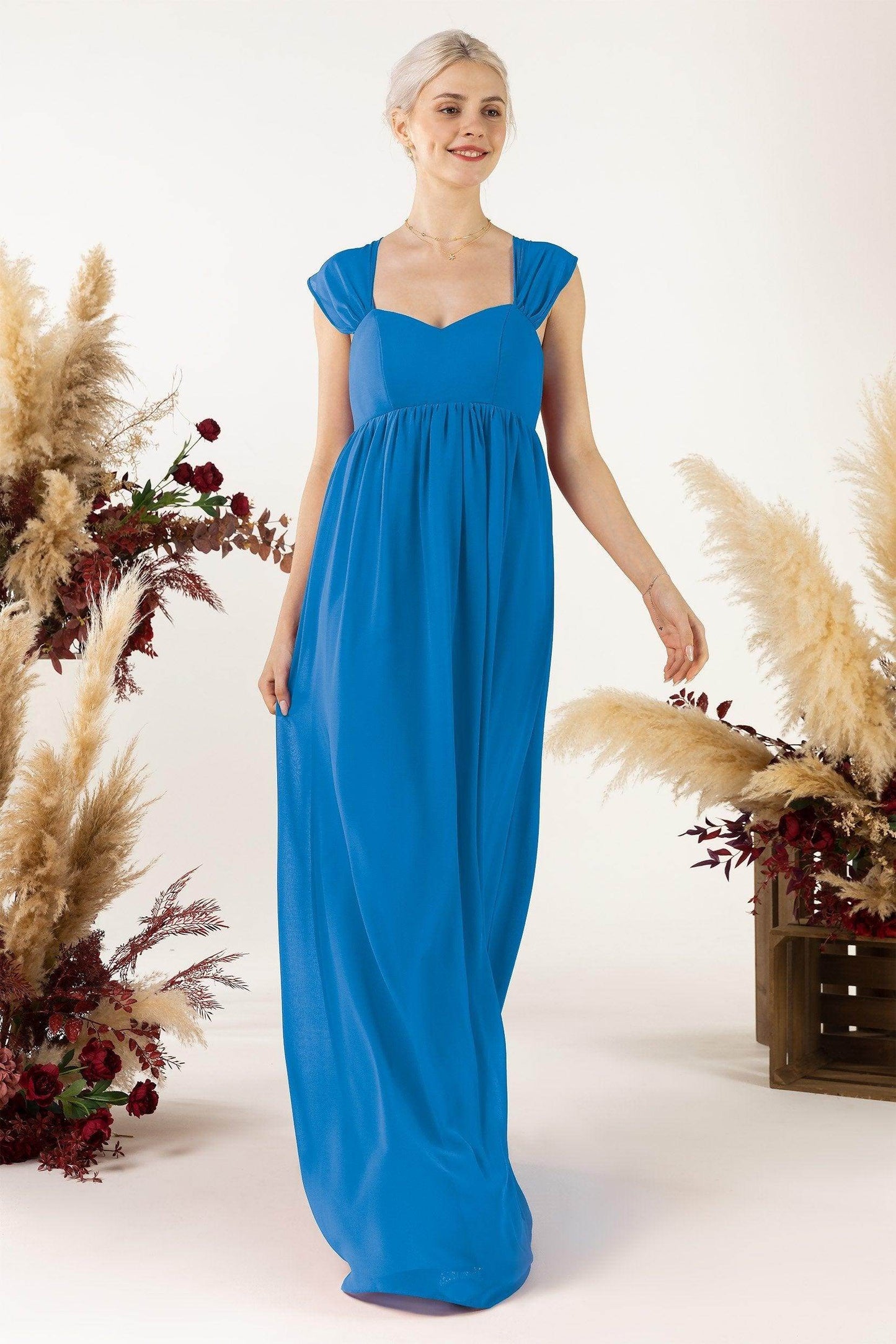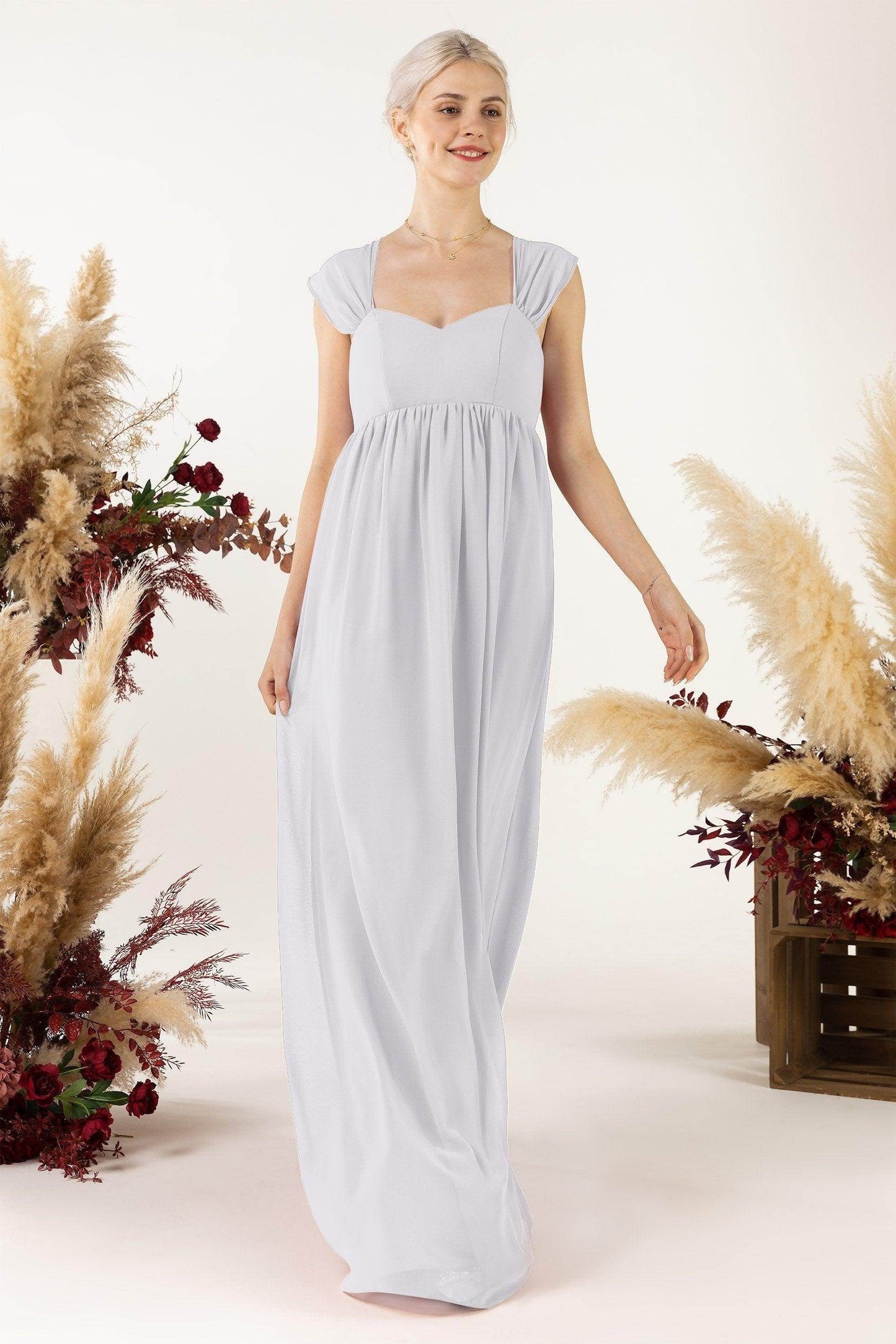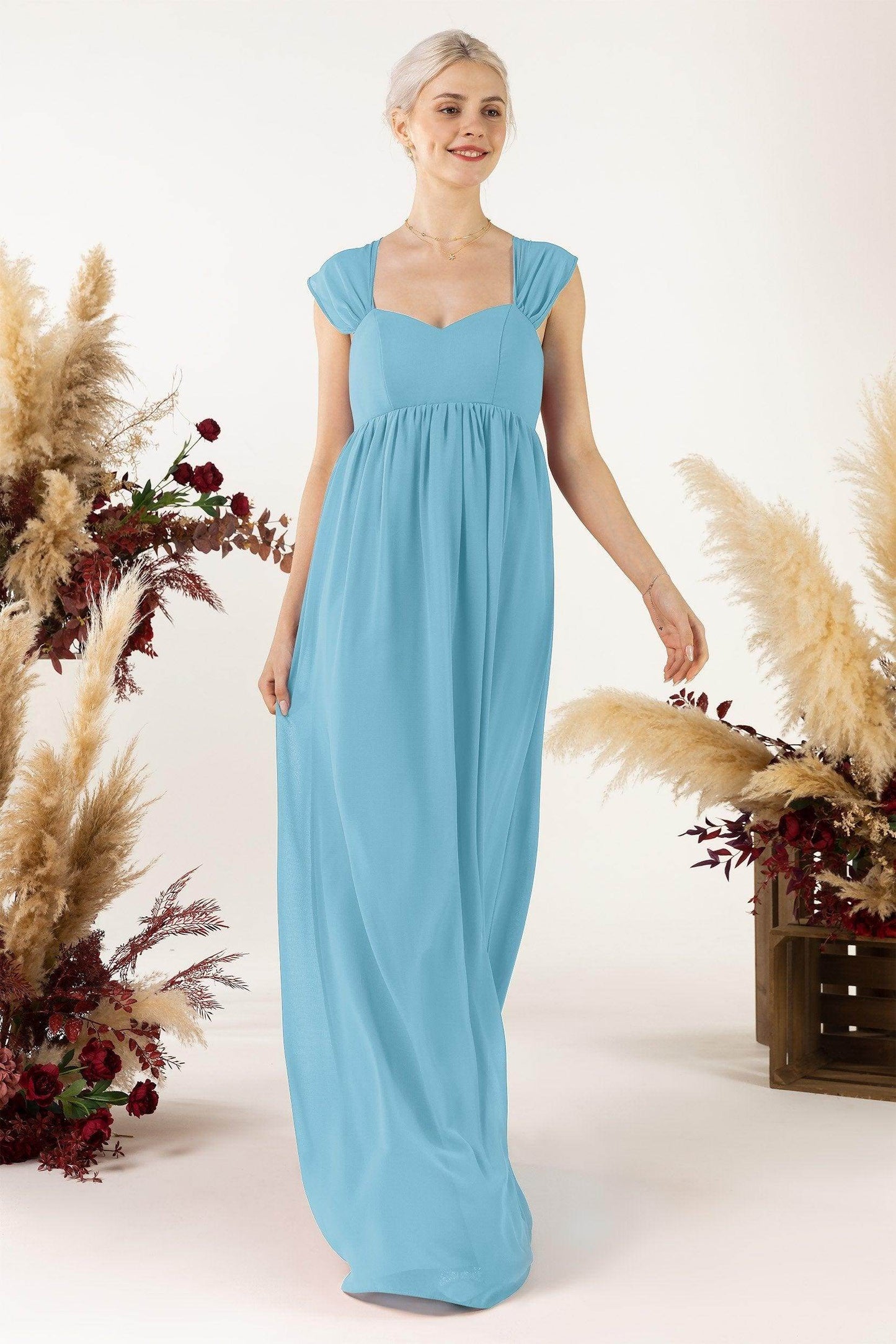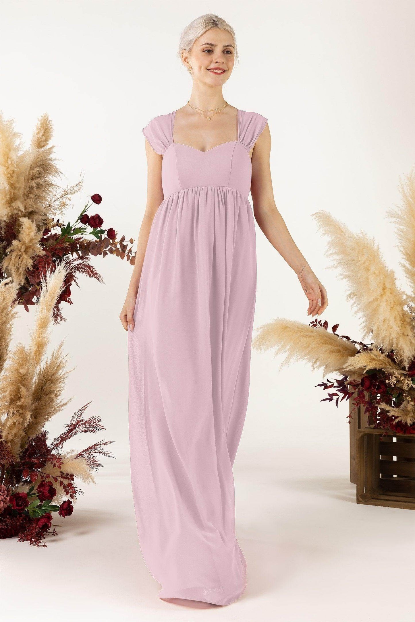 This bridesmaid dress blends elegance and practicality. The chiffon fabric shimmers, while the strapless neckline highlights the shoulders. The A-line skirt flows into a sweep train, with pleats and pockets adding detail. The empire waist and lace-up back ensure a flattering, adjustable fit.
