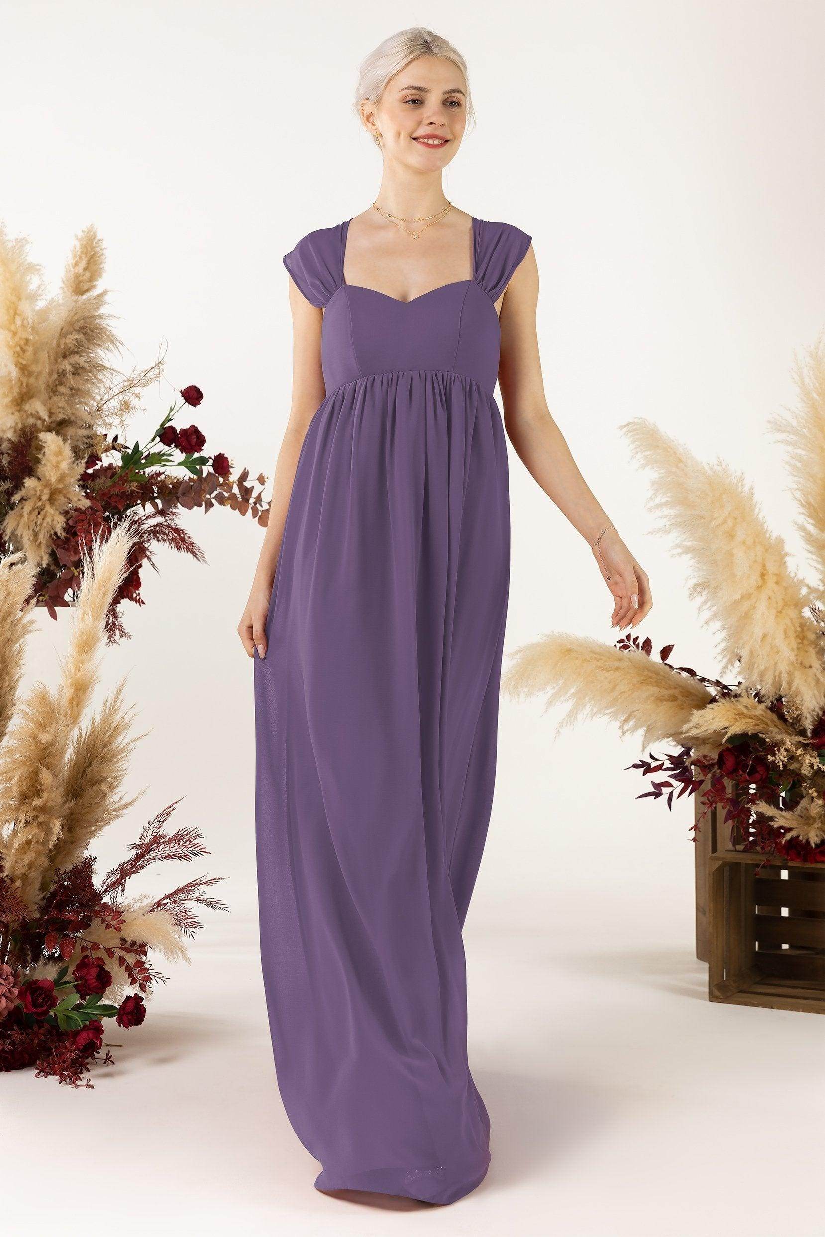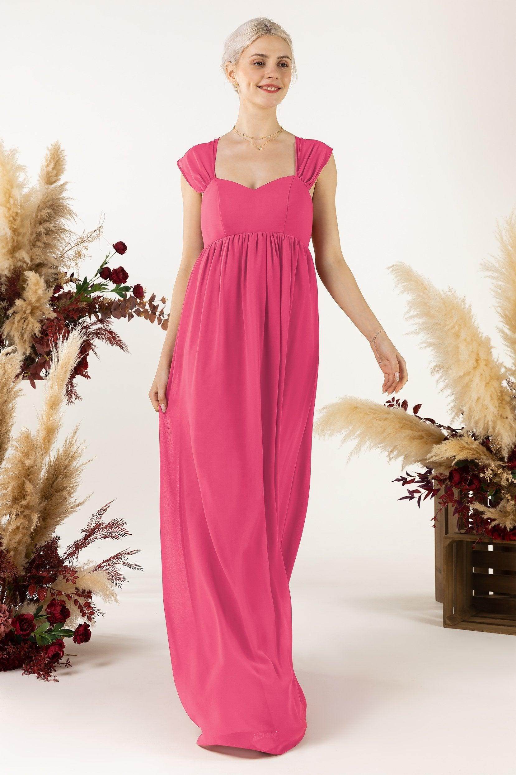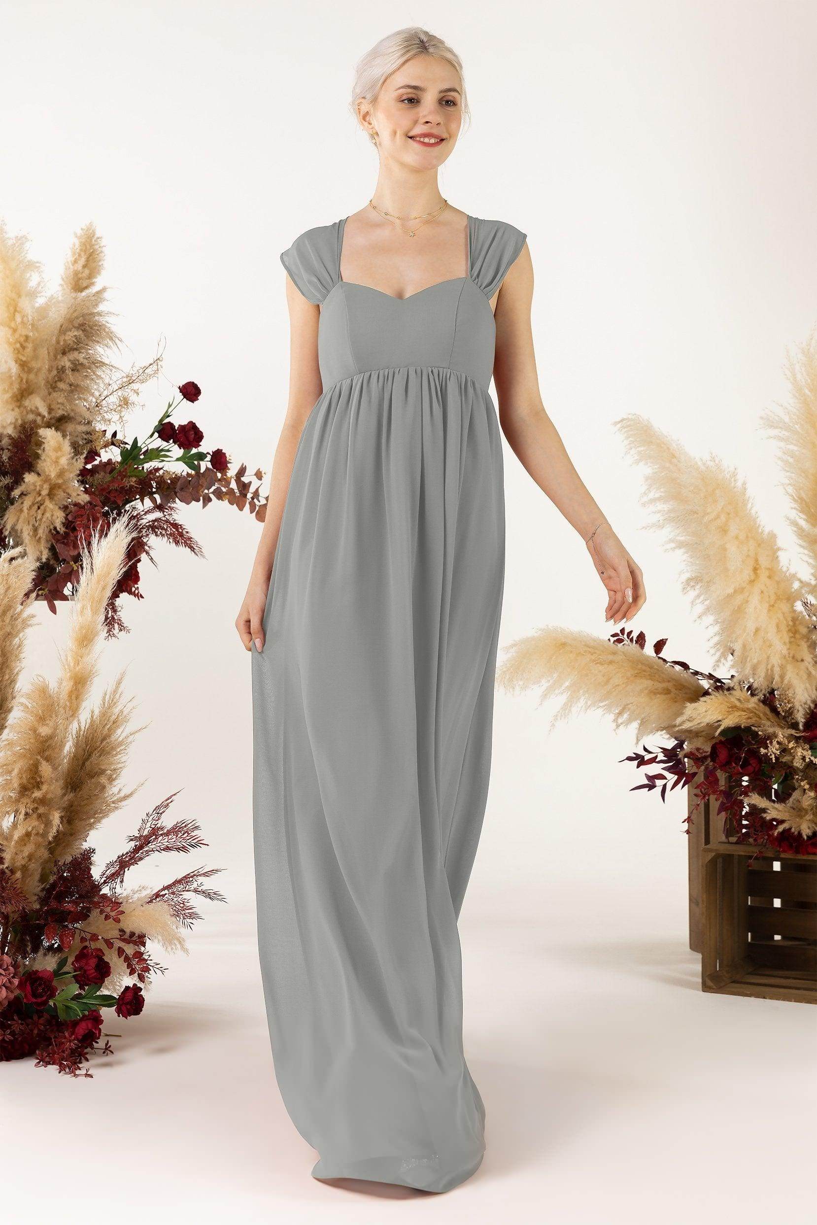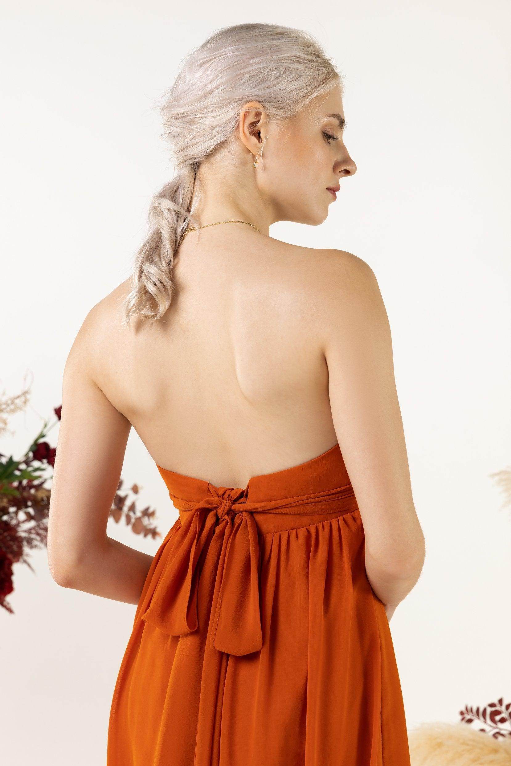 This bridesmaid dress blends elegance and practicality. The chiffon fabric shimmers, while the strapless neckline highlights the shoulders. The A-line skirt flows into a sweep train, with pleats and pockets adding detail. The empire waist and lace-up back ensure a flattering, adjustable fit.
