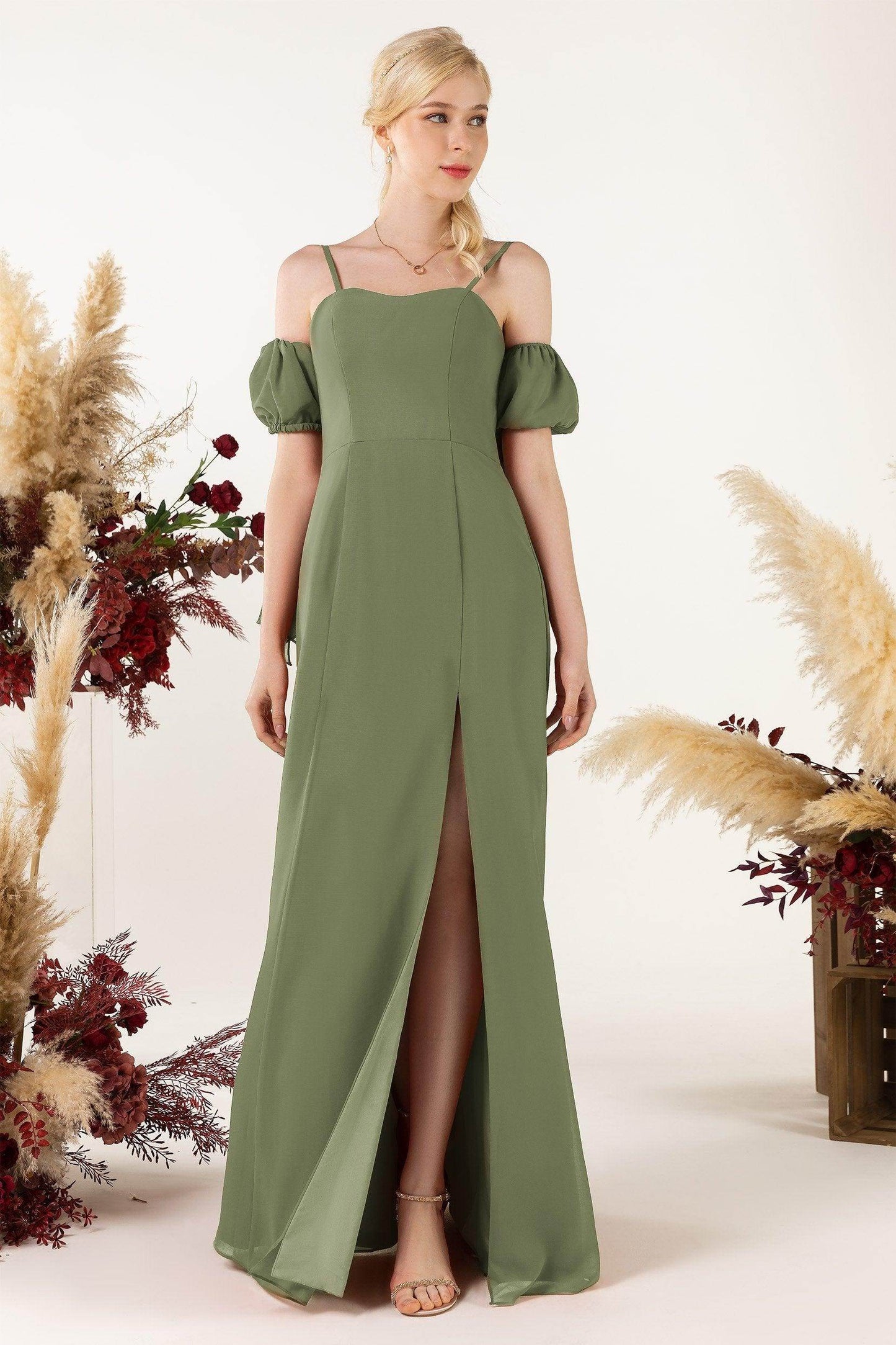 This bridesmaid dress merges elegance with lightness. Soft chiffon fabric glows subtly, while spaghetti straps and sleeveless design enhance comfort.The A-line skirt extends to a sweep train, gracefully shaping the figure. The natural waist defines the waist elegantly, and the back zipper ensures a flawless fit.