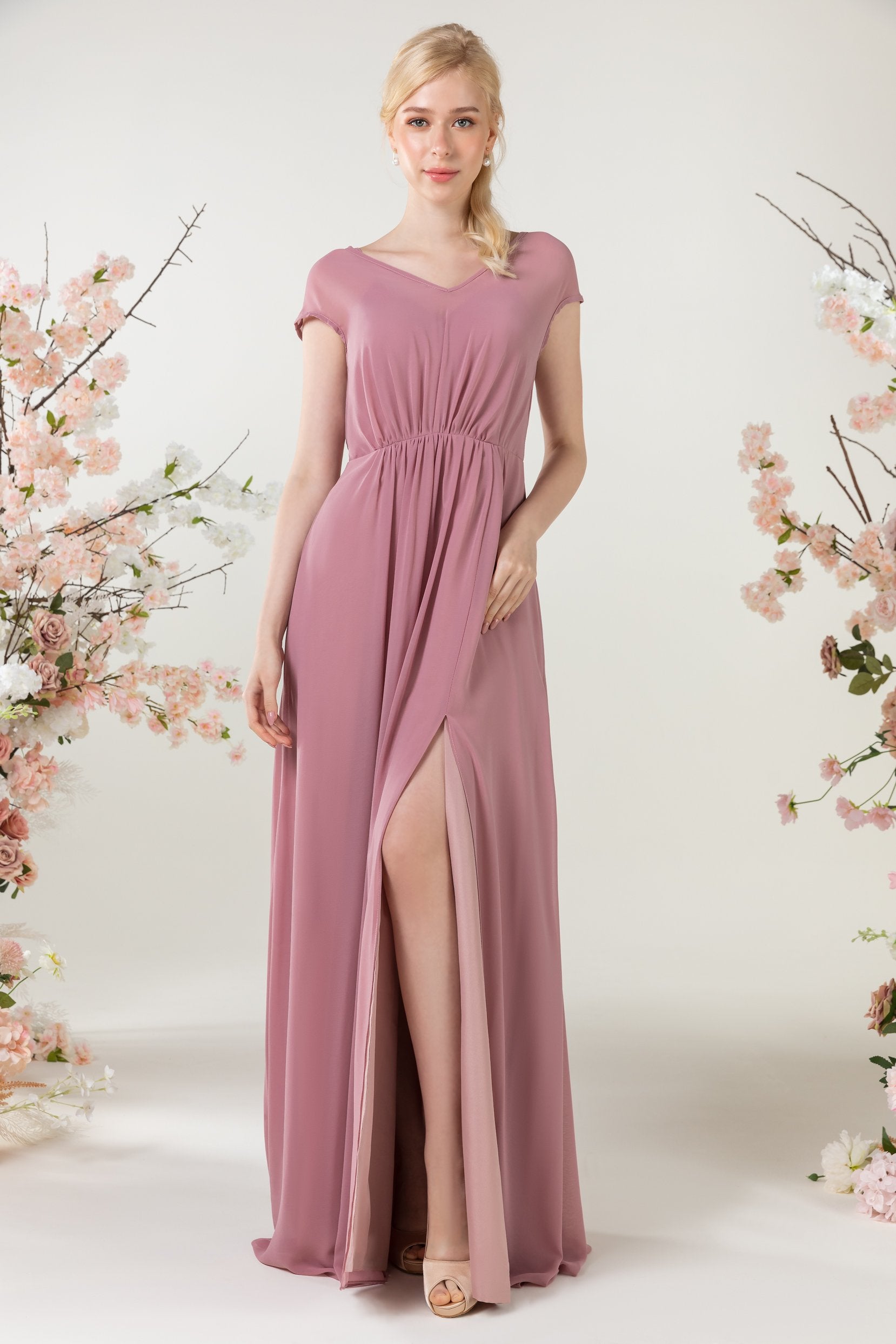 This bridesmaid dress blends modern elegance with practicality. The V-neck and A-line silhouette, paired with soft chiffon and a sweep brush train, create graceful movement. Pleating and a chic cap sleeve add sophistication, while functional pockets and a natural waistline enhance both style and comfort.