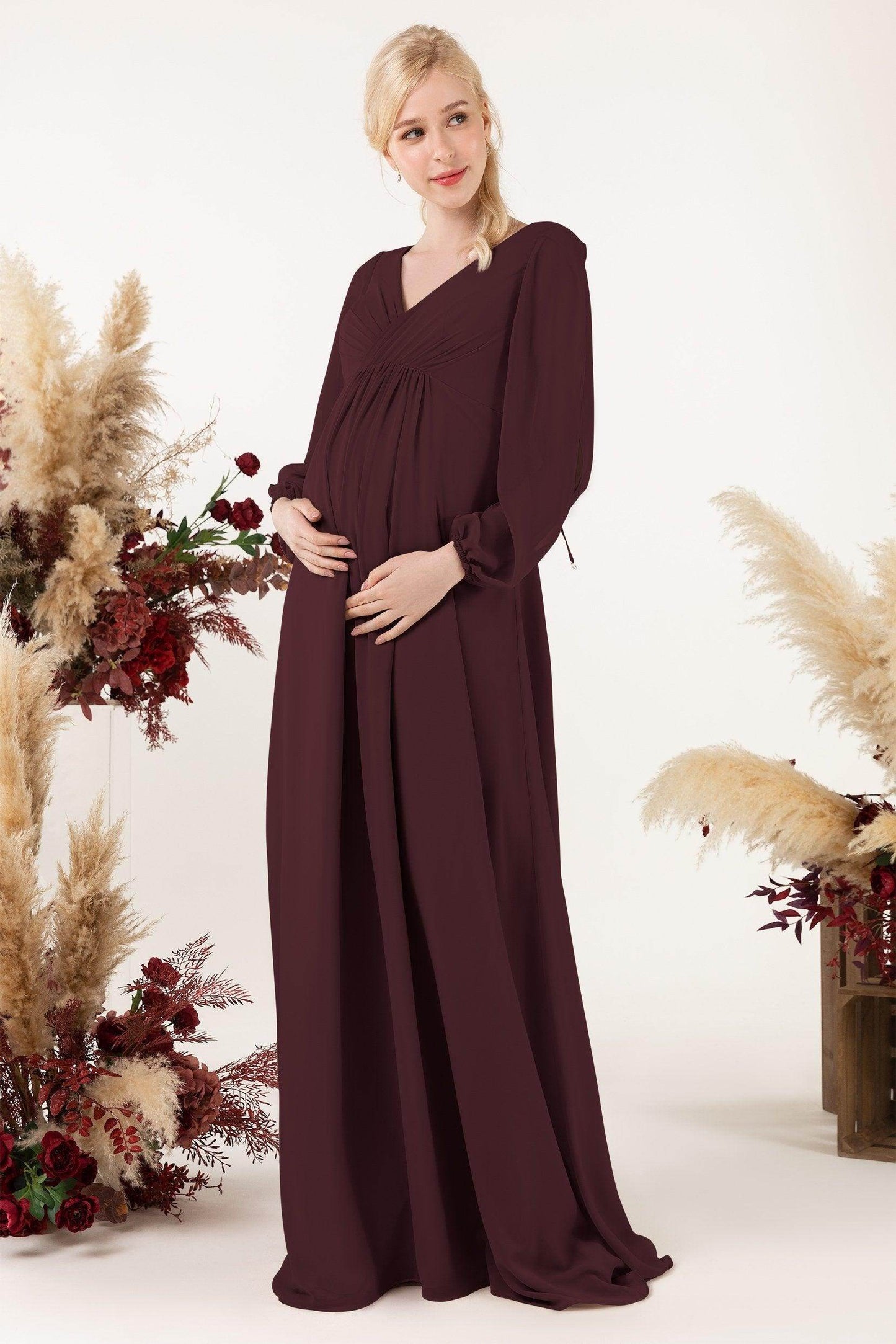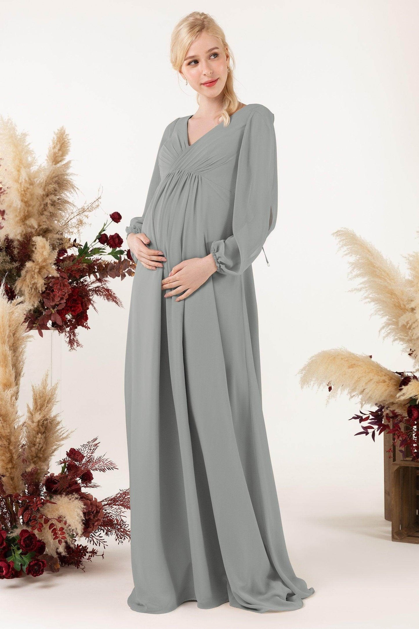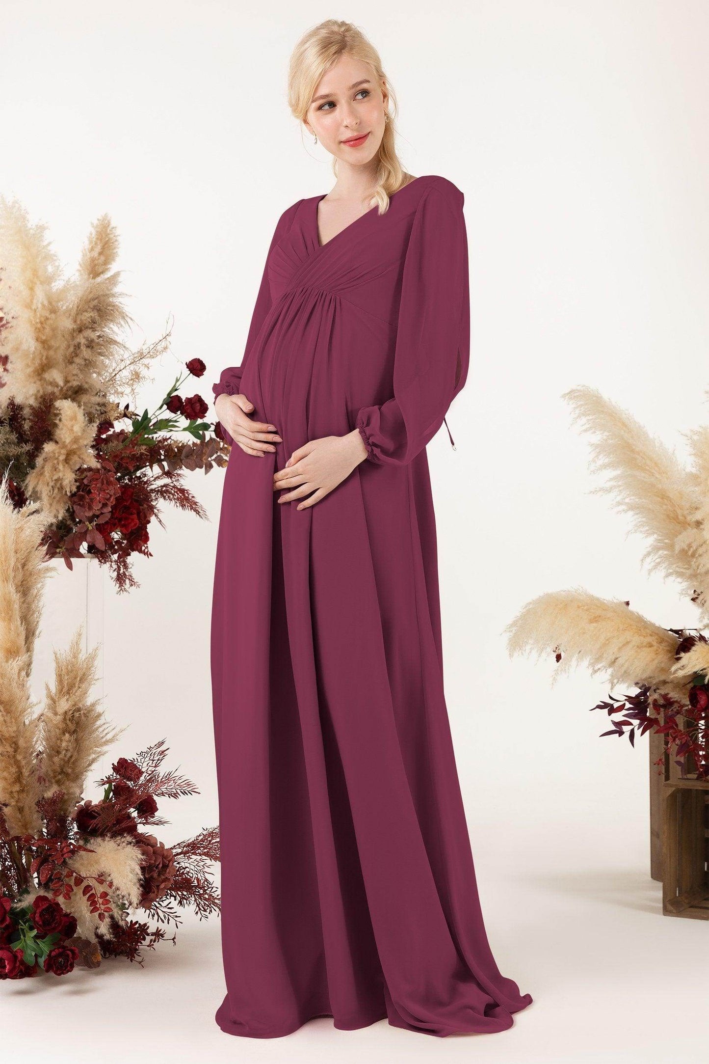 This bridesmaid dress features a simple back zipper and delicate pleats with chic split.Crafted from lightweight chiffon,it flows beautifully,while the enchanting V-neck and long sleeves add sophistication.The empire waist highlights the waistline,ensuring every bridesmaid radiates unmatched elegance on the special day