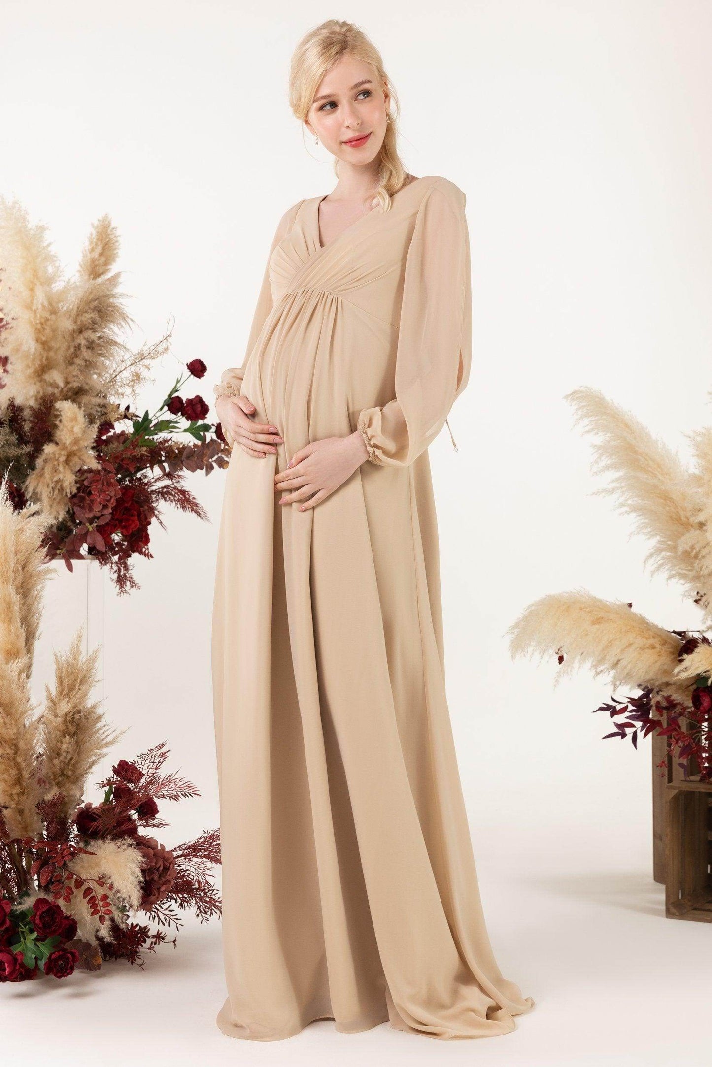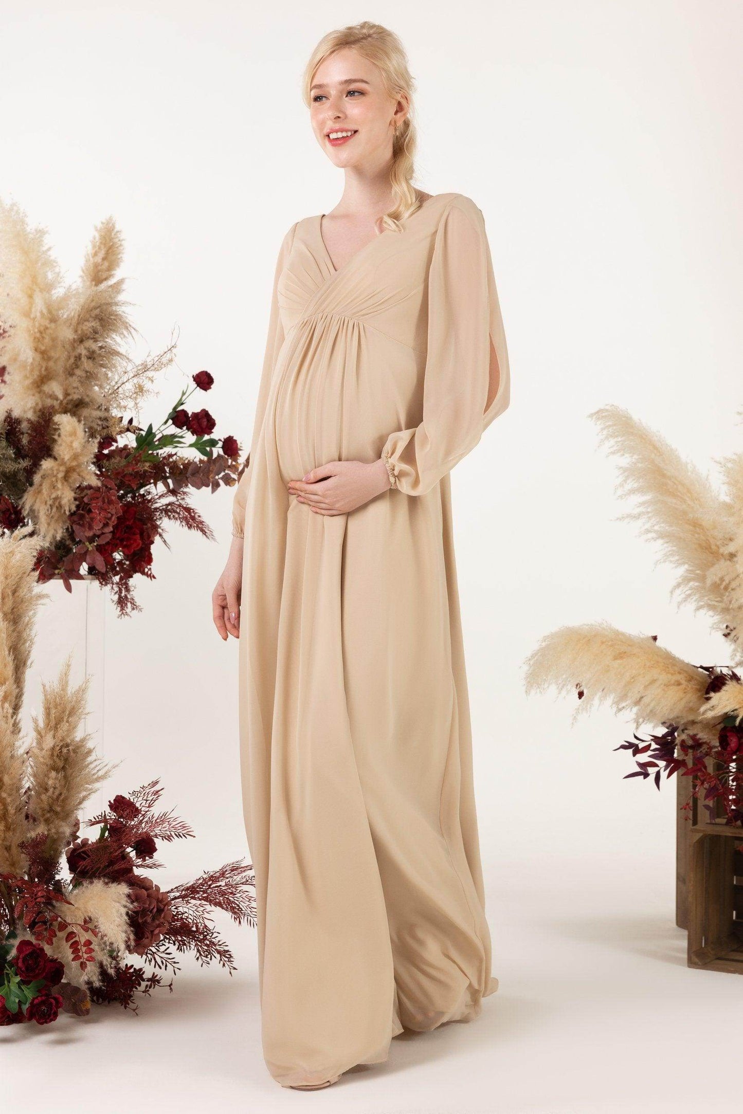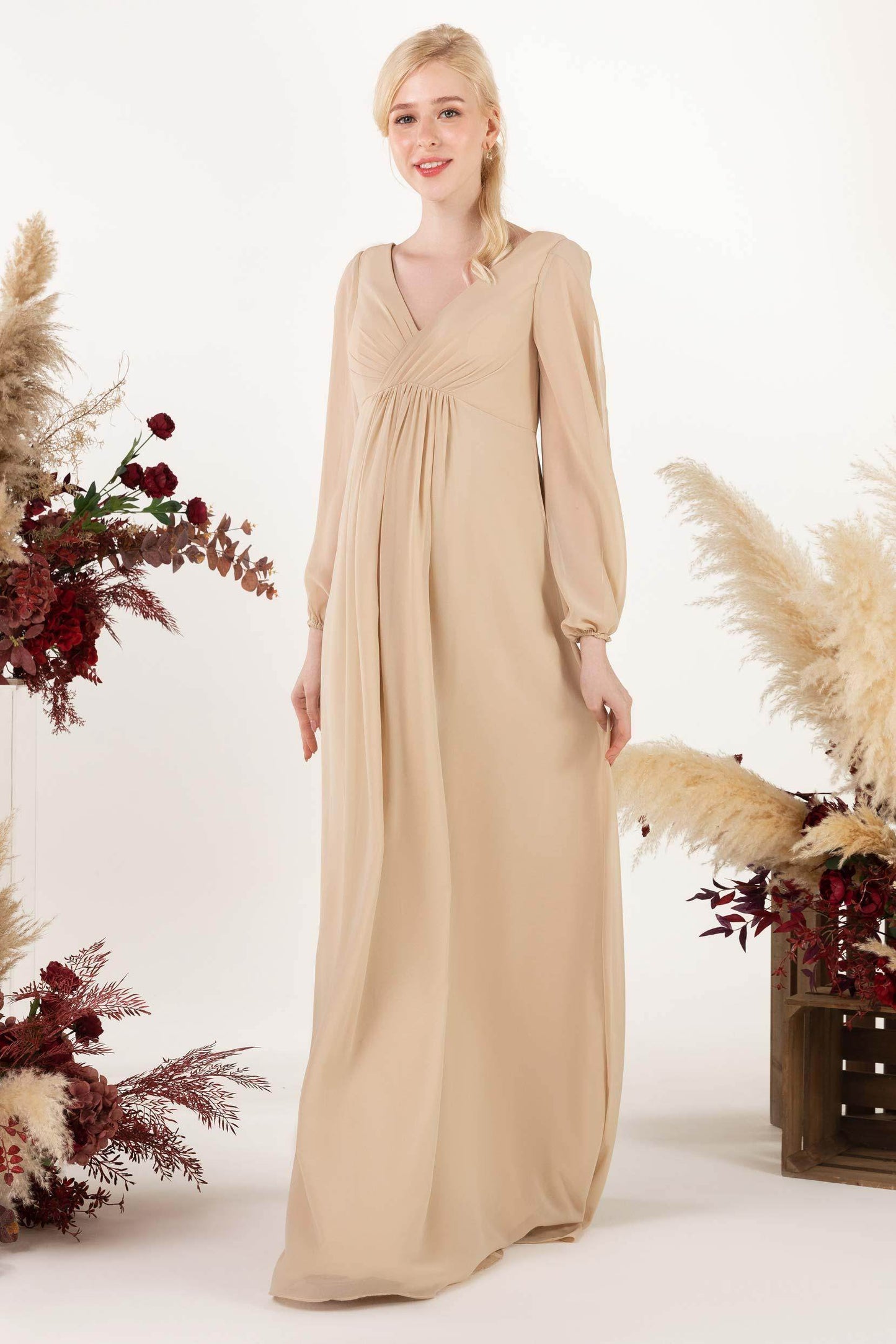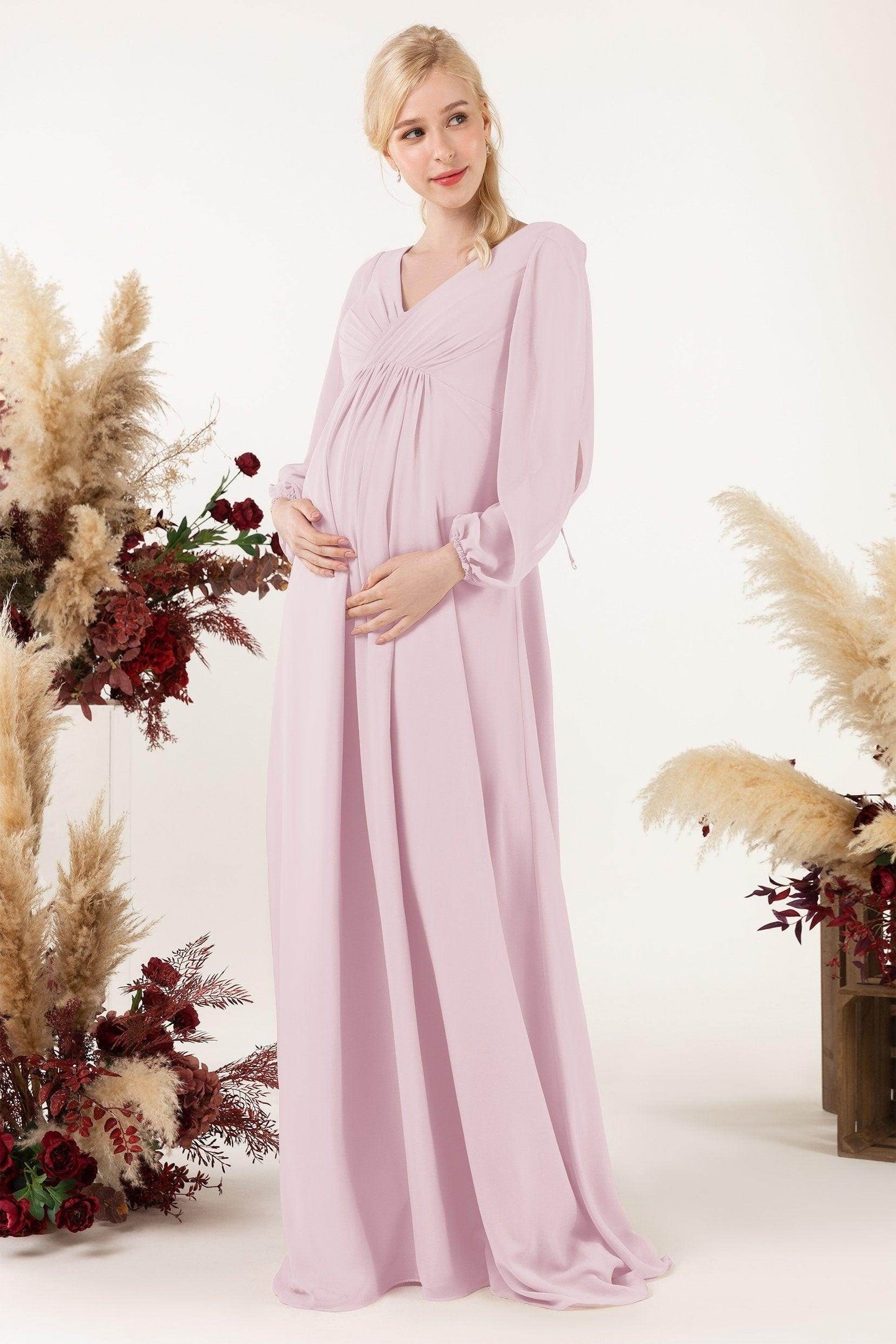 This bridesmaid dress features a simple back zipper and delicate pleats with chic split.Crafted from lightweight chiffon,it flows beautifully,while the enchanting V-neck and long sleeves add sophistication.The empire waist highlights the waistline,ensuring every bridesmaid radiates unmatched elegance on the special day