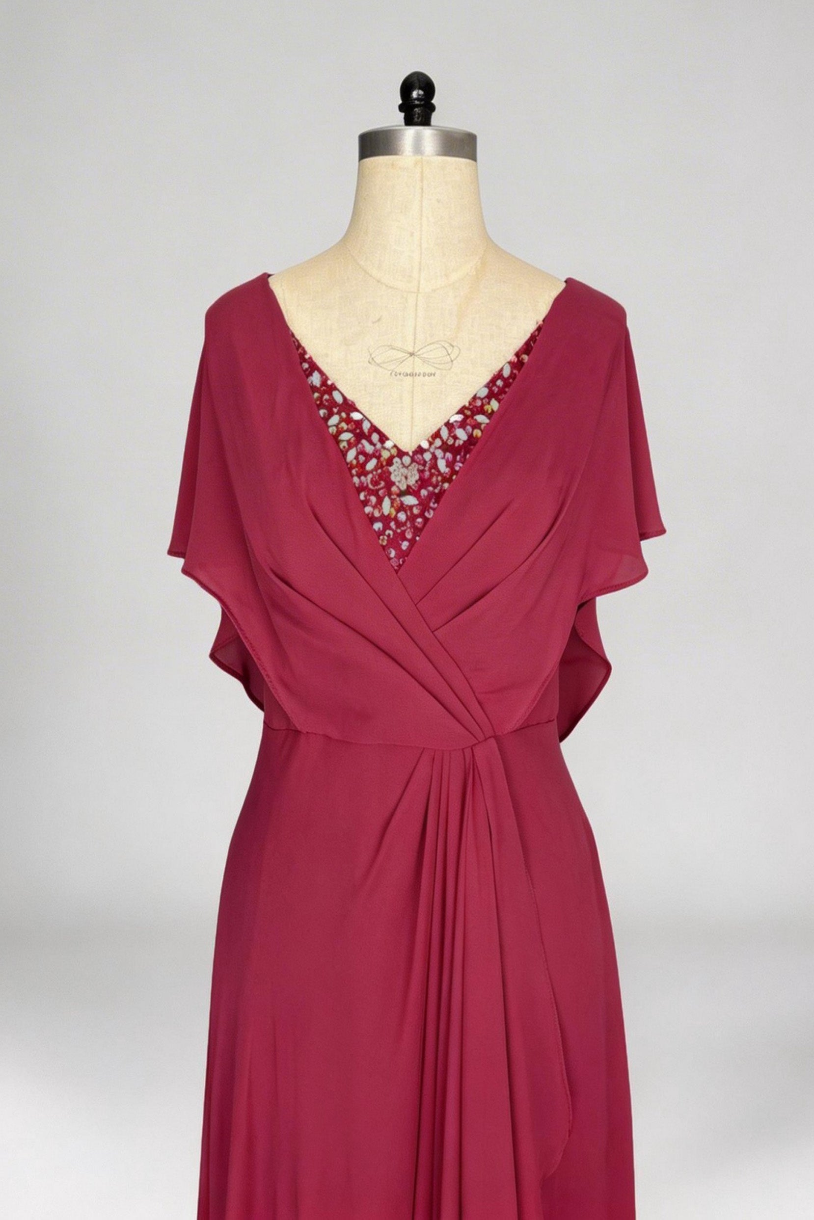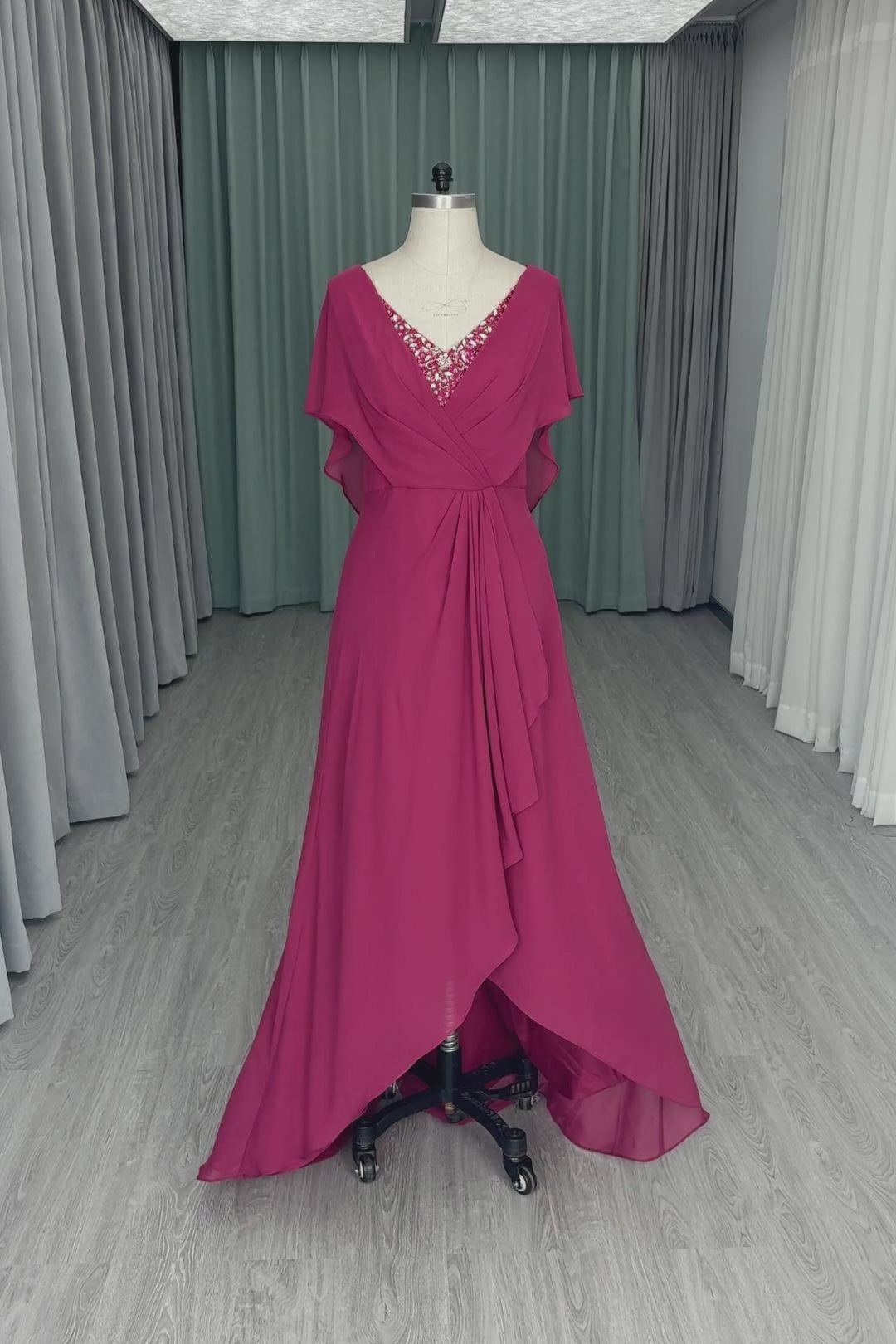 Effortless elegance defines this A-line chiffon mother of the bride gown, designed for a graceful wedding guest look. Featuring an asymmetrical neckline and soft ruffle detailing, it creates a flowing, feminine silhouette. Lightweight chiffon enhances movement, while short sleeves add gentle coverage. Perfect for wedding celebrations, formal receptions, or special occasions.