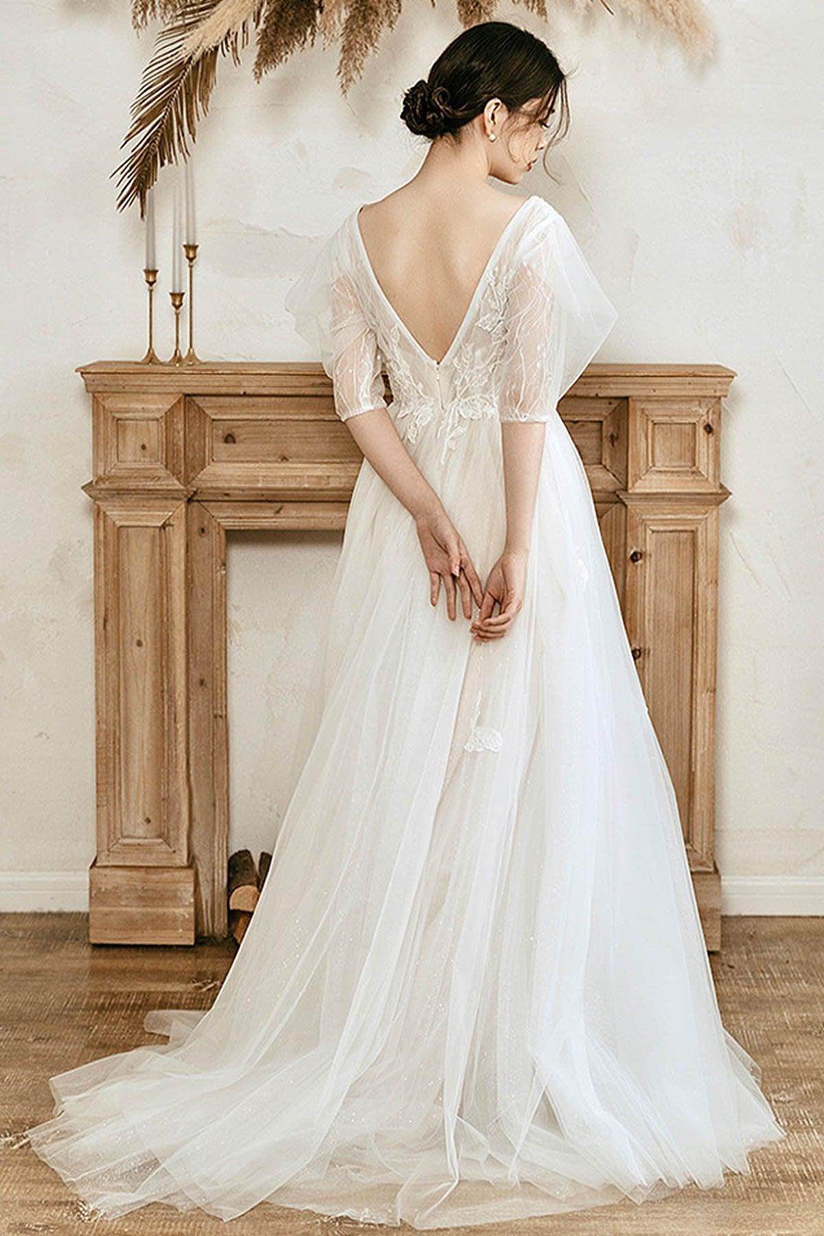 A-Line Sweep-Brush Train Lace Tulle Wedding Dress CW3061