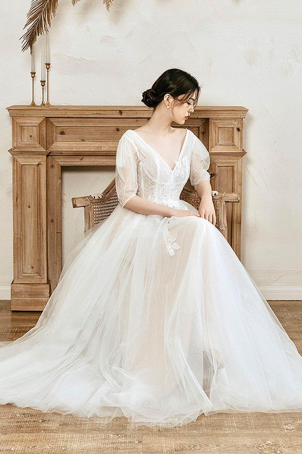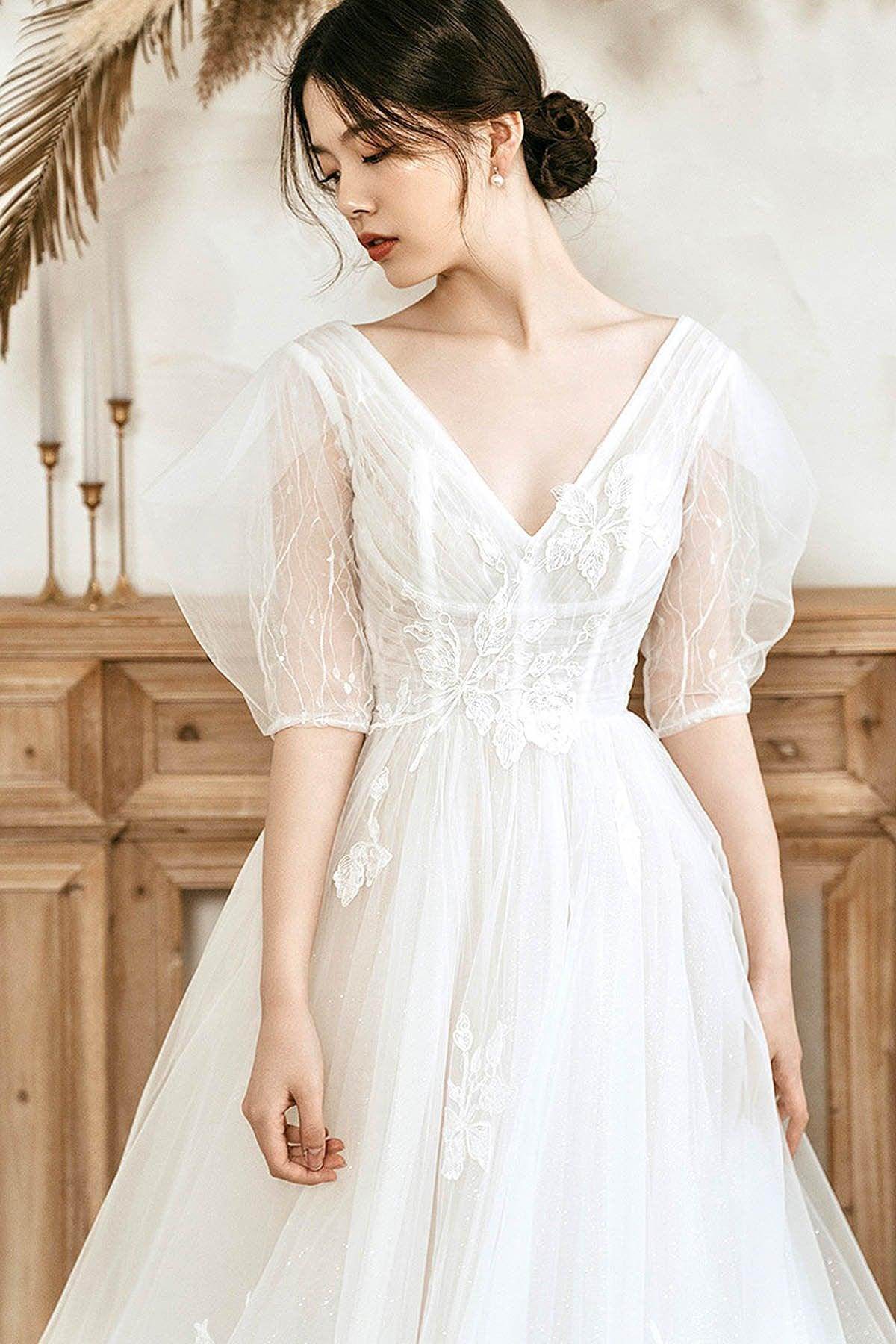 Introducing the SAANVI wedding dress: a captivating ivory A-line design adorned with delicate beading and chic puff sleeves. Perfect for hotel, church, beach, or hall weddings—simple yet stunning, and customizable for every bride!