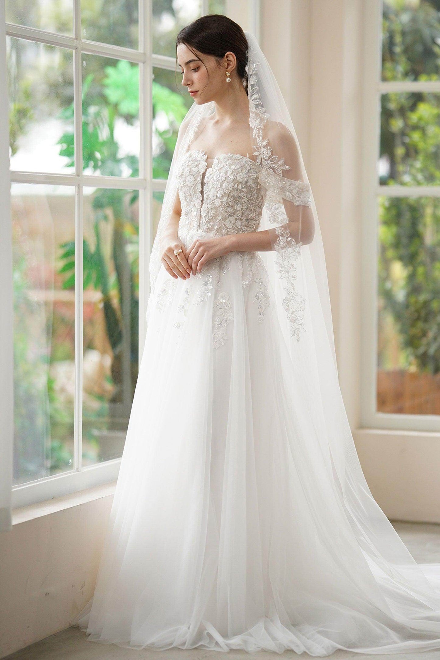 A-Line Sweep-Brush Train Lace Tulle Wedding Dress CW3314