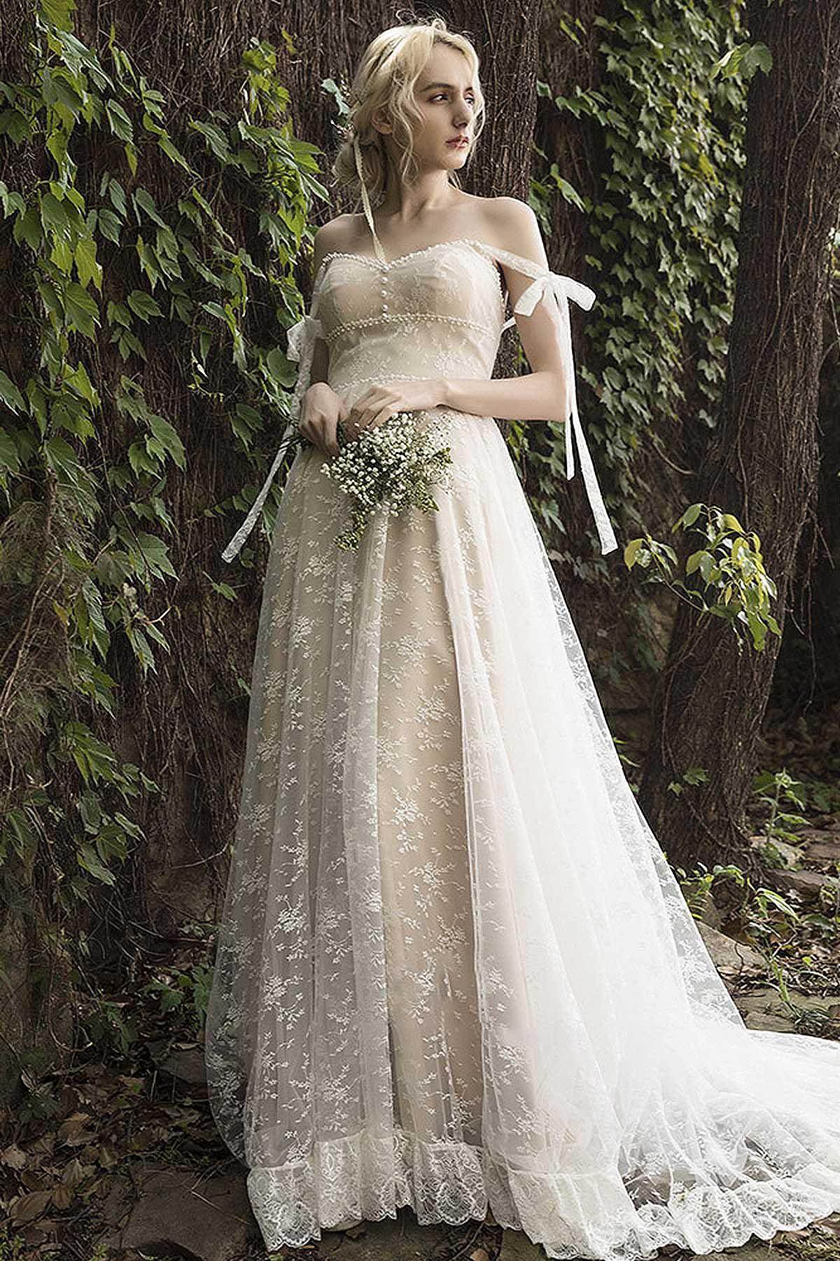 Introducing the NATALEE wedding dress—an enchanting A-line gown in ivory/nude, featuring elegant lace details and shimmering beading. Its off-the-shoulder design makes it perfect for any setting, from beach to hall. Customize your dream dress today!