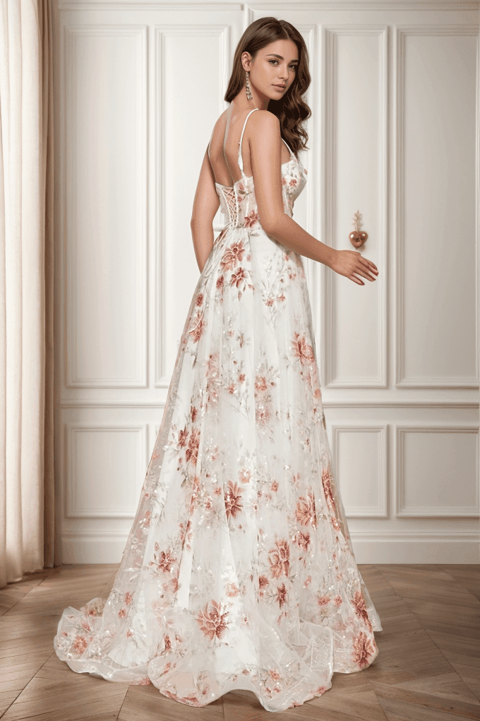 Introducing our versatile new Prom dress! A-Line silhouette with Straps neckline and Sleeveless design, perfect for any occasion. Featuring a Lace Up-Corset back, Print fabric, and a charming Split embellishment, exuding elegance with its Sweep-Brush Train length.