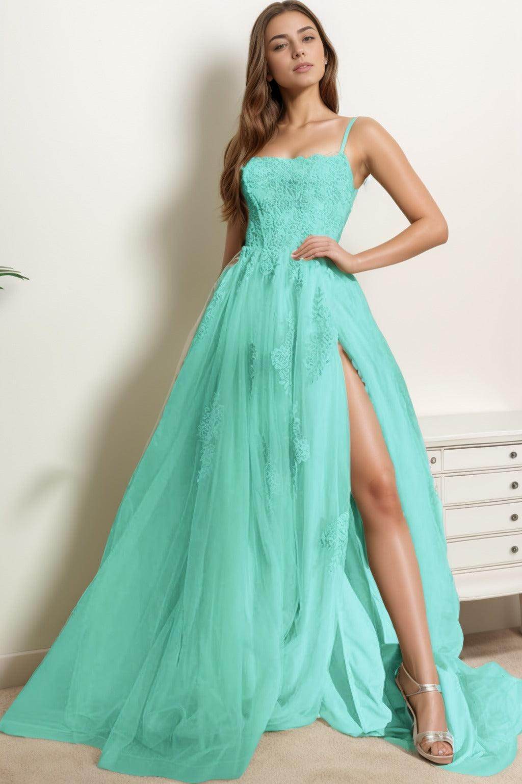 Introducing our stunning A-Line Sweep Champagne Prom Dress. It's all grace, with tiny spaghetti straps and a nice natural waist. With its sophisticated split ornamentation and breathtaking silhouette created by the crisscross back elements and tulle fabric, it's ideal for special occasions.