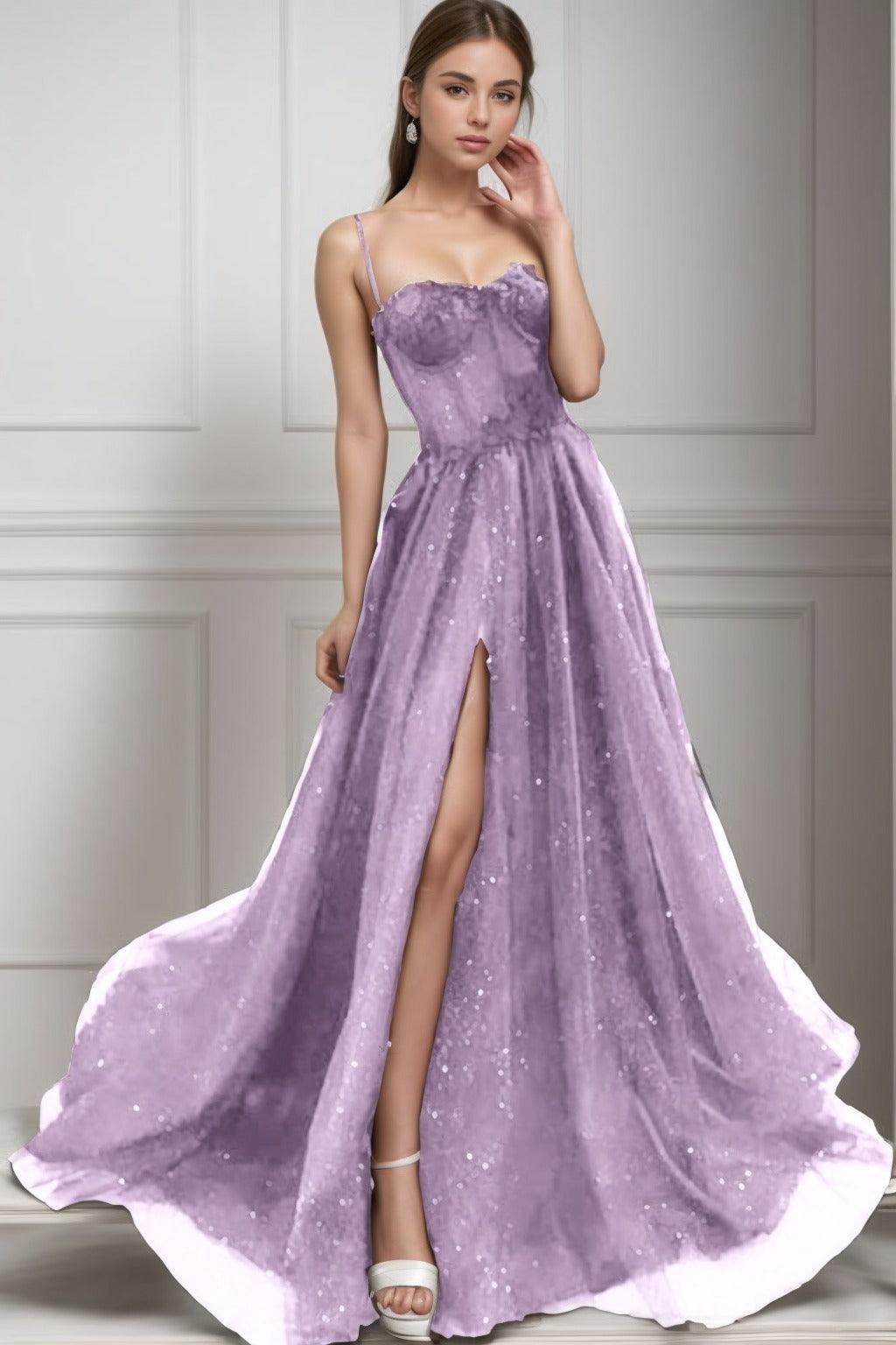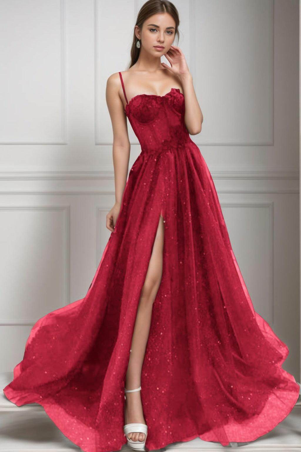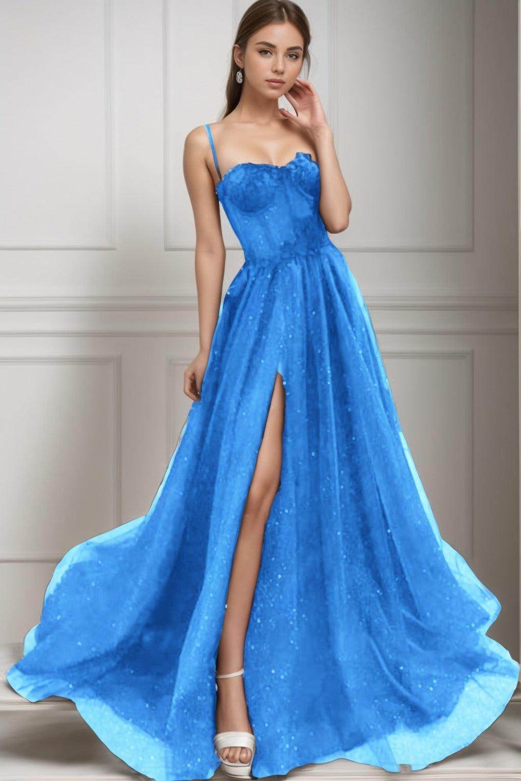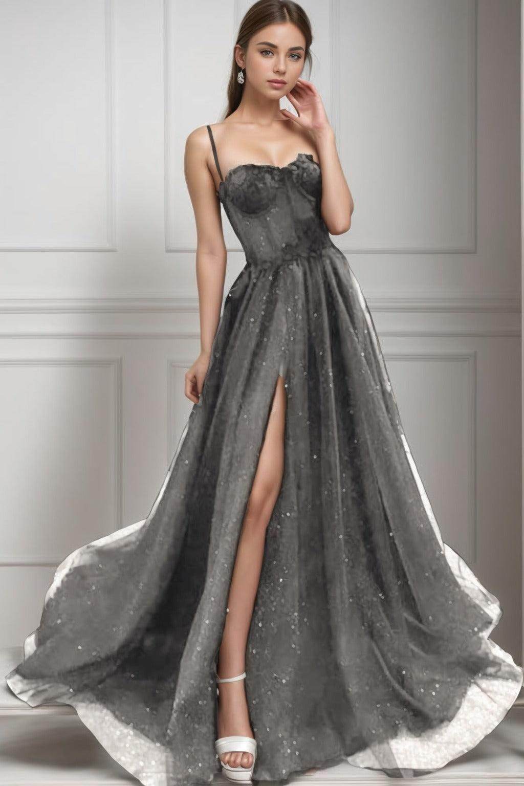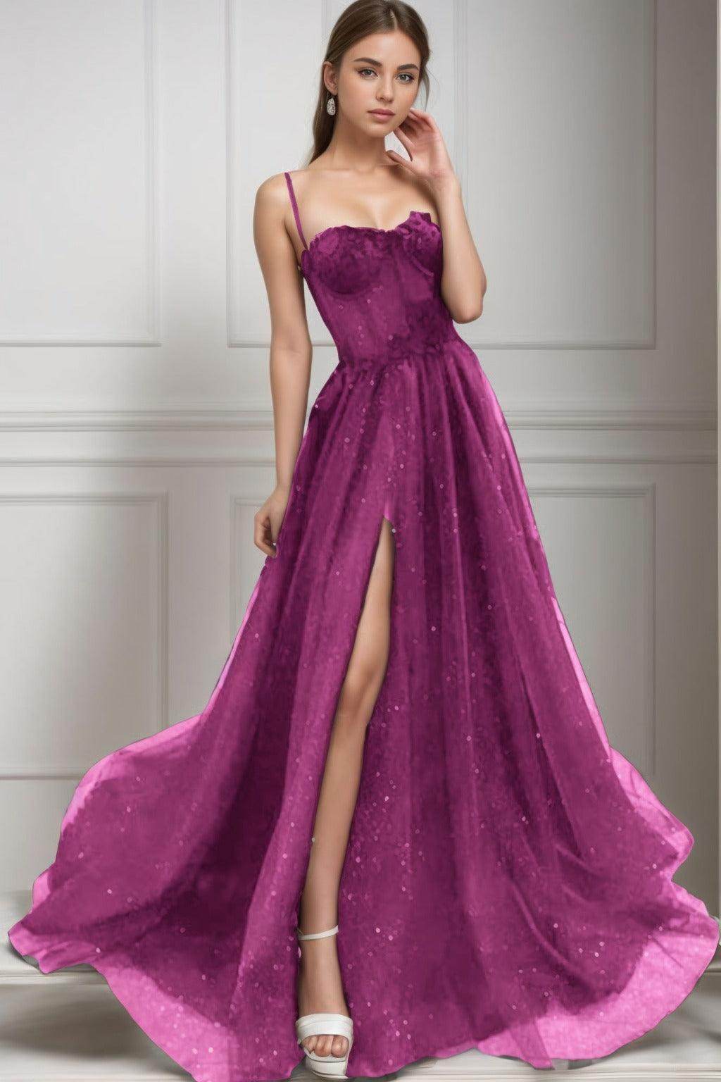 Introducing our captivating A-Line Sweep-Brush Train Tulle Prom Dress! Featuring a timeless bateau neckline, sleeveless design, and alluring split embellishment, it's a symbol of sophistication. Perfect for prom, weddings, or formal events