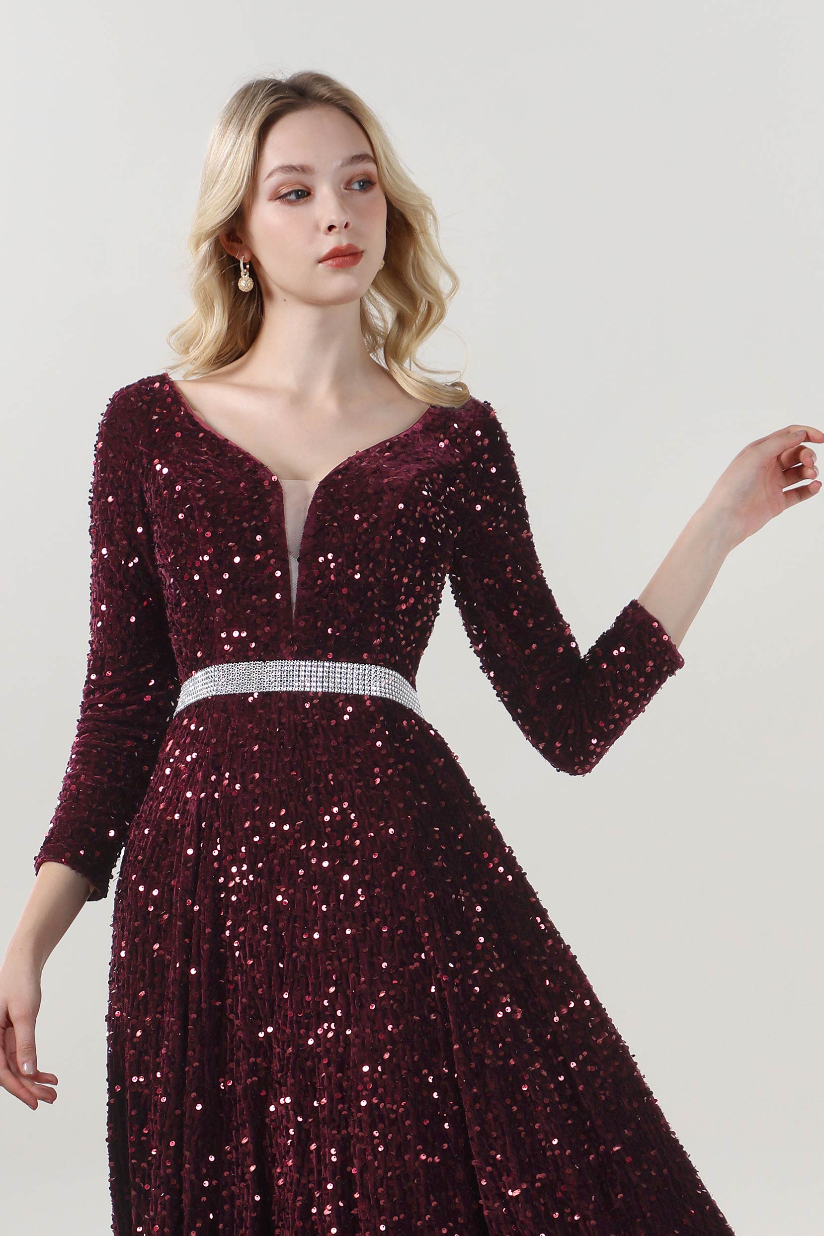 Introducing our amazing long sleeves sparking dress, featuring A-line silhouette. Sexy with V-Neck but still elegant with long sleeves and full back. Crafted from Velvet Sequin, delicated zipper back. Perfect as Formal & Evening,Cocktail & Party, Prom & Formal,Military Ball event.It is perfect for any occasion.
