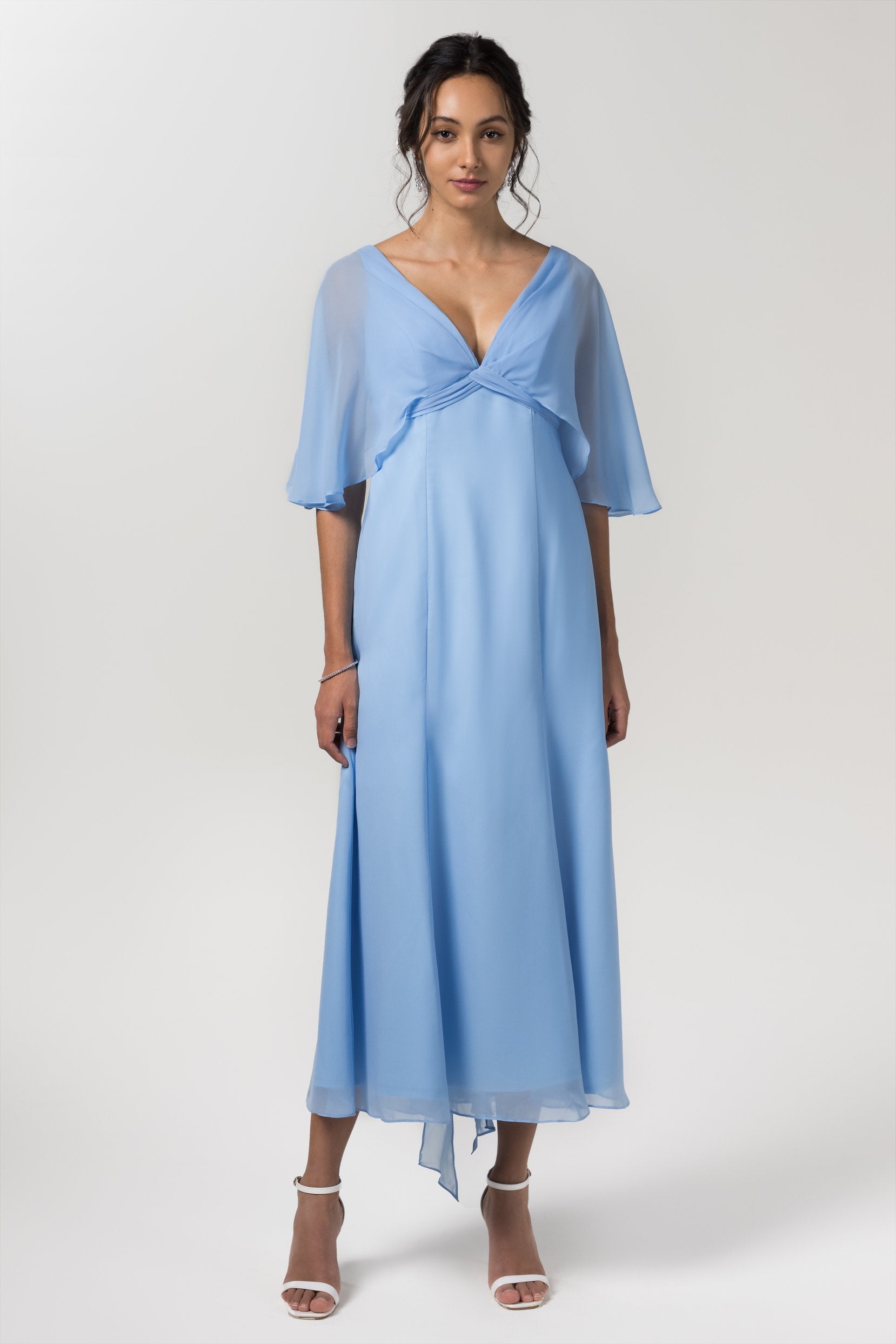 This bridesmaid dress exudes fresh elegance with a hidden zipper for a sleek fit. Soft chiffon flows gracefully, while the V-neck and ruffled sleeves enhance feminine charm. The tea-length A-line skirt offers comfort and style, making every bridesmaid shine on the special day.