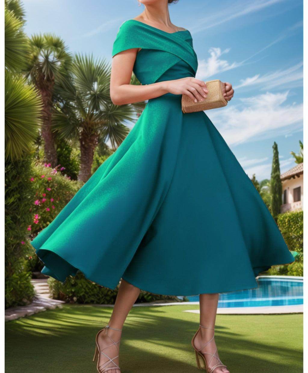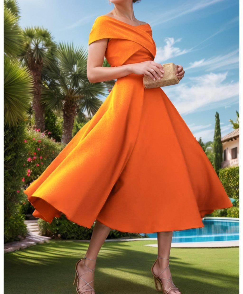 Introducing our A-Line silhouette prom gown with gorgeous off-the-shoulder sleeves and an enticing Crumb Catcher neckline. This tea-length dress has a natural waist, a handy zipper back, and is made of opulent satin fabric for classic elegance. It's ideal for many events and the height of style and elegance!