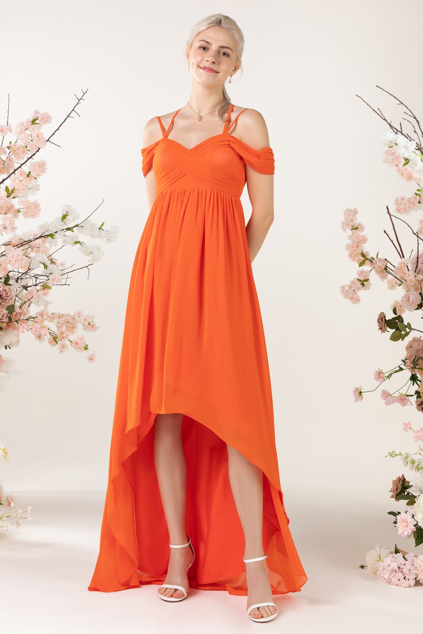 This bridesmaid dress blends modern elegance with romance. The practical back zipper and airy chiffon create a flowing, soft look. Spaghetti straps and an asymmetrical cut add style, while the empire waist and sweep train enhance the dreamy, refined silhouette.