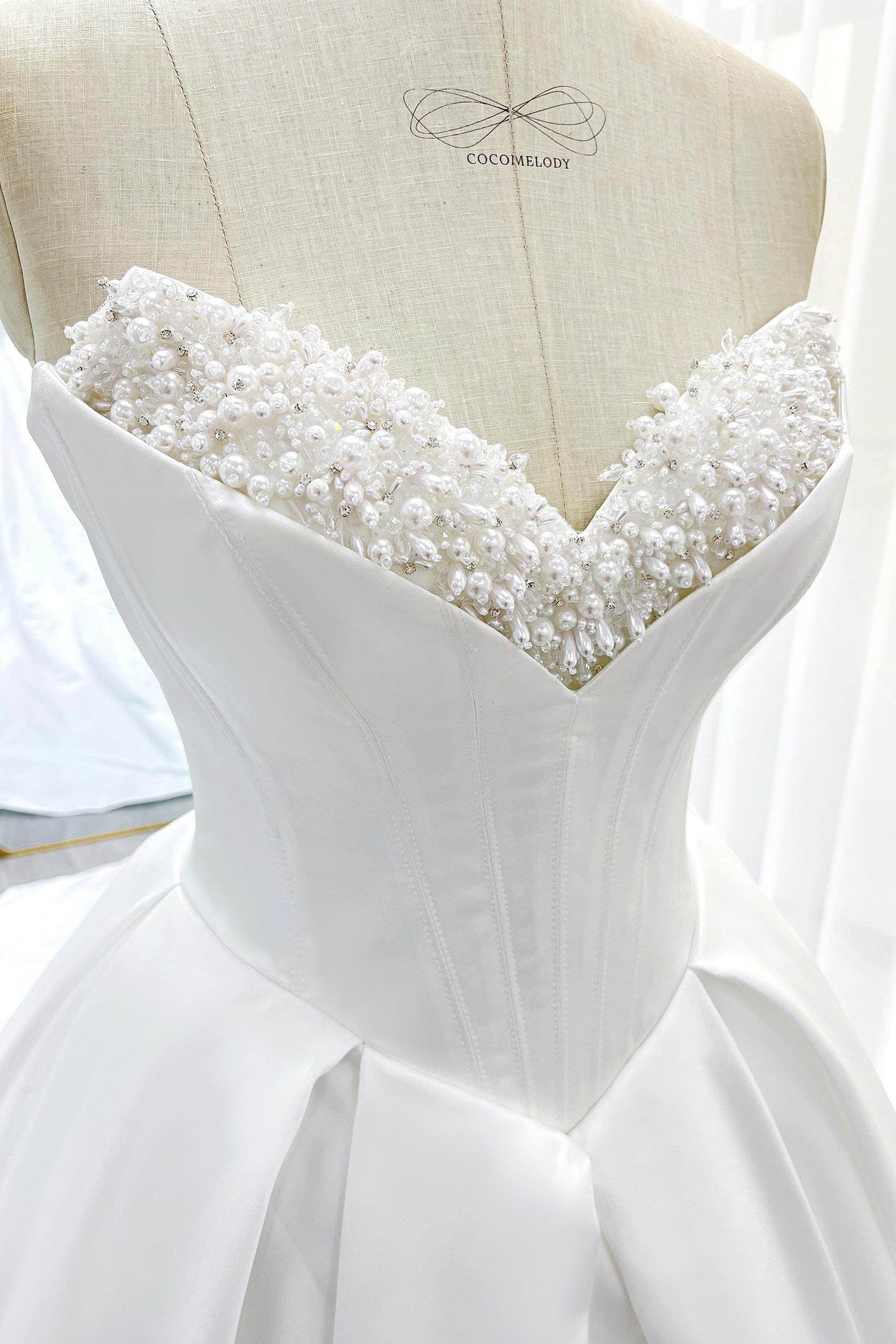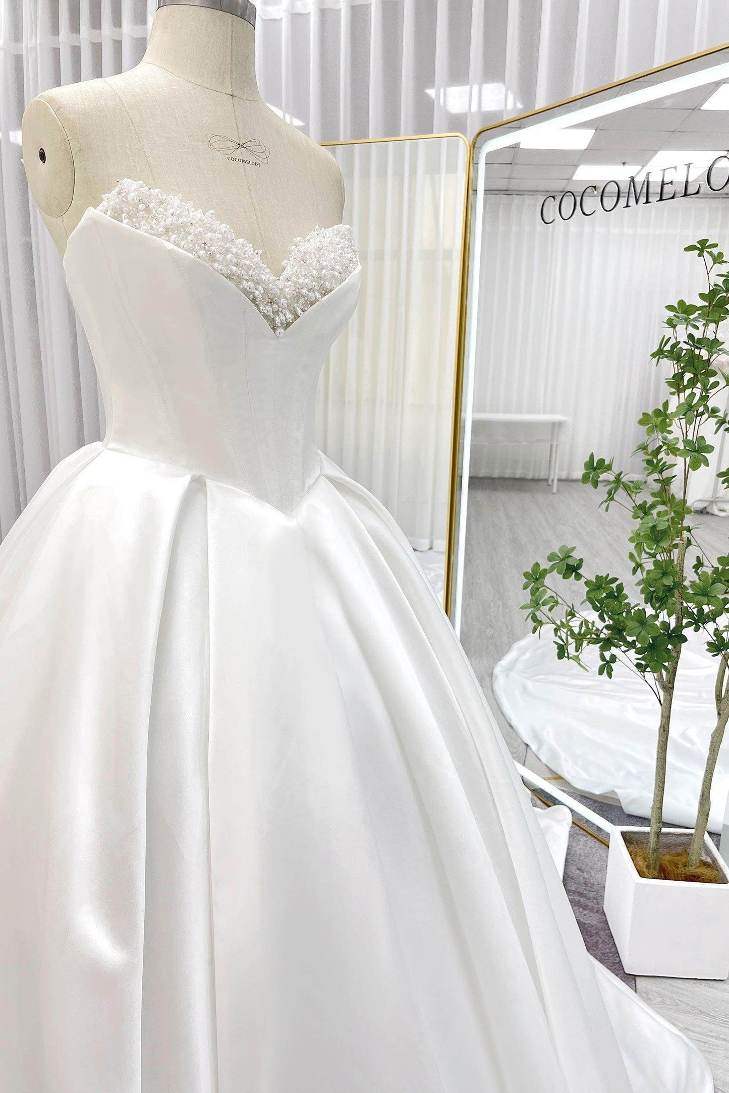This luxurious wedding gown boasts a petal-shaped sweetheart neckline adorned with exquisite beading, exuding opulence and nobility. The ball gown silhouette creates a regal and elegant look, while the chapel train crafted from sumptuous satin adds a touch of grandeur and sophistication.