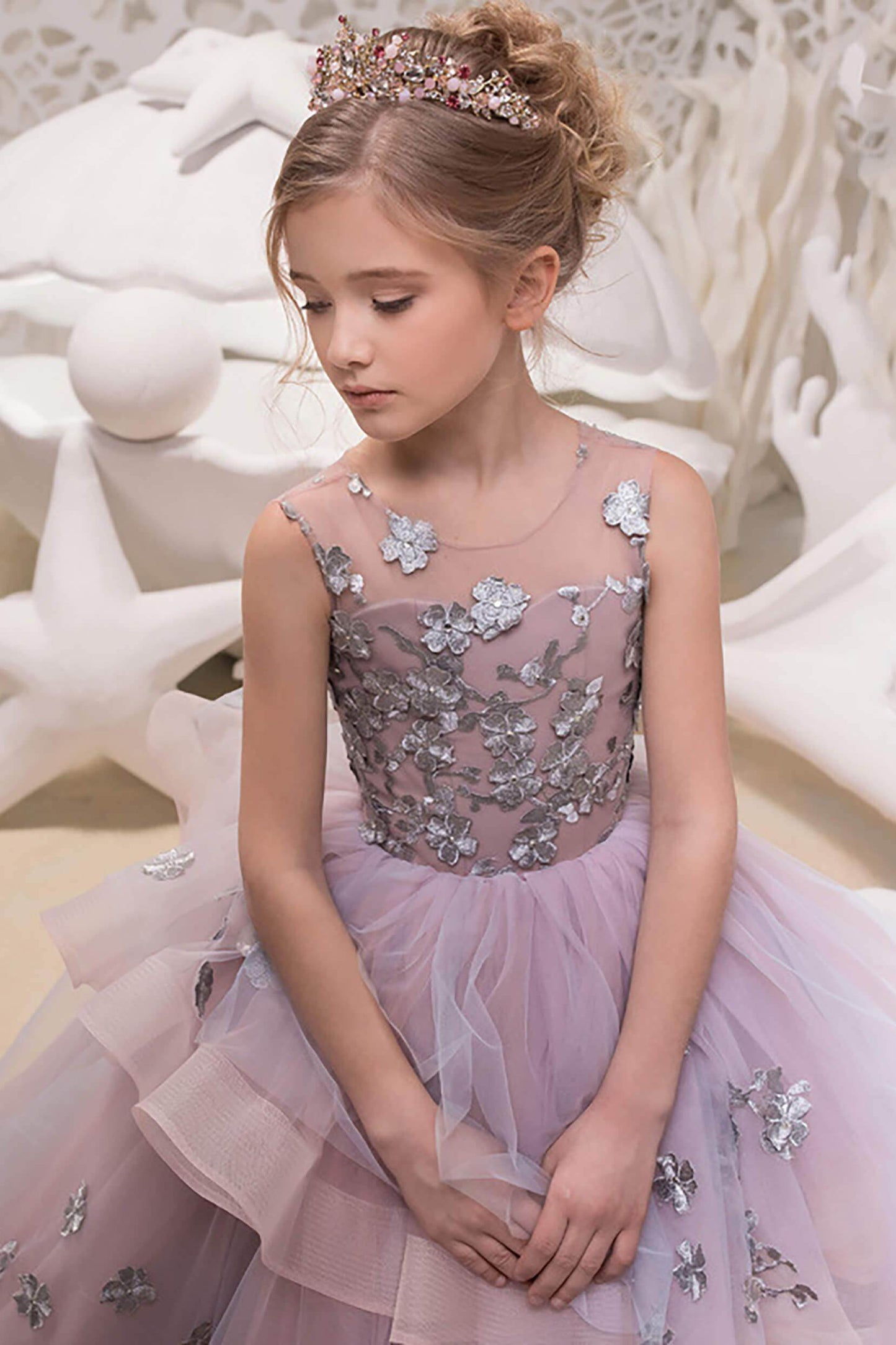 This elegant ball gown floor-length dress with an illusion neckline and sleeveless design makes a perfect flower girl dress, featuring a natural waist and zipper back.