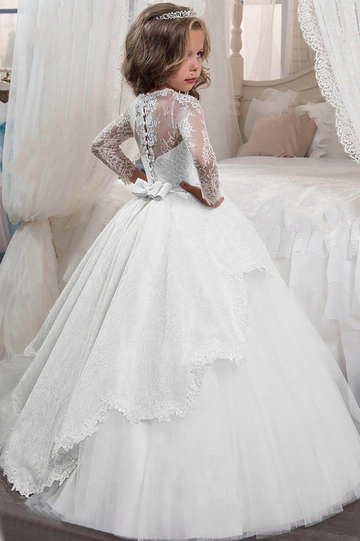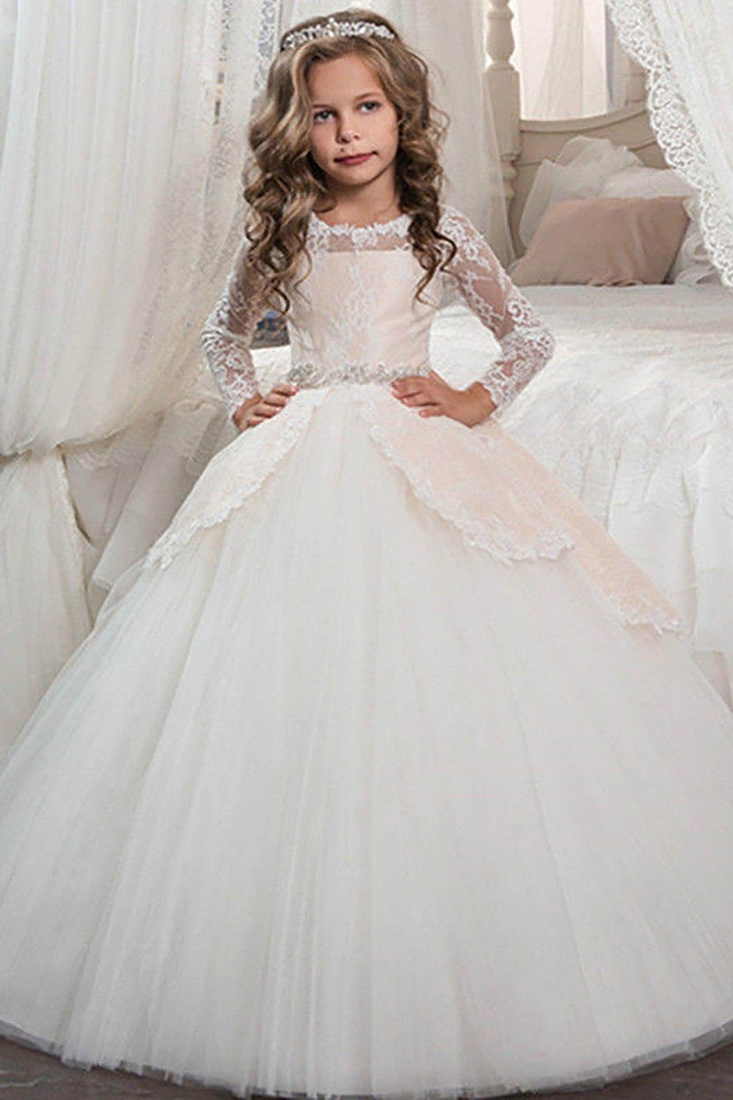 This charming ball gown floor-length dress with a scoop neckline and long sleeves is the ideal flower girl dress, featuring a natural waist and zipper back.