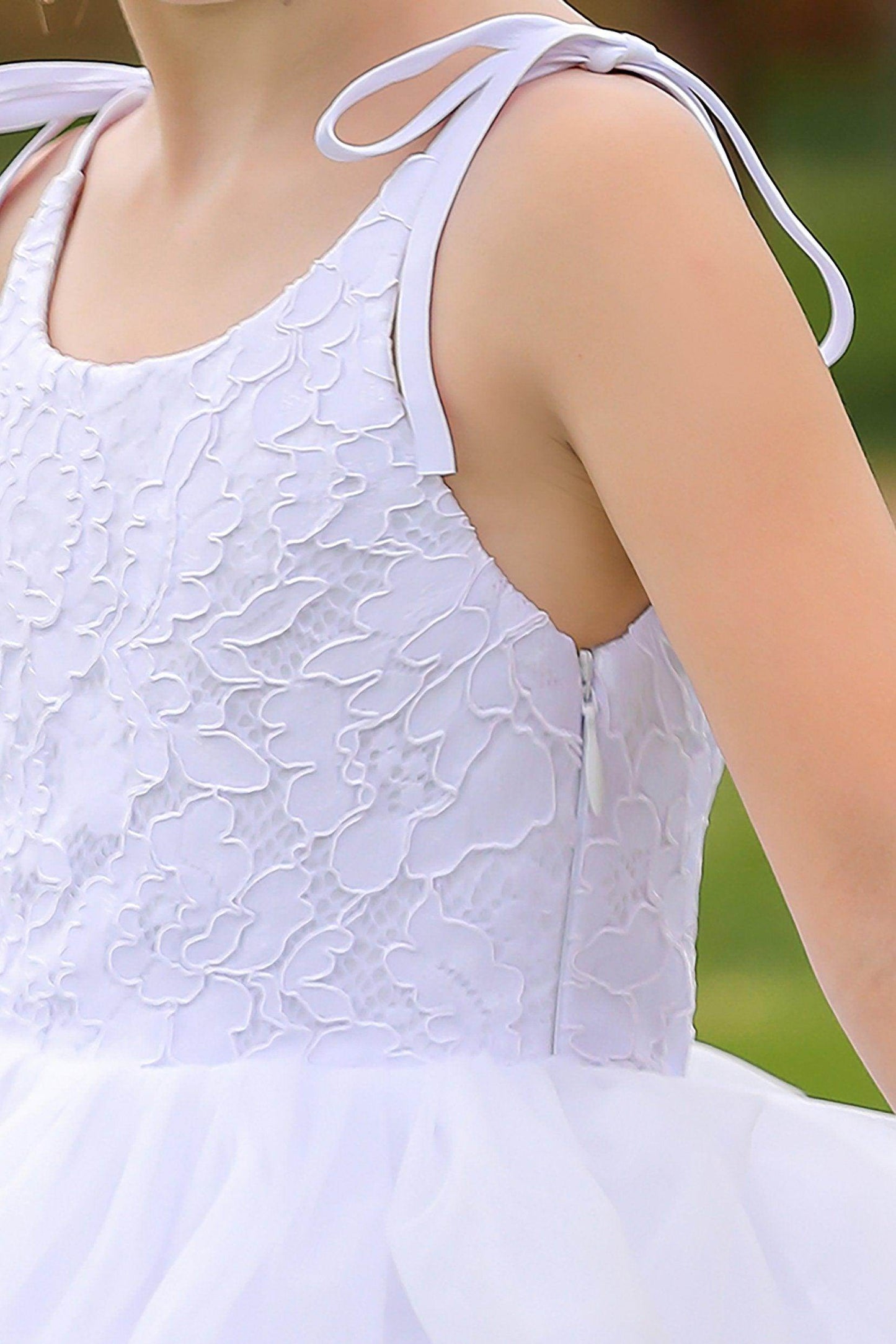 This elegant ball gown tea-length flower girl dress with spaghetti straps and a natural waist is perfect for any special occasion.