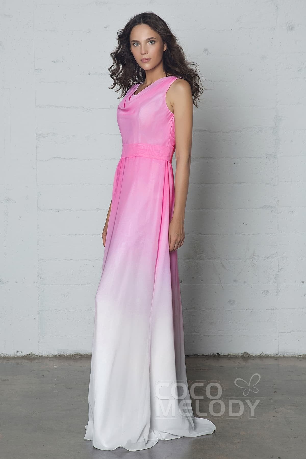 This bridesmaid dress features a sleek zipper closure and is crafted from ombre chiffon for a stunning gradient effect. The floor-length sheath silhouette with a cowl neckline exudes elegance, while the sleeveless design highlights a natural waist, combining grace and comfort perfectly.