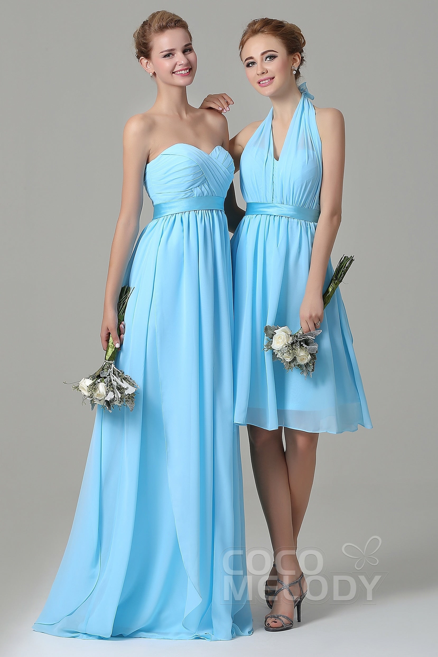 This charming bridesmaid dress is crafted from lightweight chiffon with a playful A-line silhouette. The halter neckline elegantly highlights the shoulders, while the knee-length skirt and delicate sash accentuate the natural waist, ensuring a confident and stylish look on the big day!