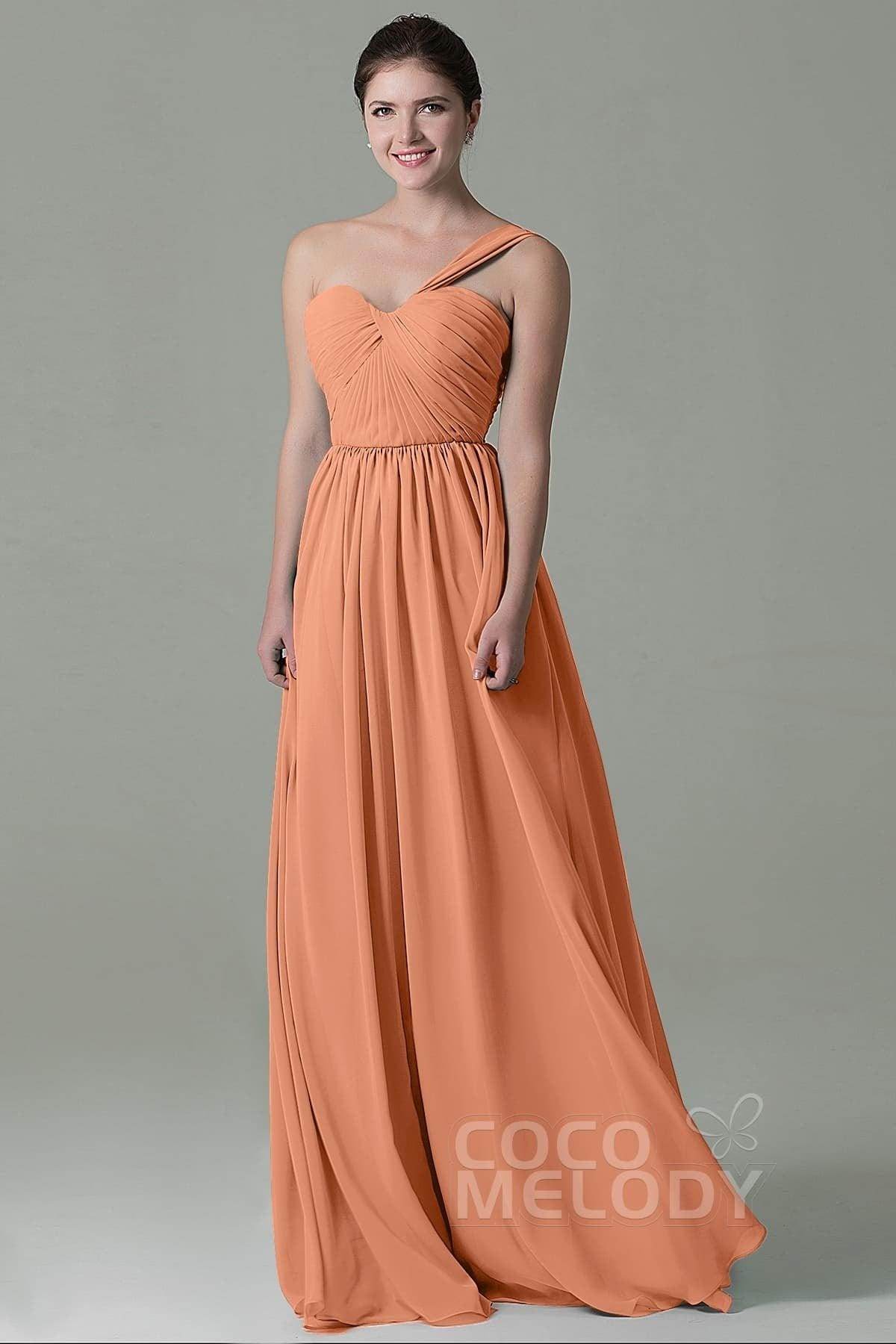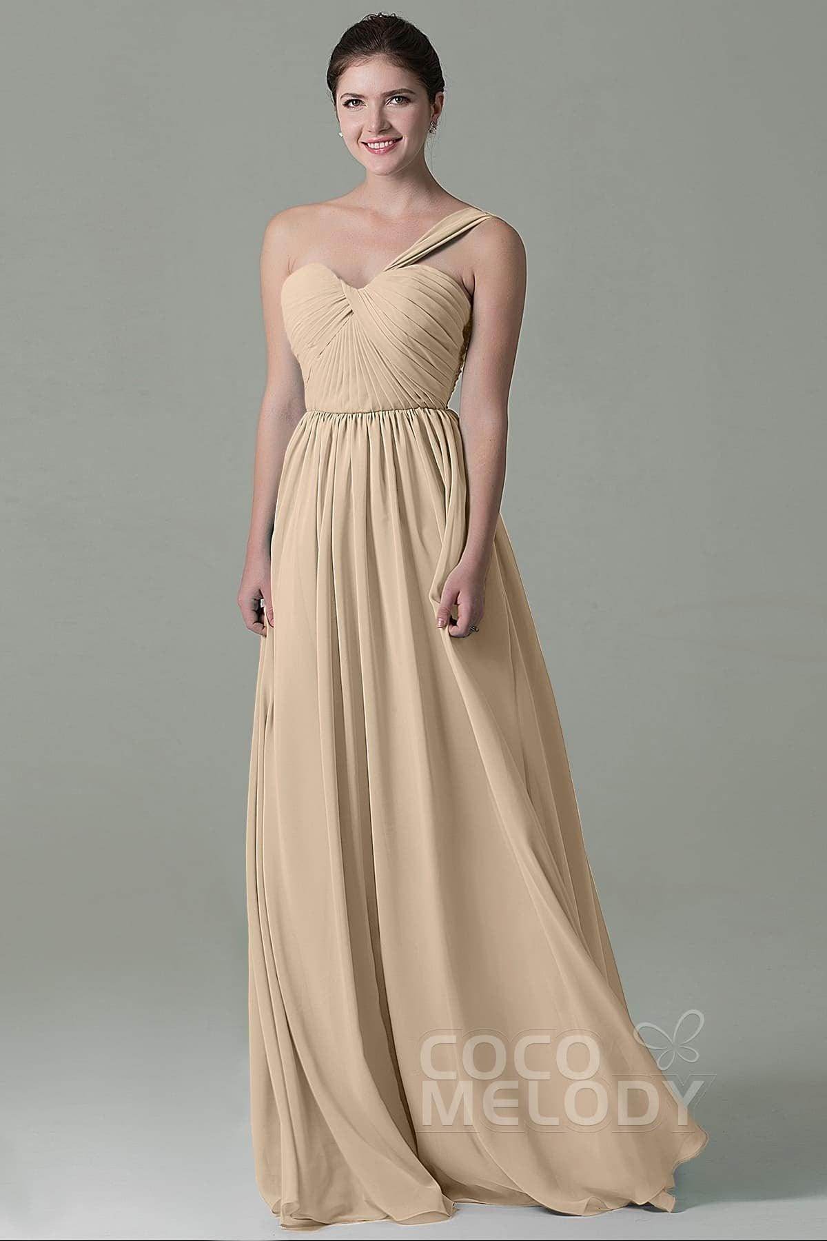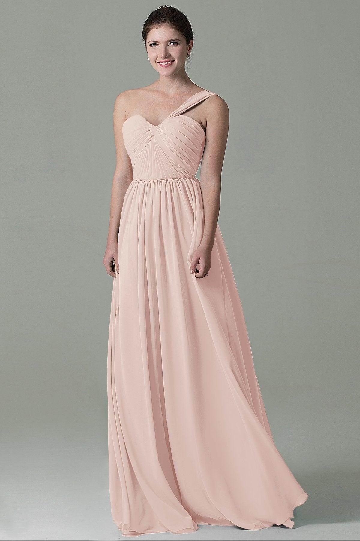 This floor-length bridesmaid dress in airy chiffon exudes elegance with its sheath-column silhouette. The one-shoulder neckline and natural waistline enhance a graceful figure, while the pleating adds texture. A lace-up corset back ensures a perfect fit and a touch of romance.