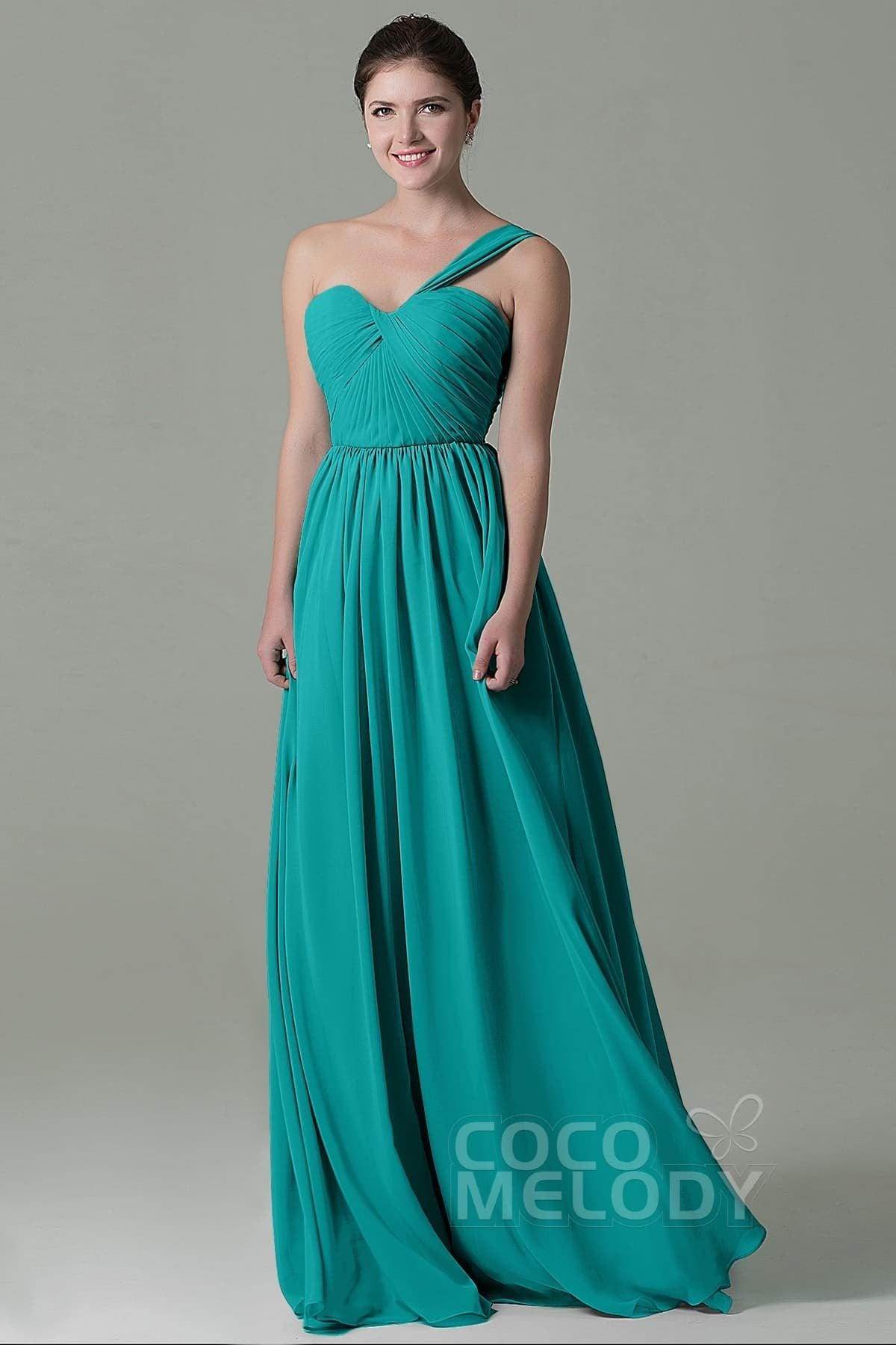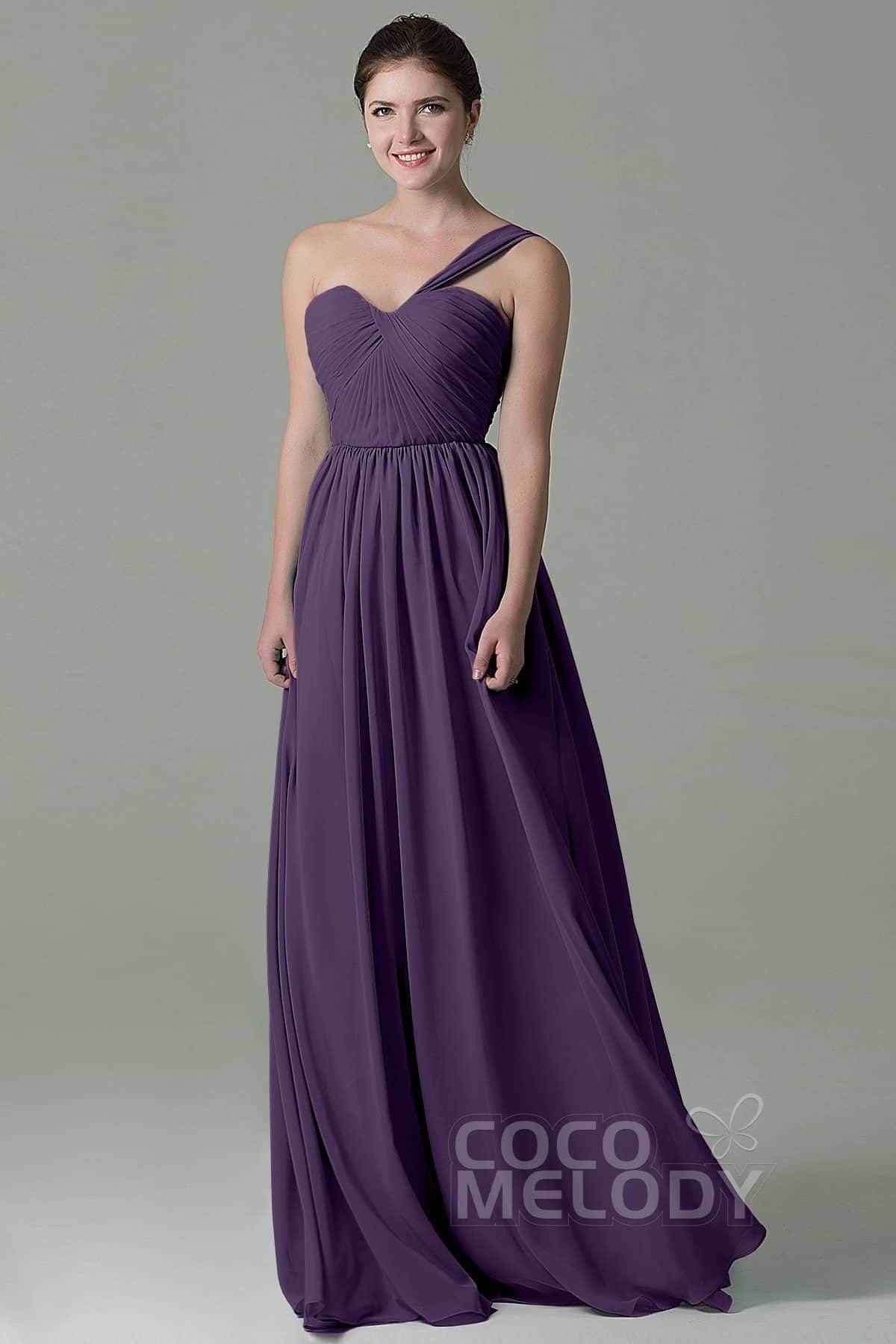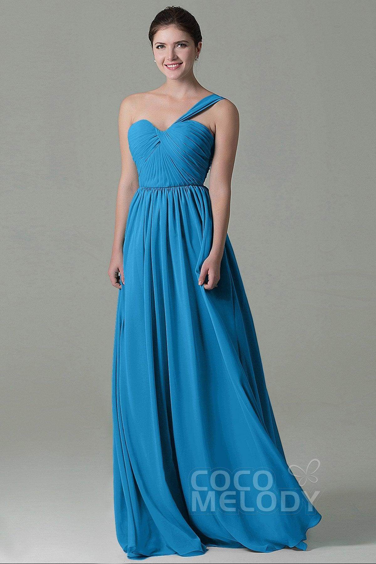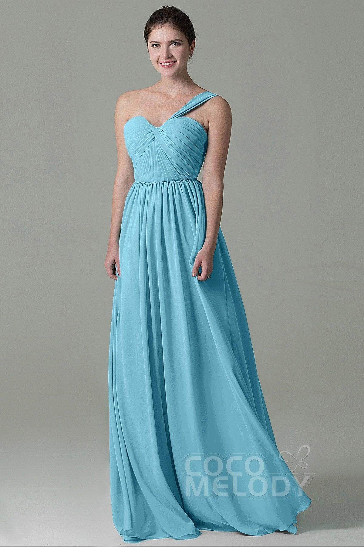 This floor-length bridesmaid dress in airy chiffon exudes elegance with its sheath-column silhouette. The one-shoulder neckline and natural waistline enhance a graceful figure, while the pleating adds texture. A lace-up corset back ensures a perfect fit and a touch of romance.