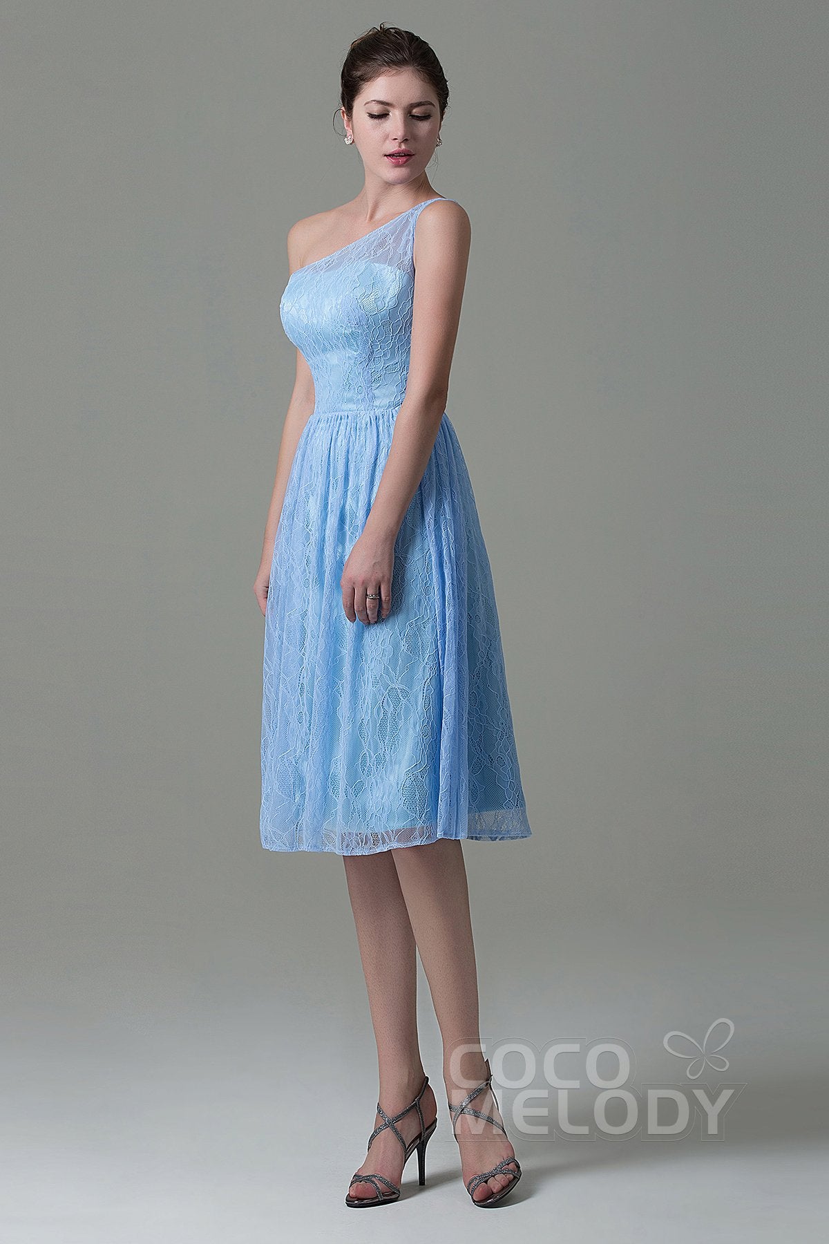 This bridesmaid dress in delicate lace features a knee-length A-line silhouette. The one-shoulder neckline and sleeveless design highlight elegant shoulders, while the natural waistline enhances a flattering shape. A lace-up corset back adds a romantic touch and ensures a perfect fit.