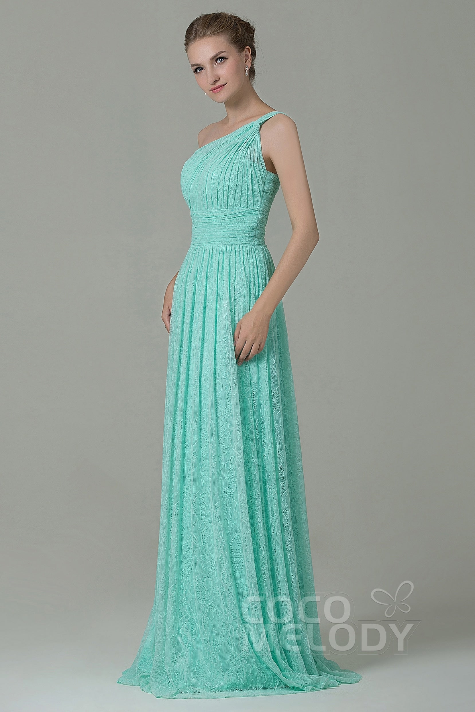 This floor-length bridesmaid dress in elegant lace features a sleek sheath-column silhouette. The one-shoulder neckline and sleeveless design highlight your shoulders, while the natural waist and pleating add sophistication. A lace-up corset back ensures a perfect, comfortable fit with a touch of romance.
