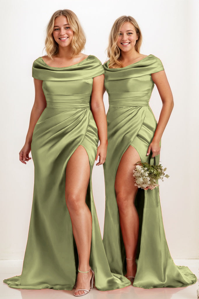 Discover the mermaid bridesmaid dress featuring a cowl neck, high split, and sweep train. this chic gown combines timeless style with modern sophistication.