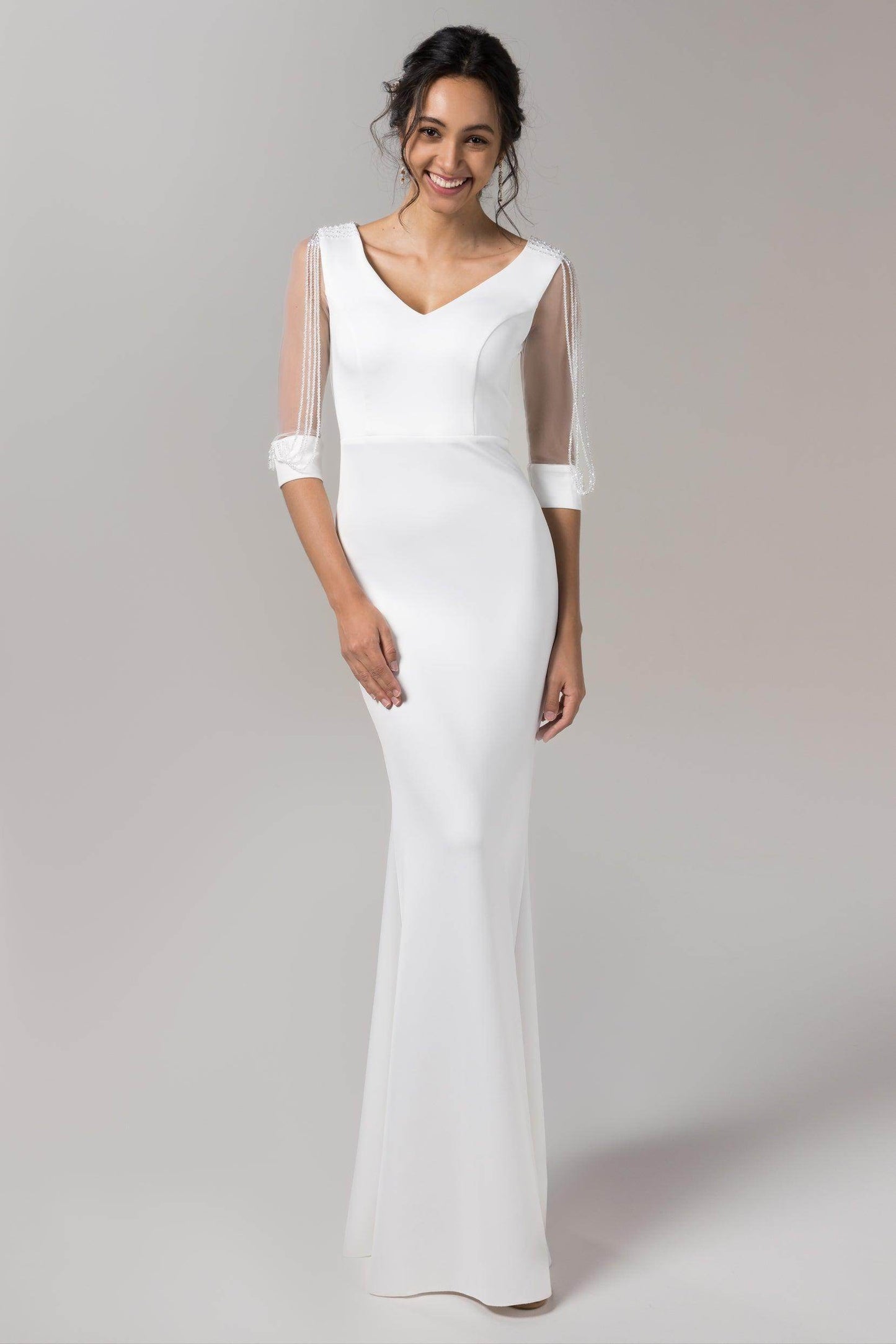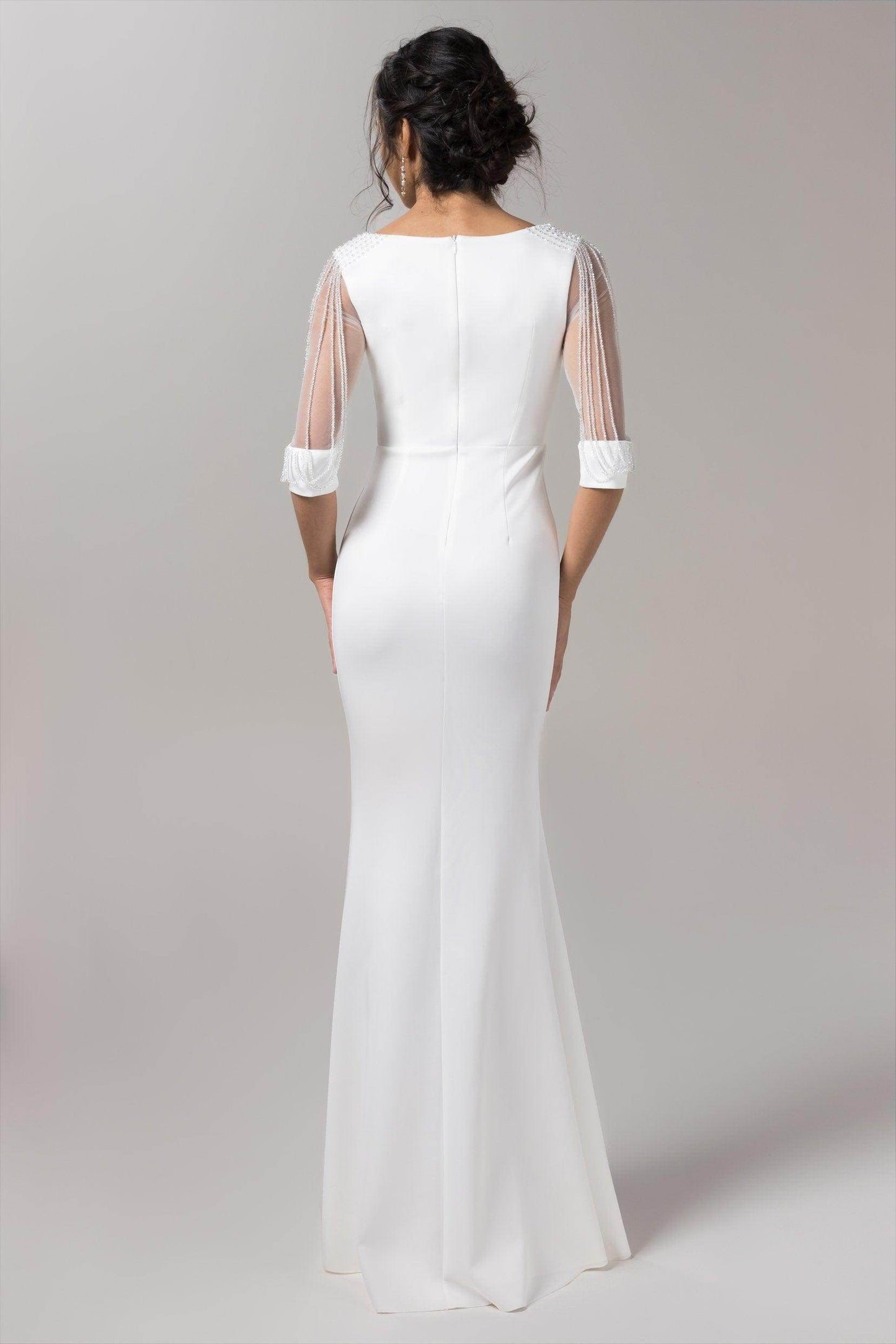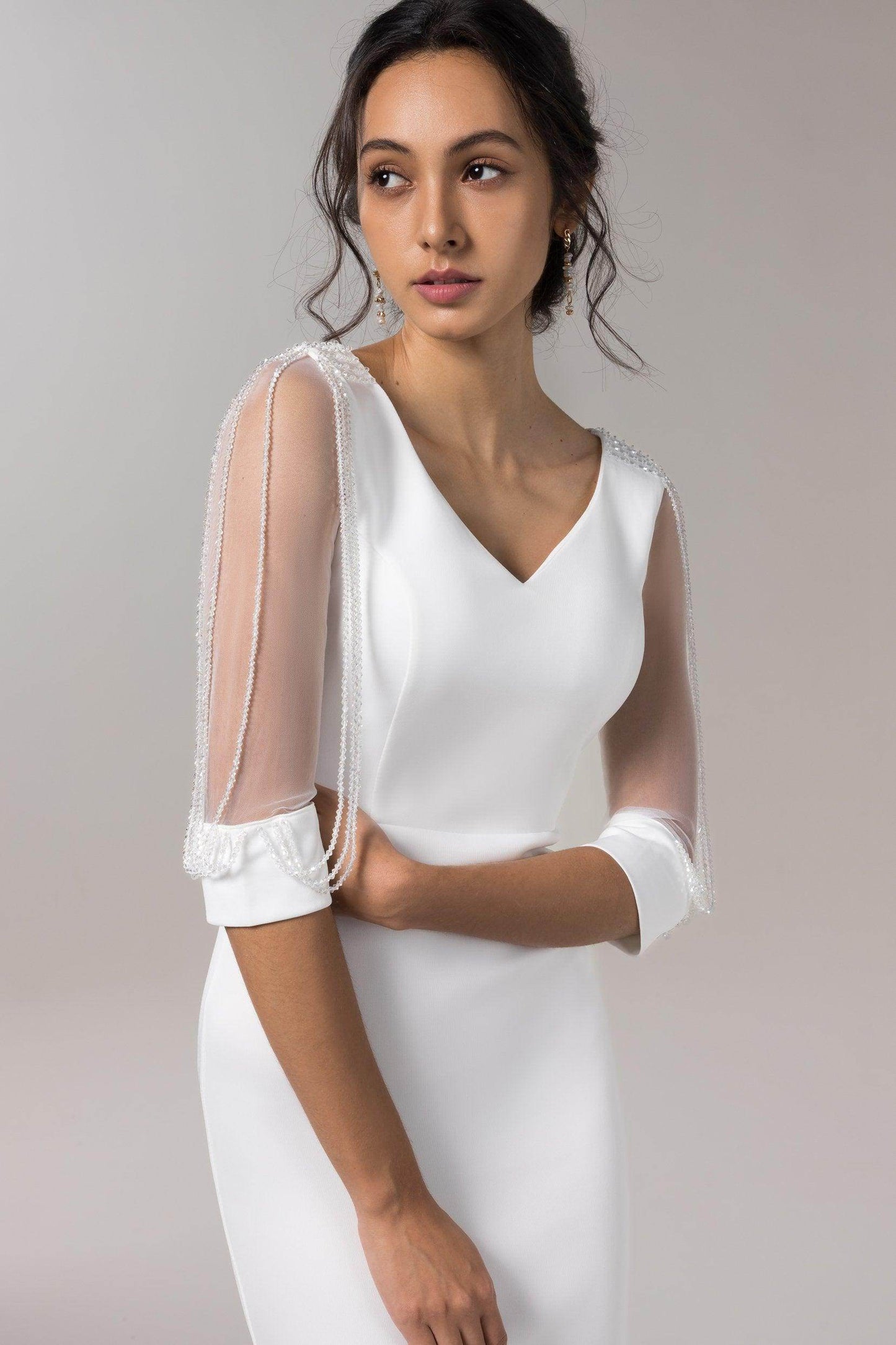 Introducing the MOLLY wedding dress—a stunning minimalist design that exudes elegance for any venue, from beach to church, hall, or hotel. This ivory trumpet gown features half sleeves, exquisite beading, and a detachable outer layer, ensuring you look effortlessly beautiful on your special day!