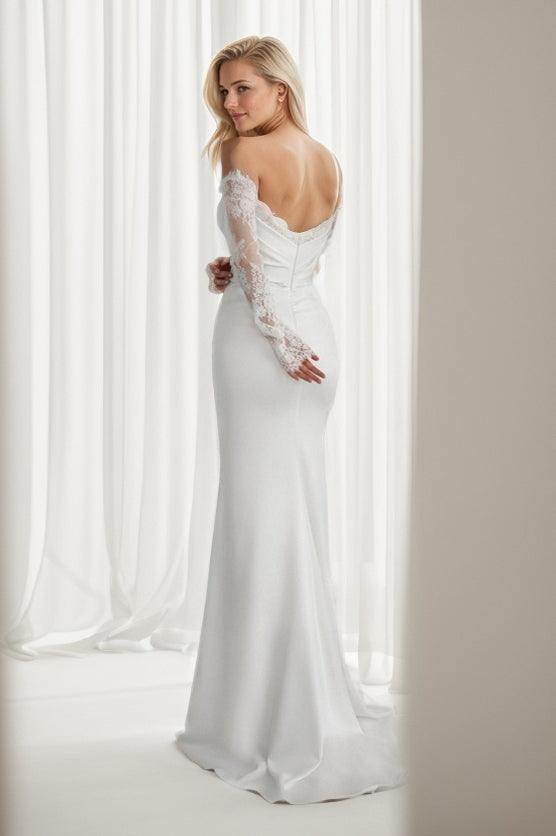 This off-the-shoulder wedding dress offers a stunning neckline and graceful silhouette, perfect for a bride seeking both elegance and allure on her special day.