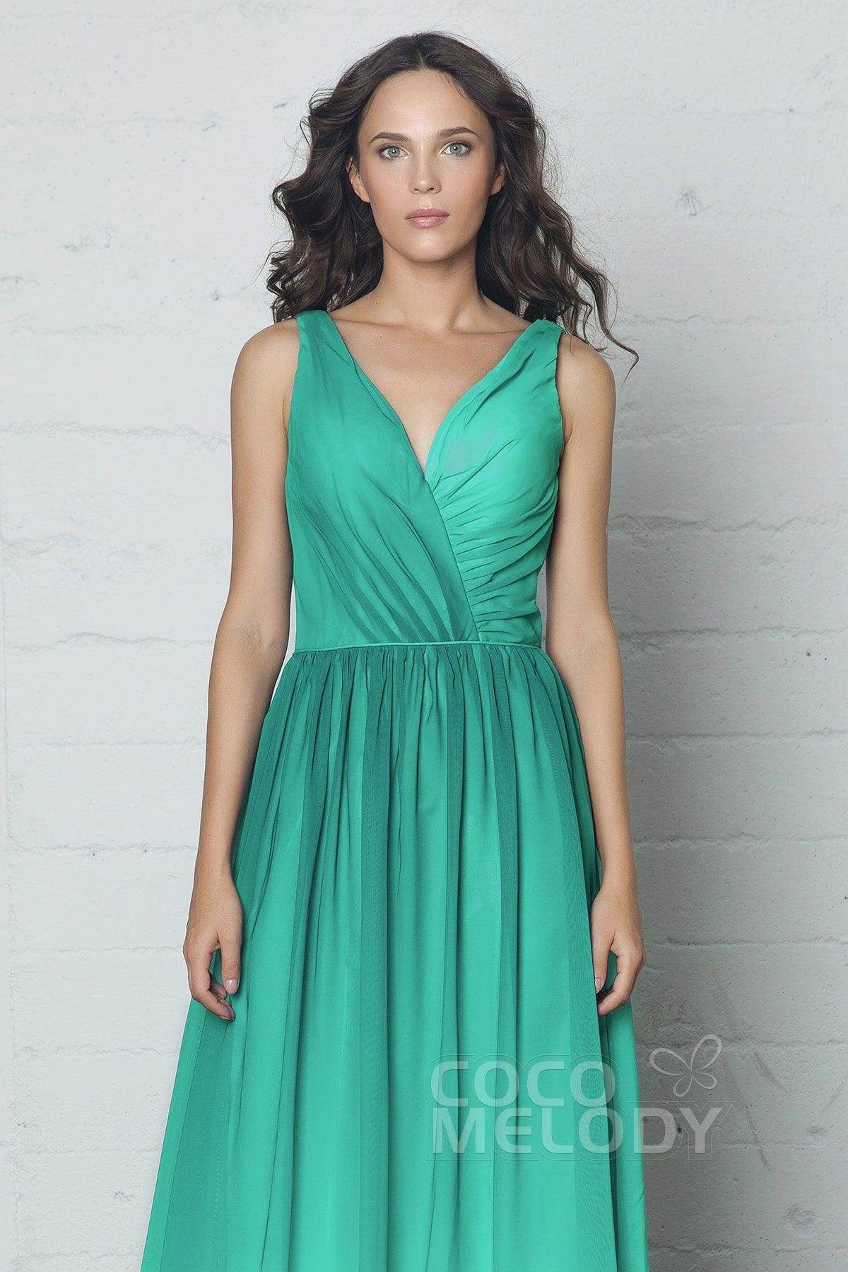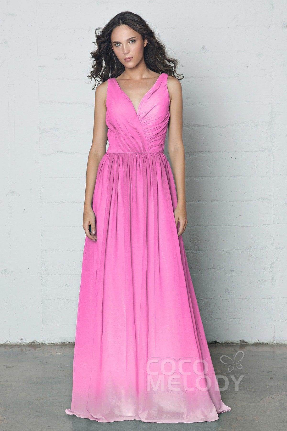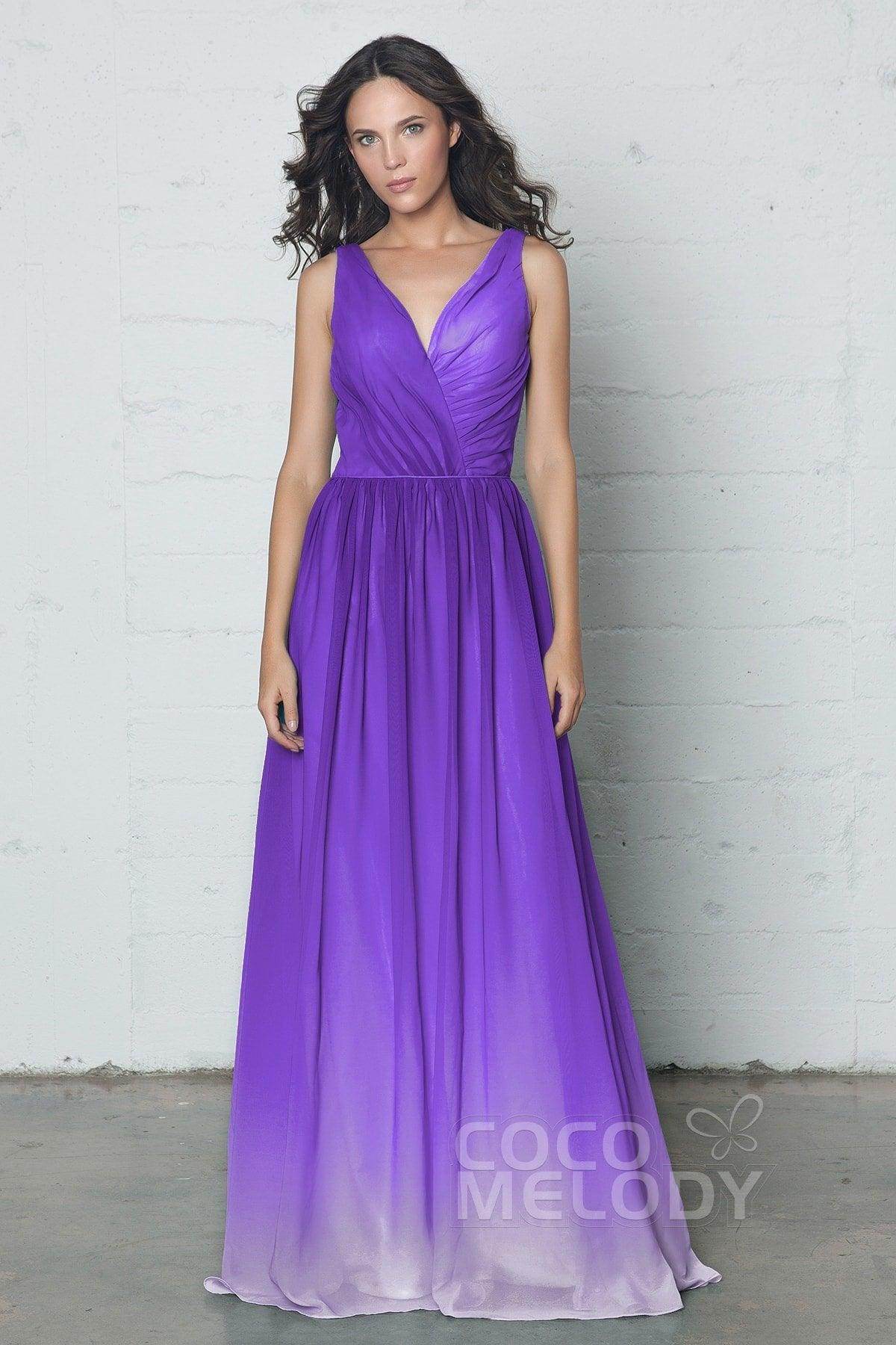 This bridesmaid dress features a stunning open back and flowing ombre chiffon fabric. The floor-length sheath-column silhouette is enhanced by elegant pleating and a deep V-neckline. The sleeveless design and natural waistline create a graceful and sophisticated look, perfect for any special occasion.