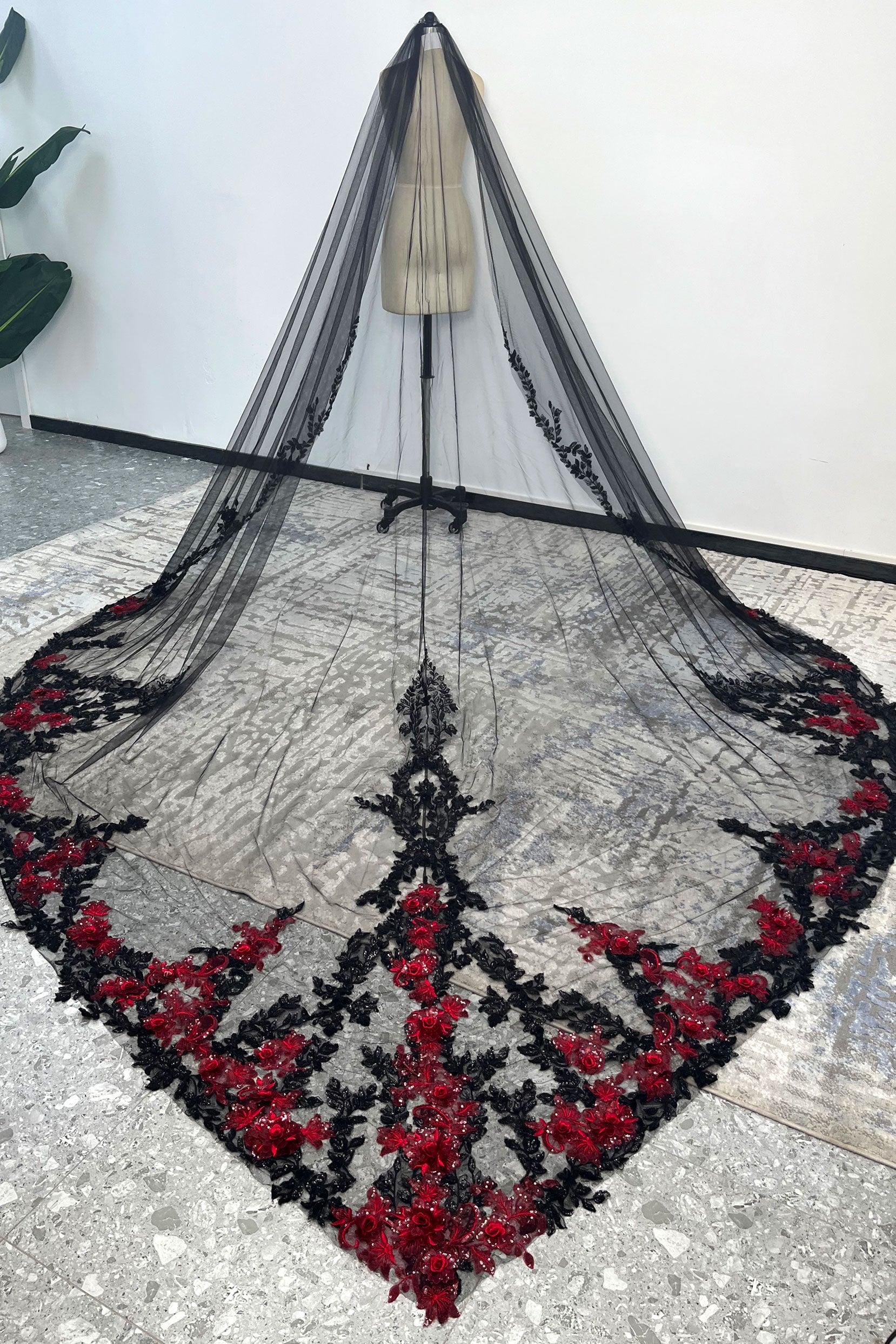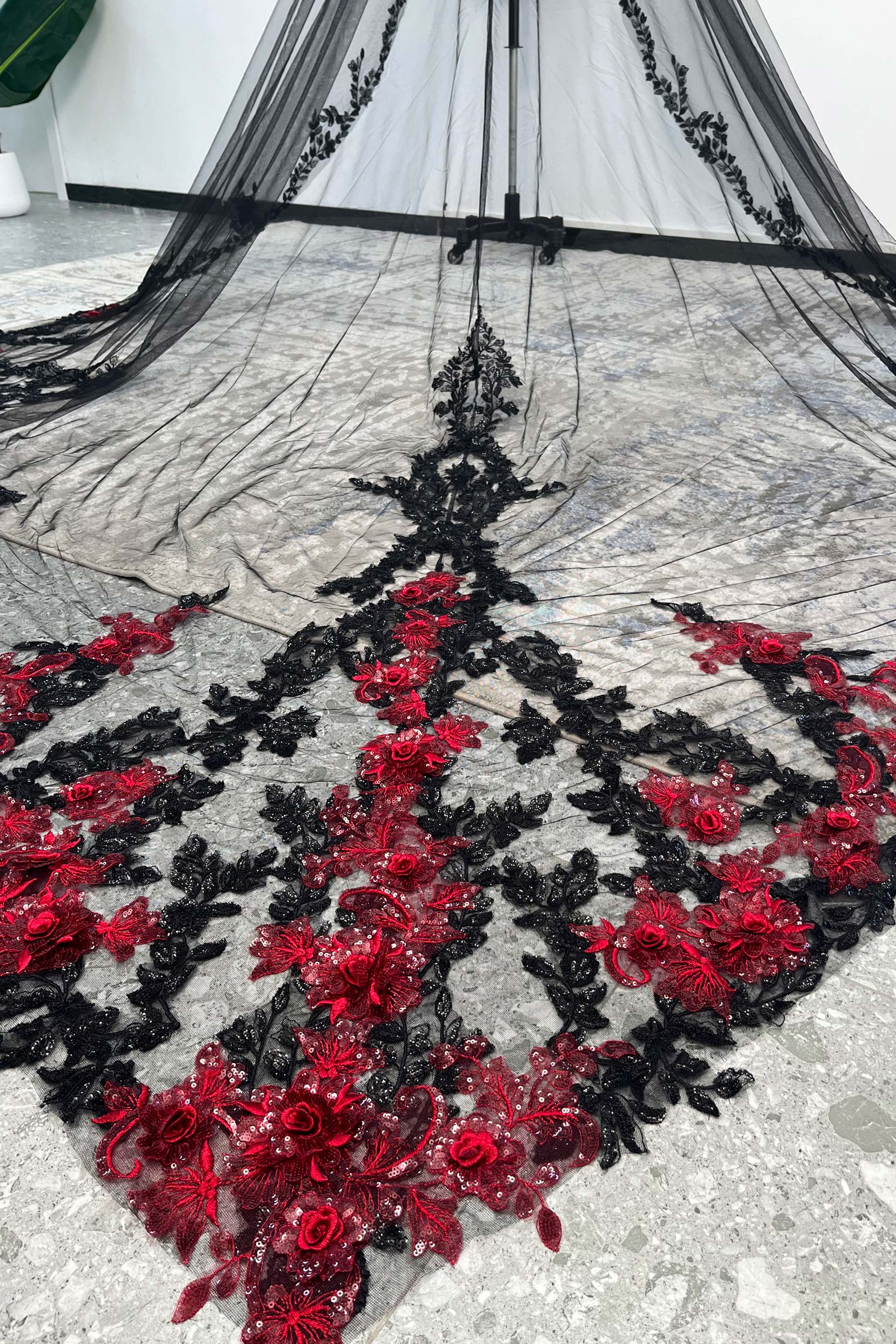 This stunning one-tier cathedral veil in tulle features lace edges, appliques, and sequin details, perfect for adding sparkle to your wedding day look.