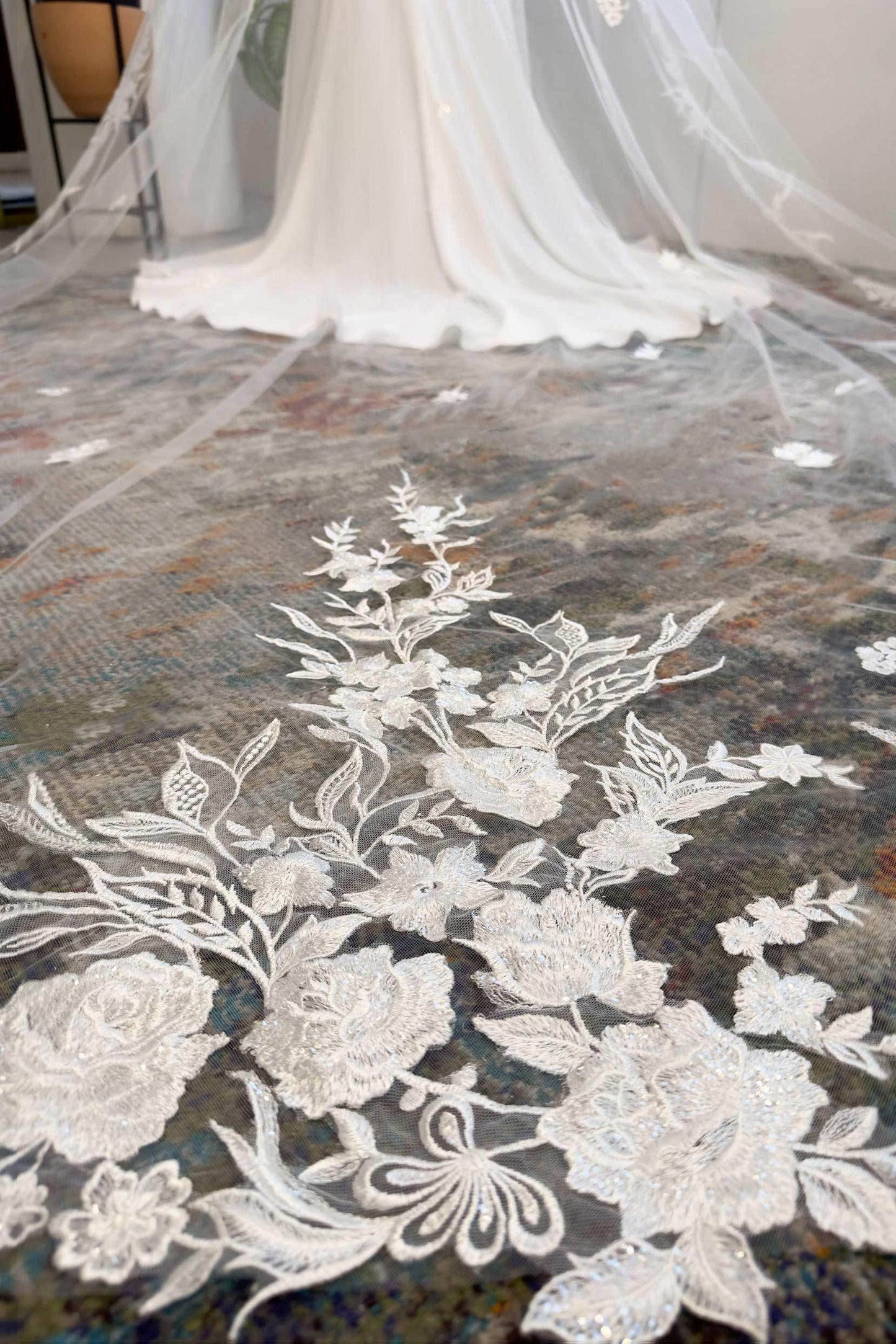 This graceful one-tier lace edge chapel veil with appliques, crafted from soft tulle, is perfect for brides who want to add a delicate and timeless detail to their wedding ensemble.