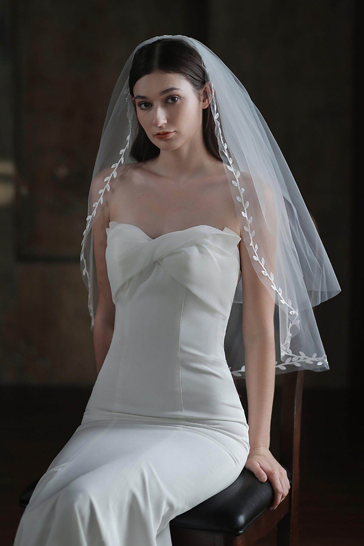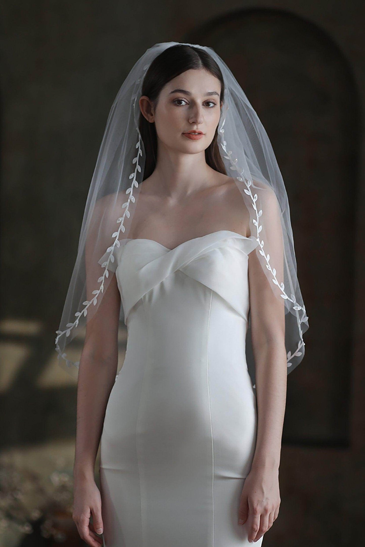 This delicate one-tier waist veil in tulle with a leaves edge offers a soft, natural look. Perfect for a romantic, nature-inspired bridal style.