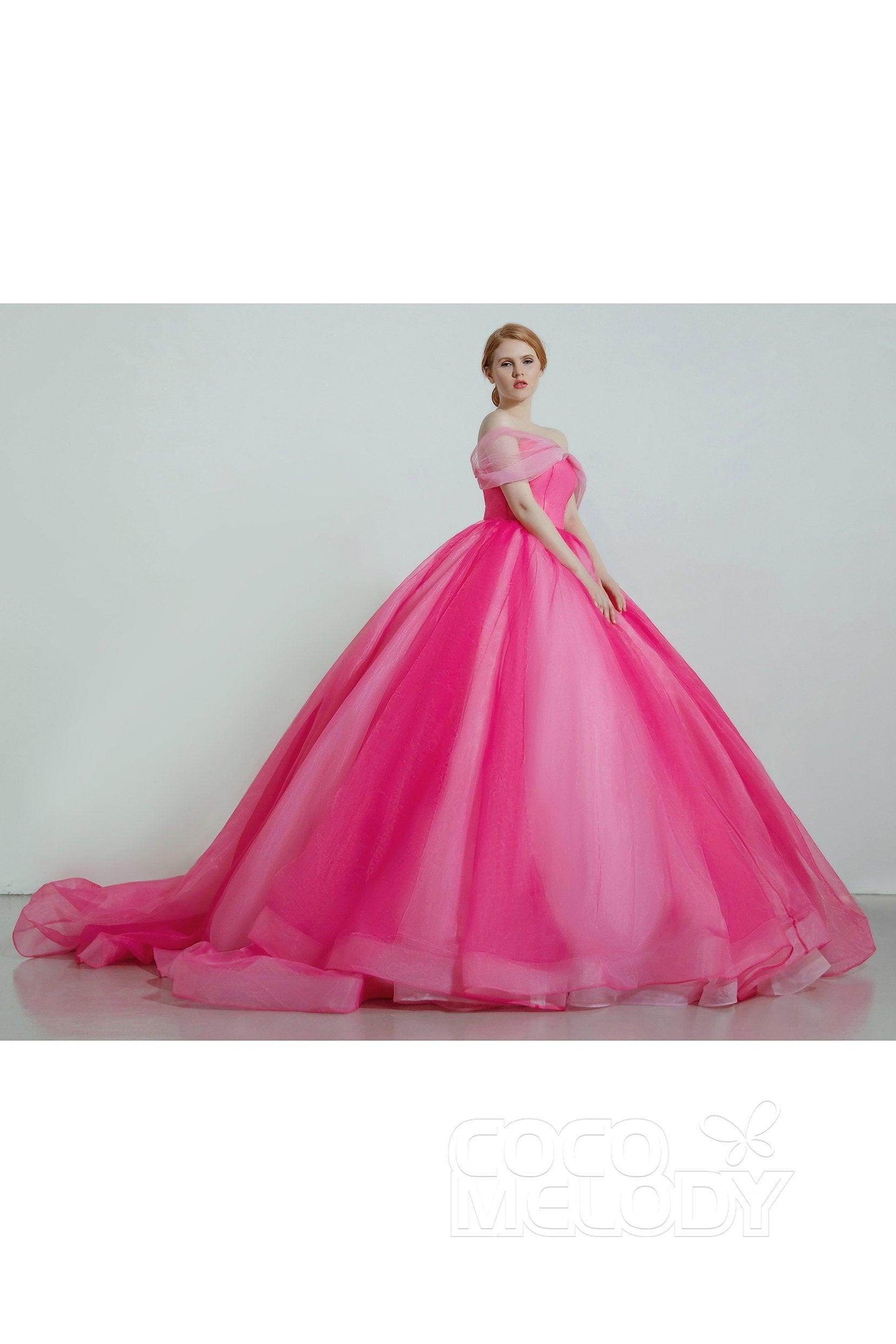 Introducing the ROWAN wedding dress in gorgeous pink! This enchanting princess gown features detachable off-the-shoulder straps and a beautiful court train. Ideal for church, hotel, and hall weddings, it combines elegance with versatility for your unforgettable day!