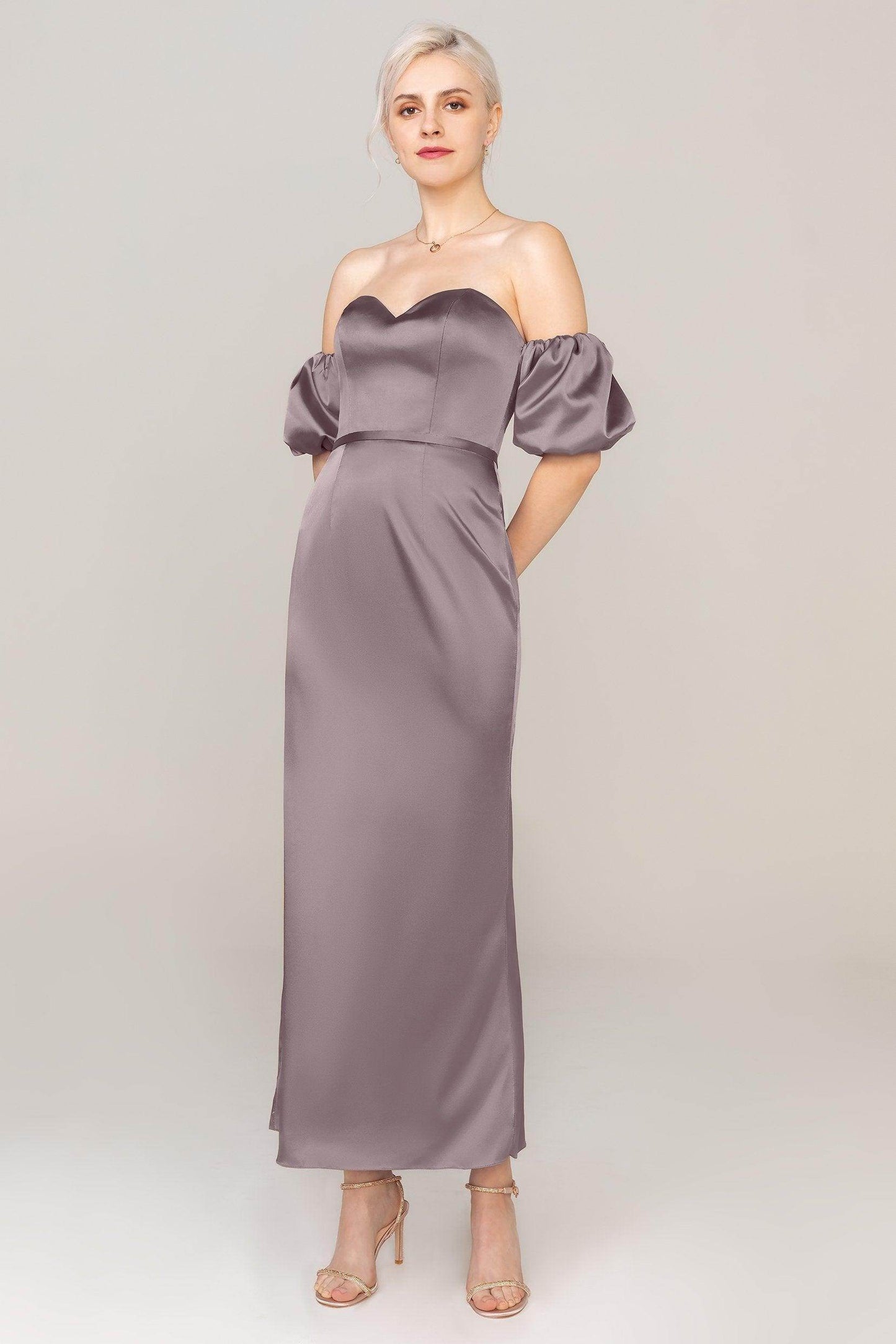 Sheath-Column Off The Shoulder Natural Ankle Length Luxe Satin Short Sleeve Lace Up-Corset Dress CS0306