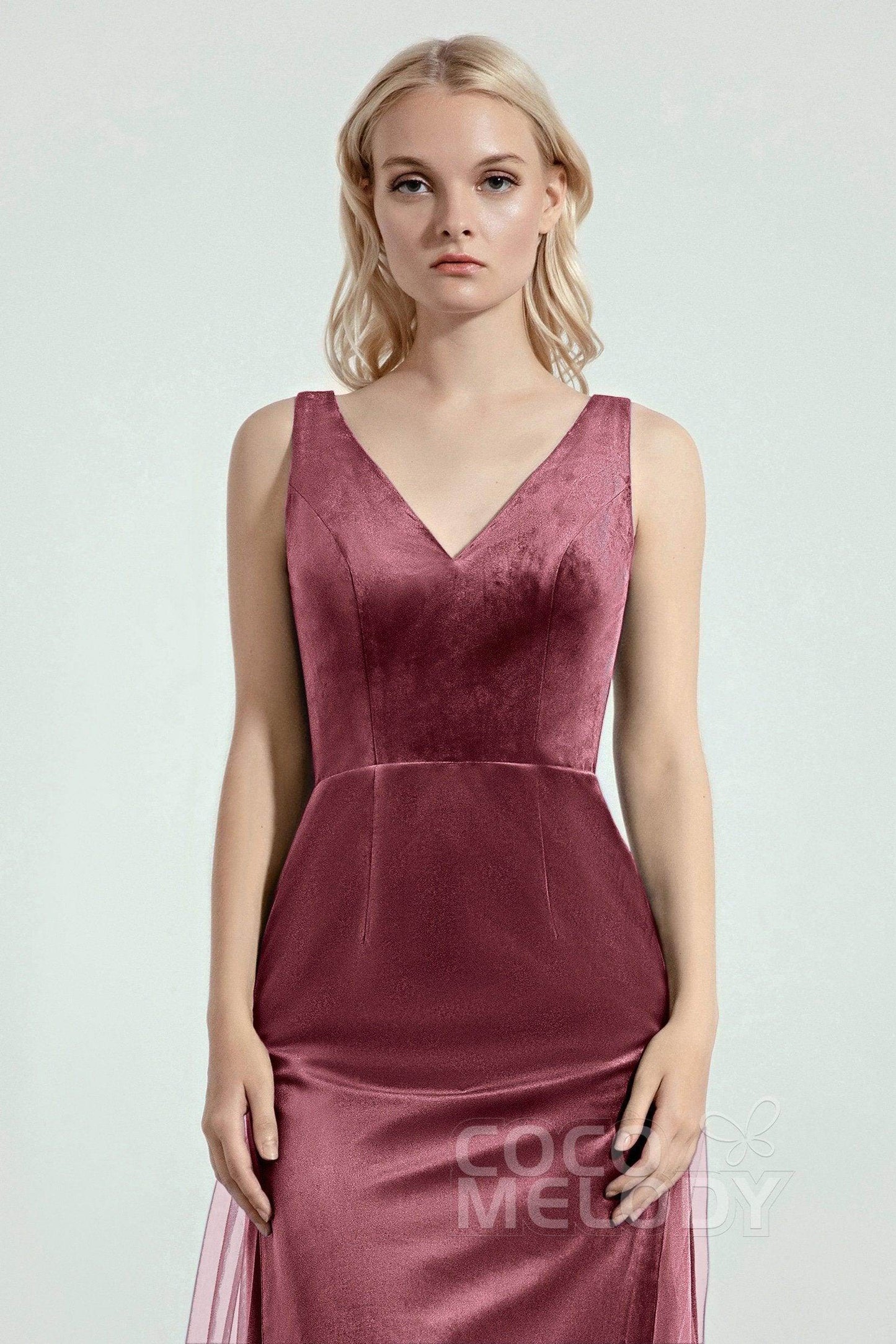 Elegant Sheath-Column V-Neck Natural Floor Length Velvet and Tulle Sleeveless Zipper With Buttons Bridesmaid Dress with Split CB0275CR
