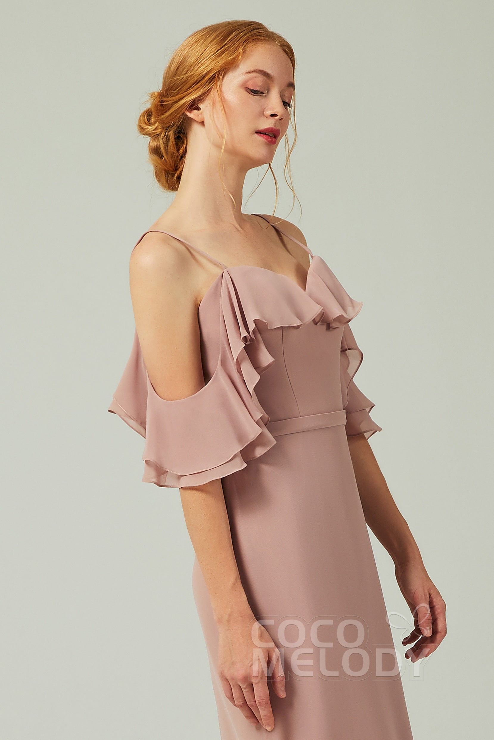 This enchanting bridesmaid dress features a back zipper and flowing chiffon that drapes elegantly to the floor. With delicate spaghetti straps and a sheath-column silhouette, it beautifully accentuates curves. Sashes and ruffles add a romantic touch, making it perfect for any special occasion.