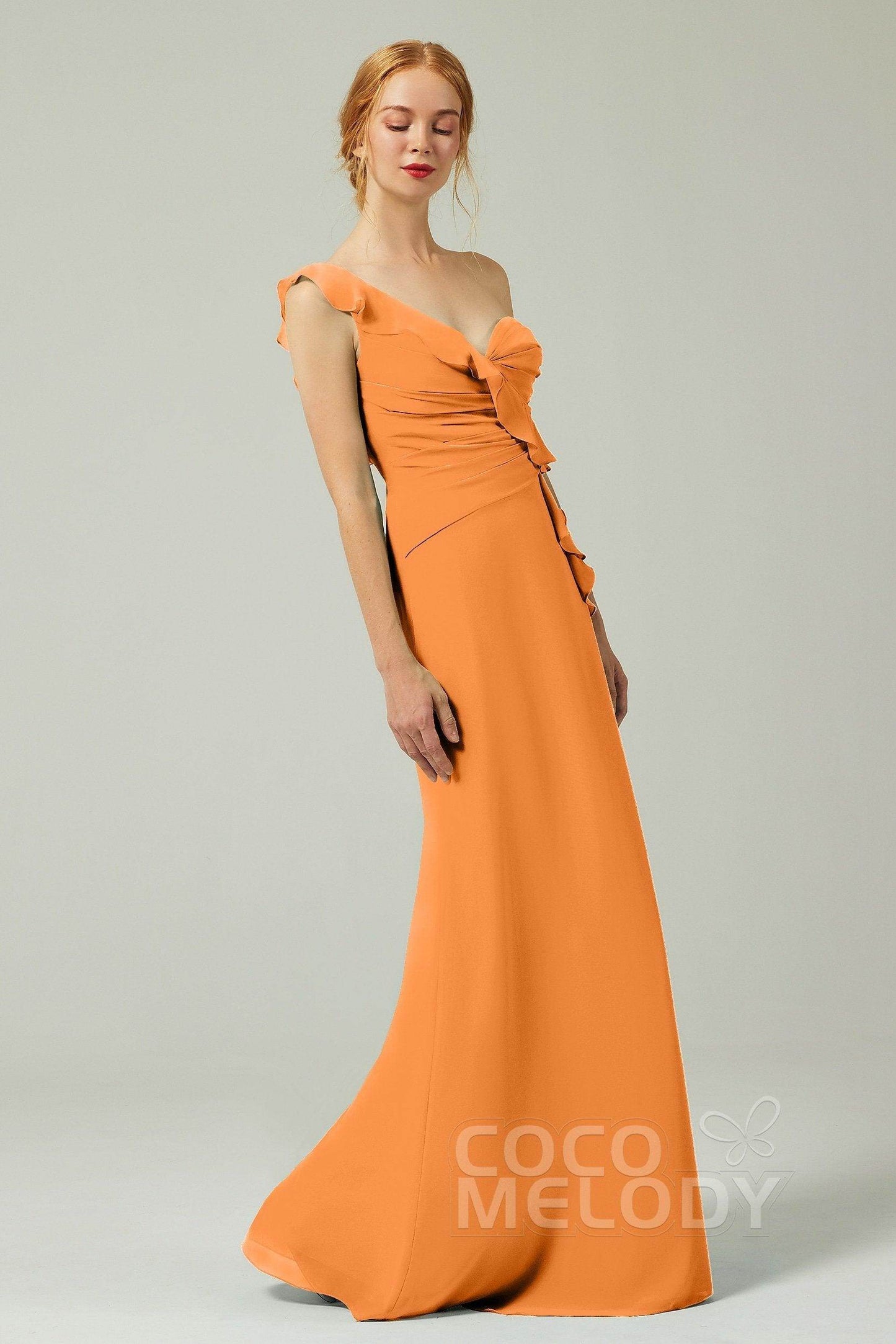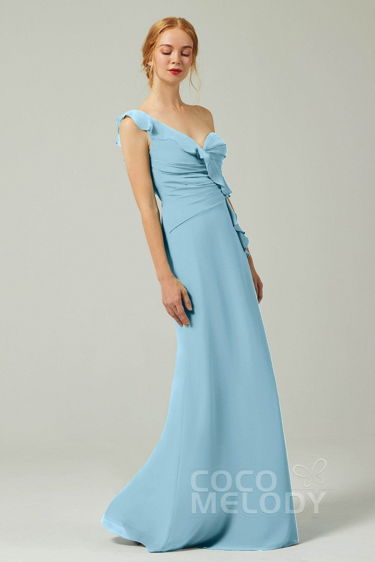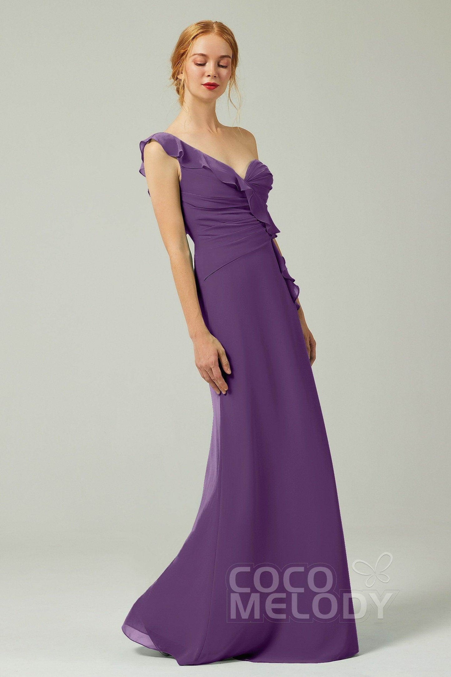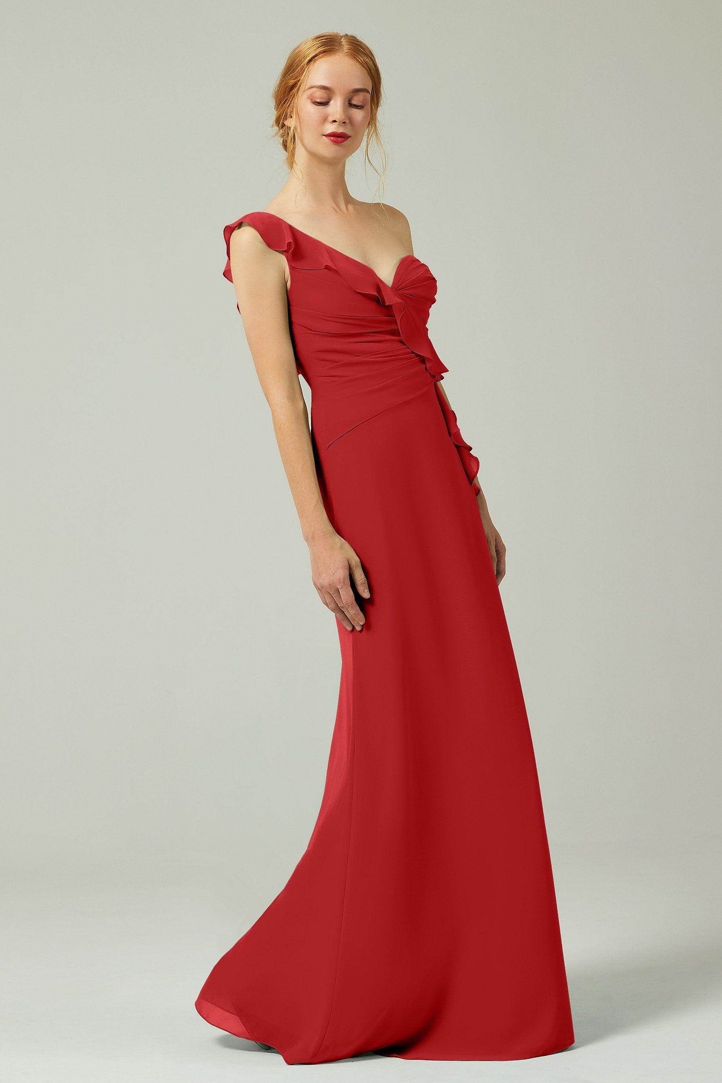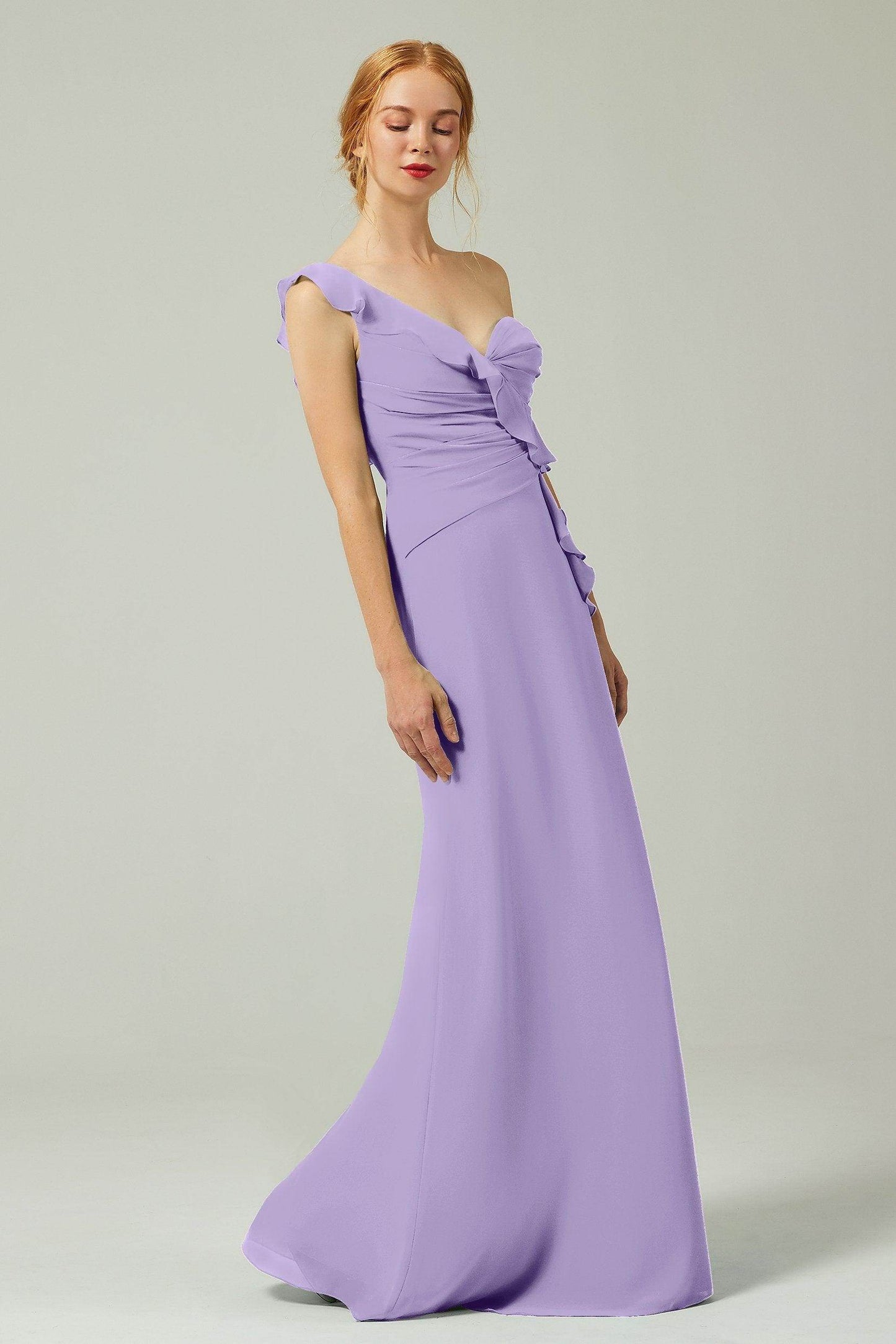 This stunning bridesmaid gown features lightweight chiffon that flows elegantly to the floor in a chic sheath-column silhouette. The one-shoulder design adds a modern touch, while delicate pleating and ruffles enhance its charm. With a hidden zipper for easy wear, this dress is perfect for any formal occasion!
