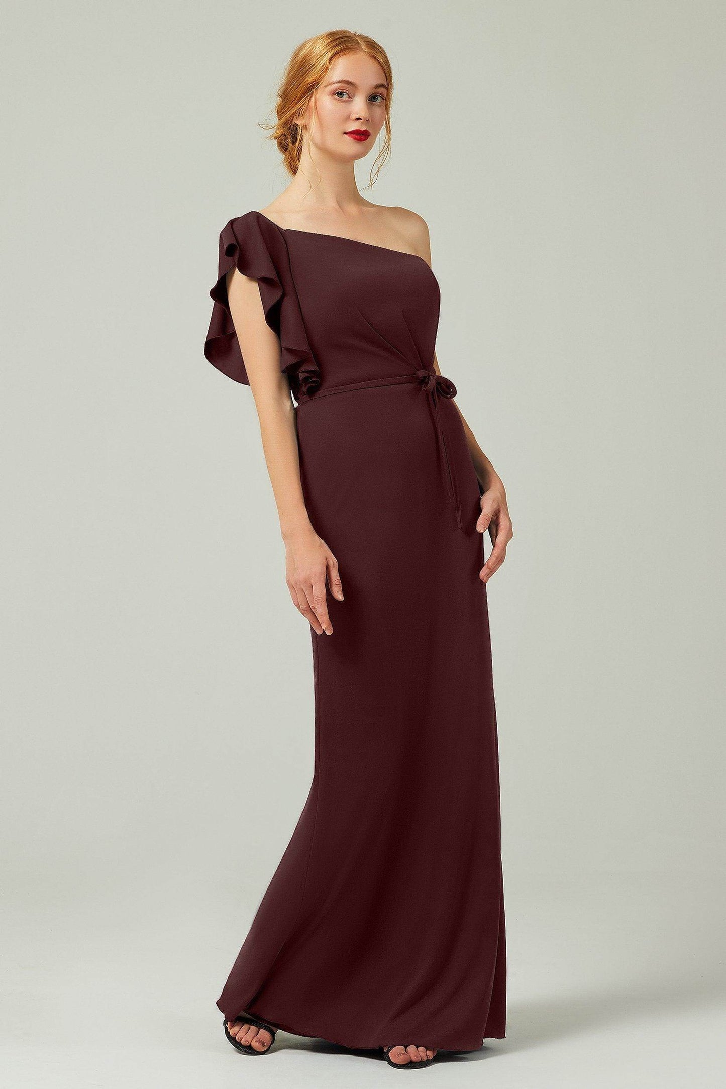 This exquisite bridesmaid dress features a convenient zipper back and elegant sashes with ruffles. Made from soft chiffon, it flows to the floor. The one-shoulder neckline and sheath silhouette beautifully highlight the figure, ensuring every bridesmaid stands out on the special day.