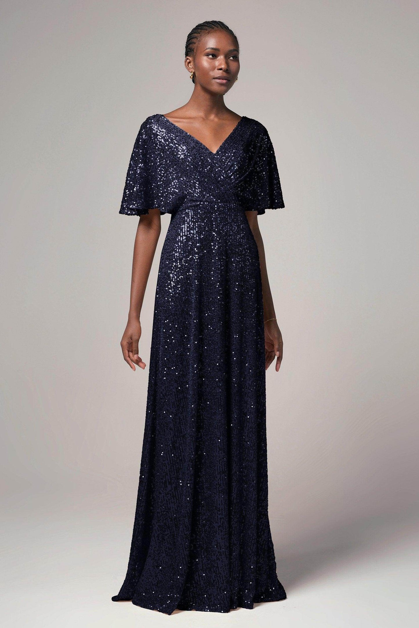 This bridesmaid dress offers unmatched elegance and luxury. Sequined fabric adds dazzling shine to the floor-length skirt. The deep V-neck and sheath-column cut enhance a graceful silhouette, while half sleeves provide comfort. A back zipper ensures easy dressing, perfect for formal events.