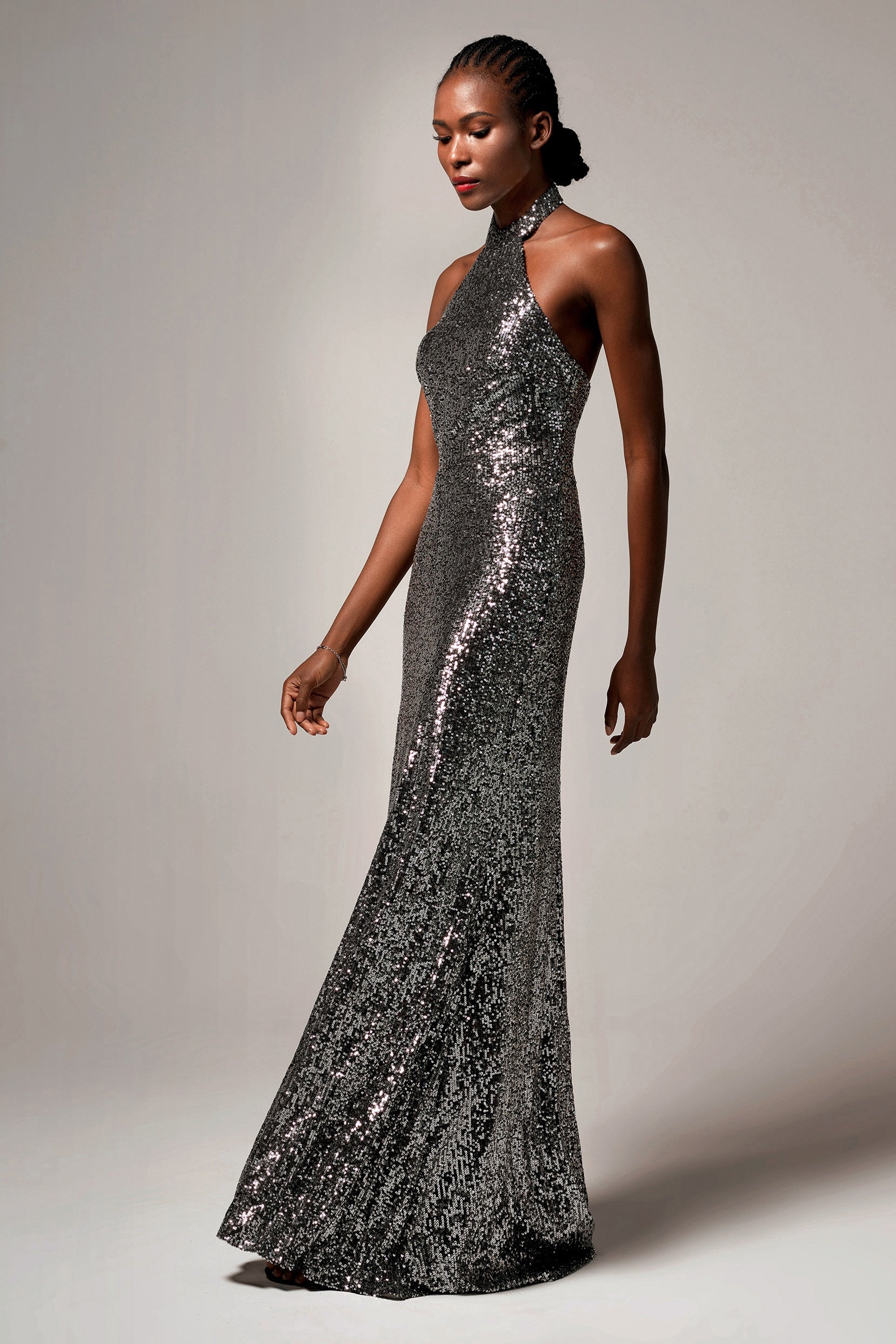 This bridesmaid dress dazzles with sequined fabric and a floor-length skirt. The elegant halter neckline and fitted sheath silhouette highlight your curves, while the sleeveless design adds freshness. A back zipper ensures easy wear, making it perfect for formal occasions.