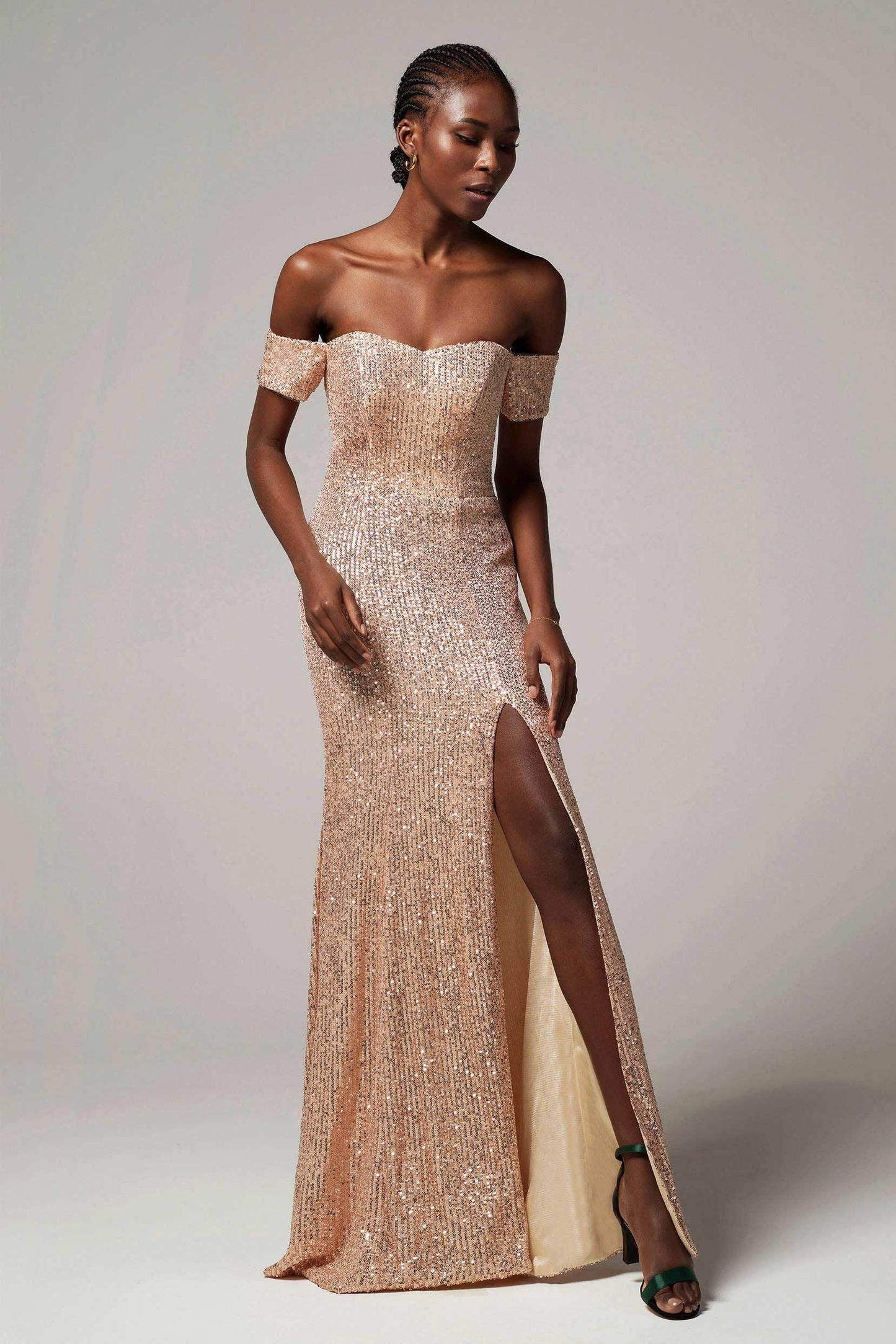 This bridesmaid dress blends modern luxury with elegance. Sequined fabric adds a dazzling shine, while the off-the-shoulder design and fitted column silhouette enhance allure. Short sleeves and a hidden back zipper offer comfort, with a side slit adding a chic touch, perfect for formal events.