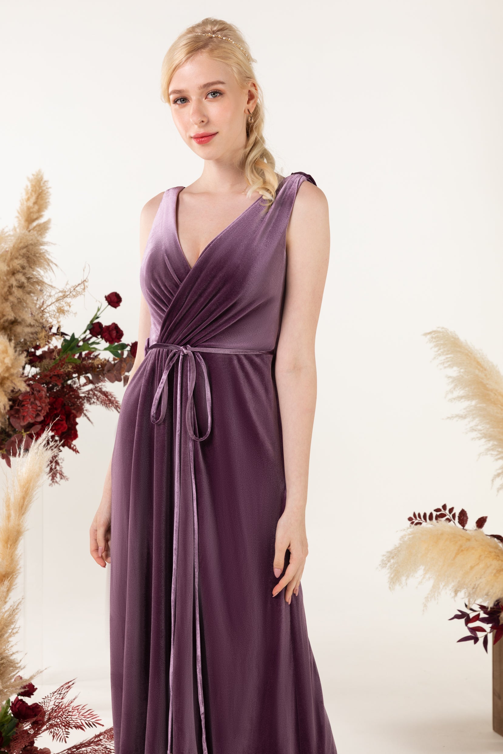 This velvet bridesmaid dress dazzles with a rich sheen and deep hues. The V-neck and sleeveless design highlight elegance, while the fitted column silhouette and floor-length skirt offer a graceful, refined look. Hidden back zipper and ruched waist add sophistication, making it perfect for any formal event.