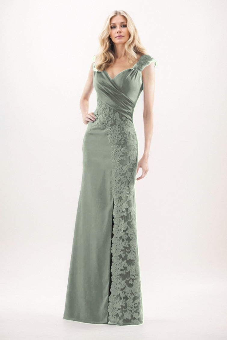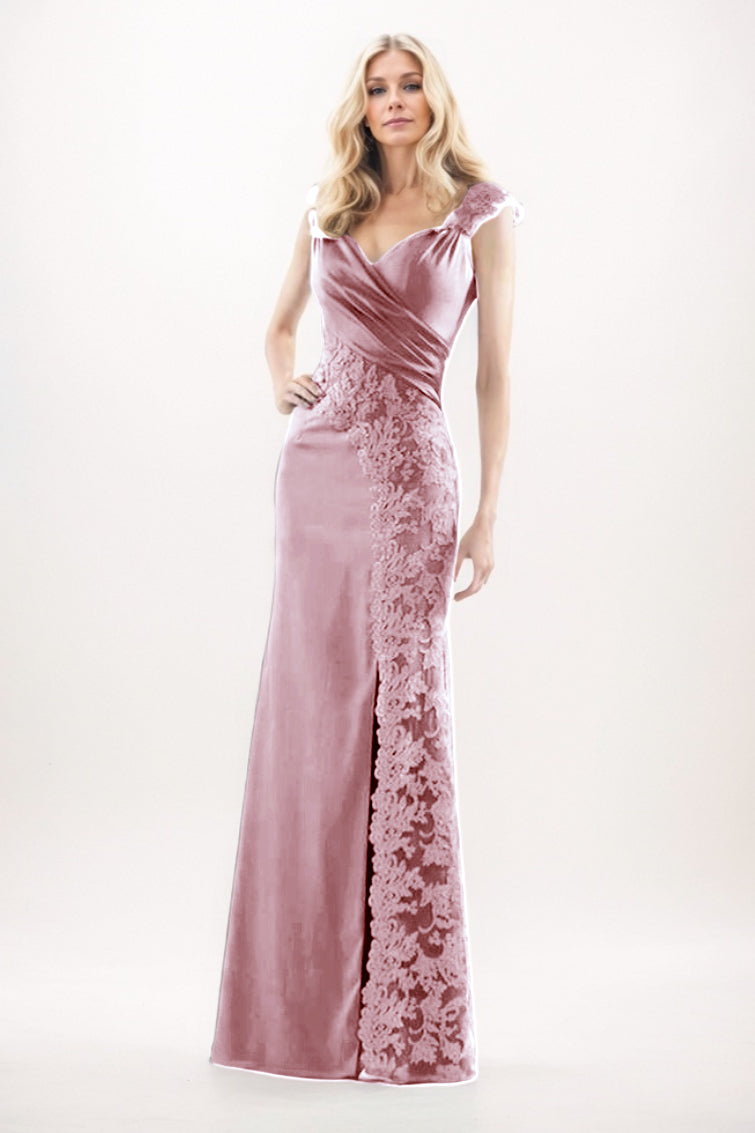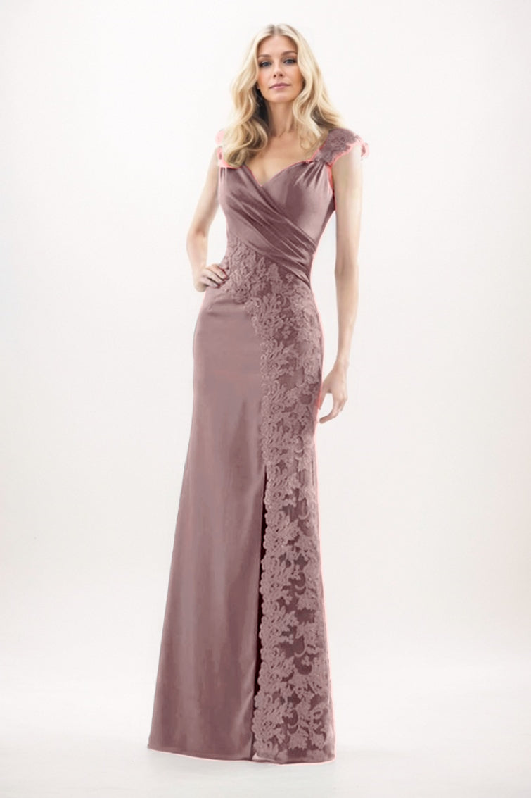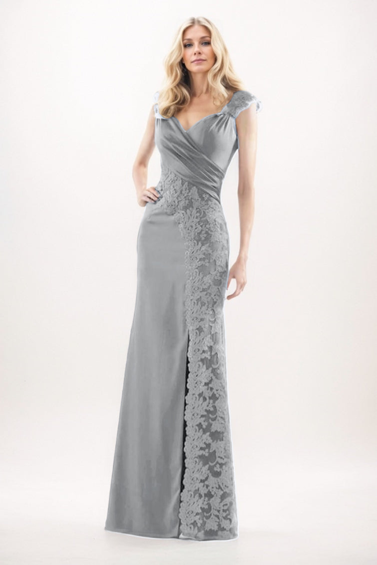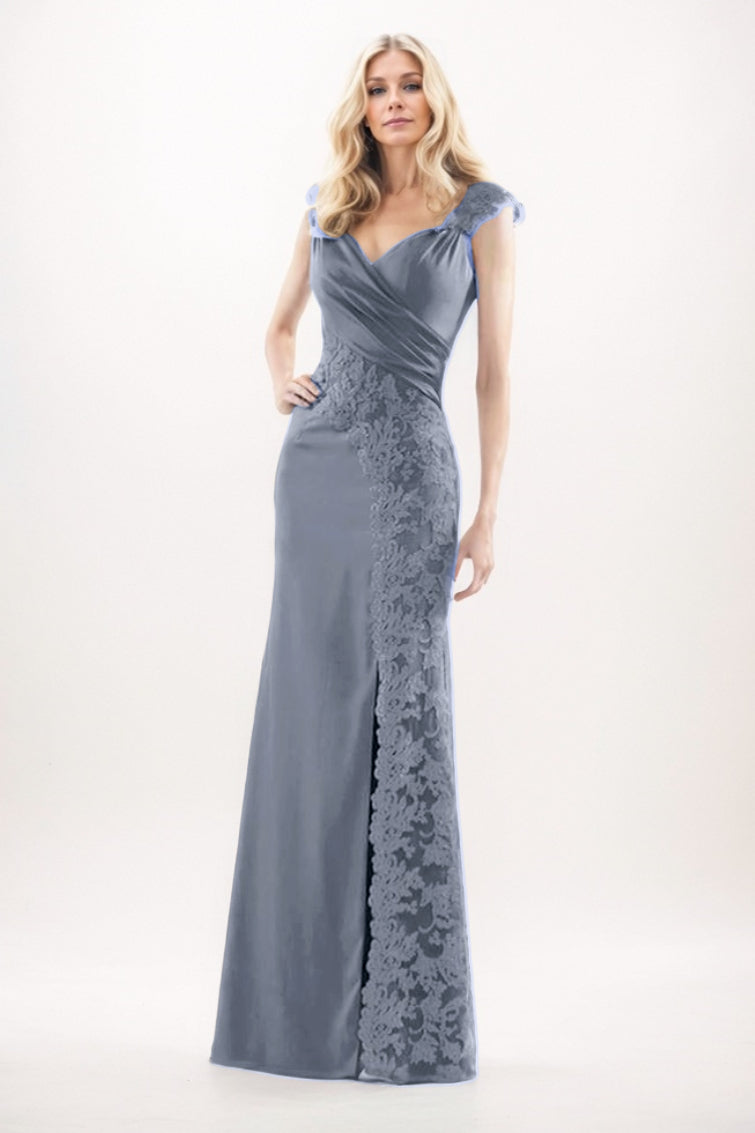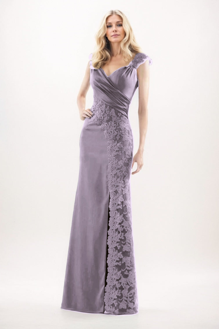 Elegance in every stitch, this Chiffon sheath-column dress with a V-neck and cap sleeves, featuring a sleek split, perfect for Mother of the Bride at any event.