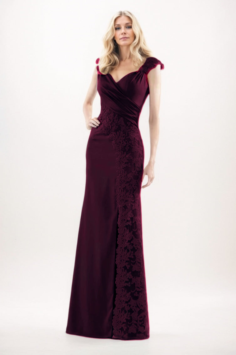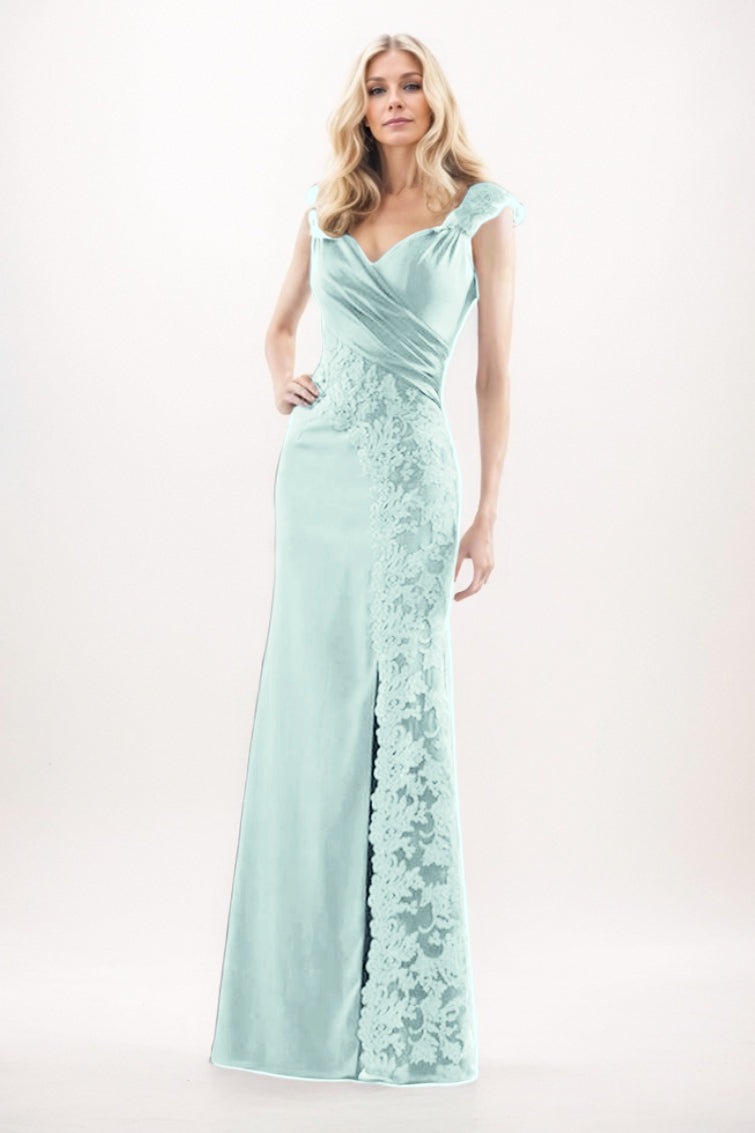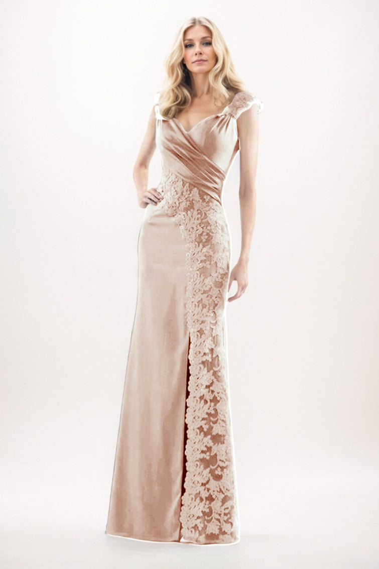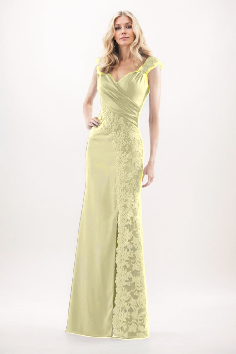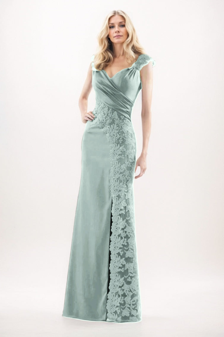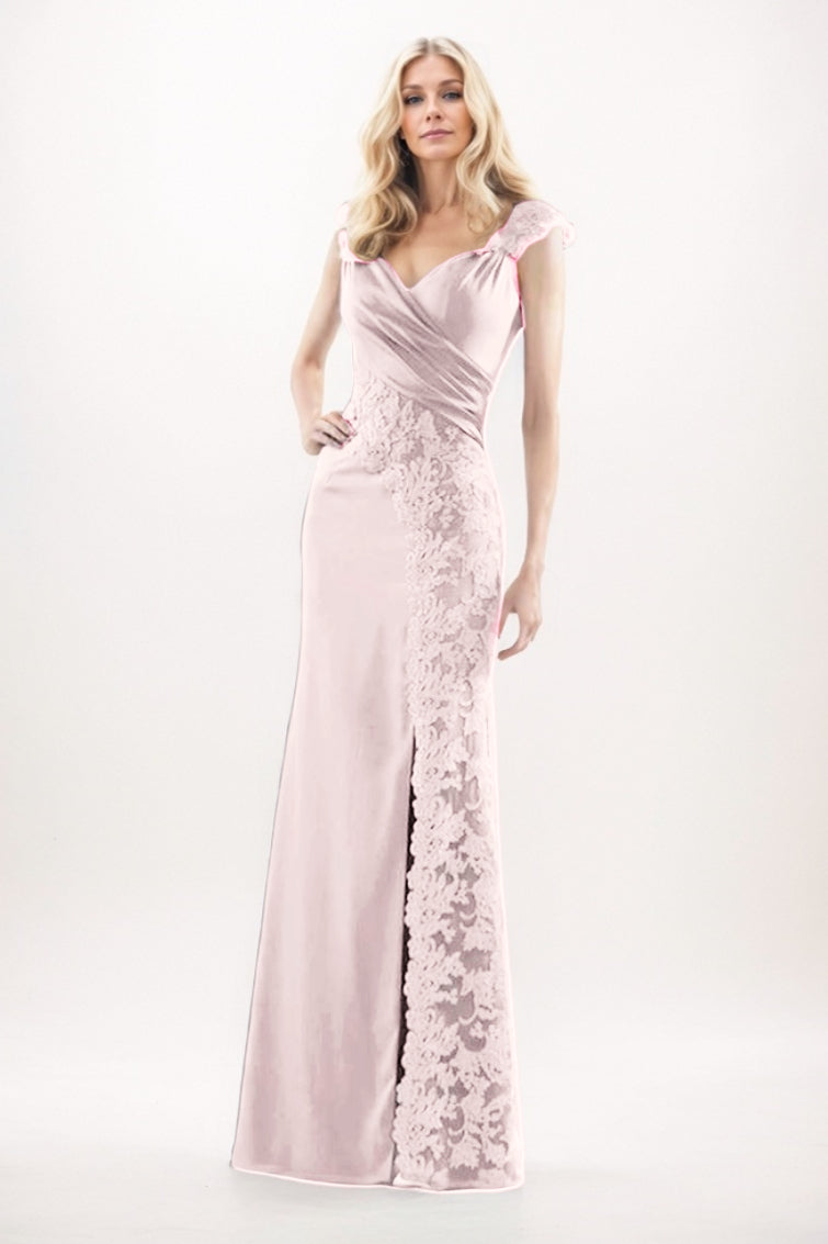 Elegance in every stitch, this Chiffon sheath-column dress with a V-neck and cap sleeves, featuring a sleek split, perfect for Mother of the Bride at any event.