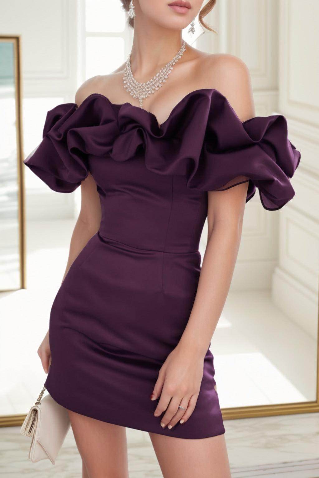 This strapless sheath-column dress boasts puff sleeves and a natural waist, crafted from luxurious satin with elegant ruching details. Completed with a zipper at the back and a short-mini length, it exudes modern sophistication, perfect for making a stylish statement at special occasions.