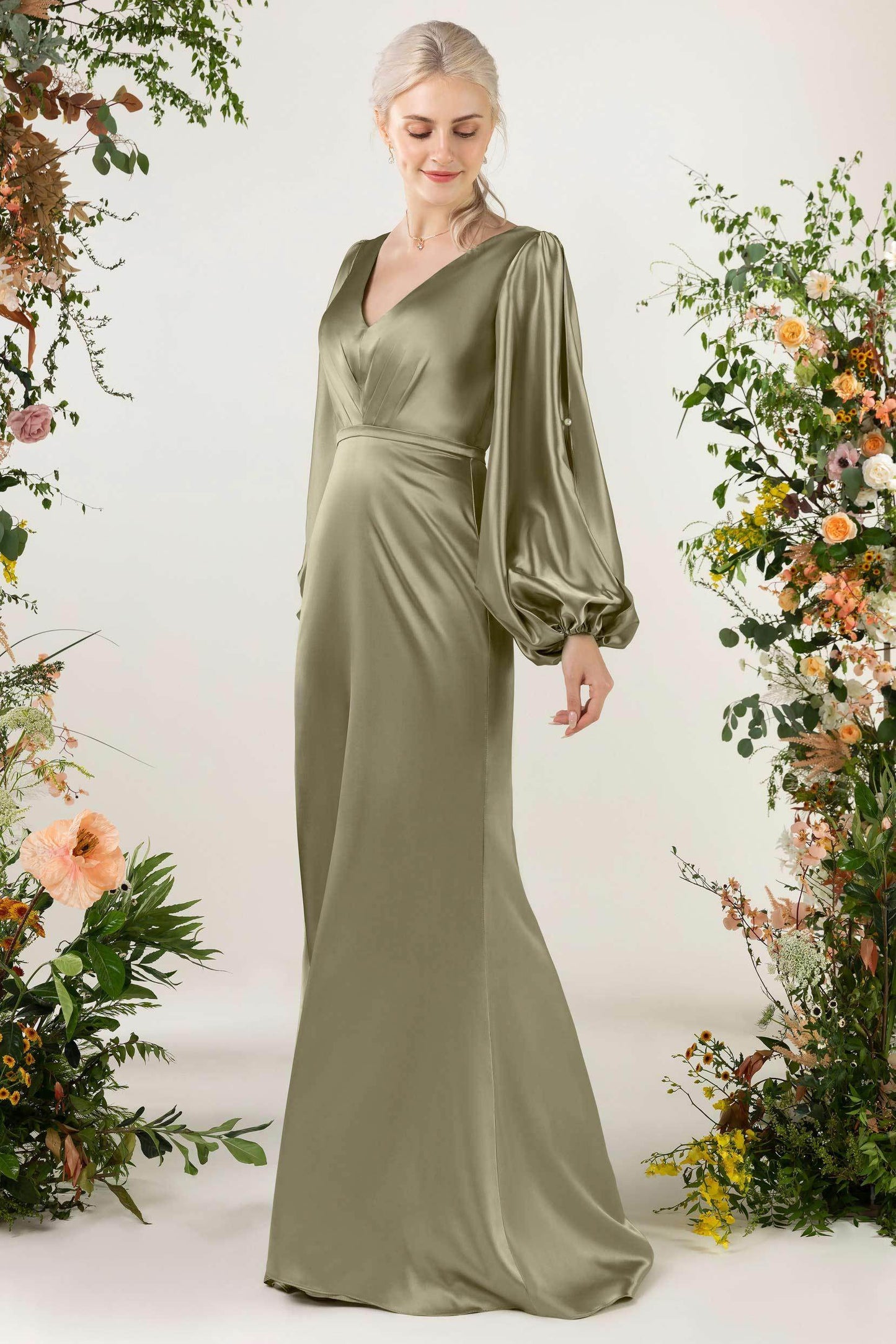 Sheath-Column V-Neck Natural Sweep-Brush Train Acetate Satin Sleeveless Side Zipper Bridesmaid Dress with Pleating Split CB0499CR